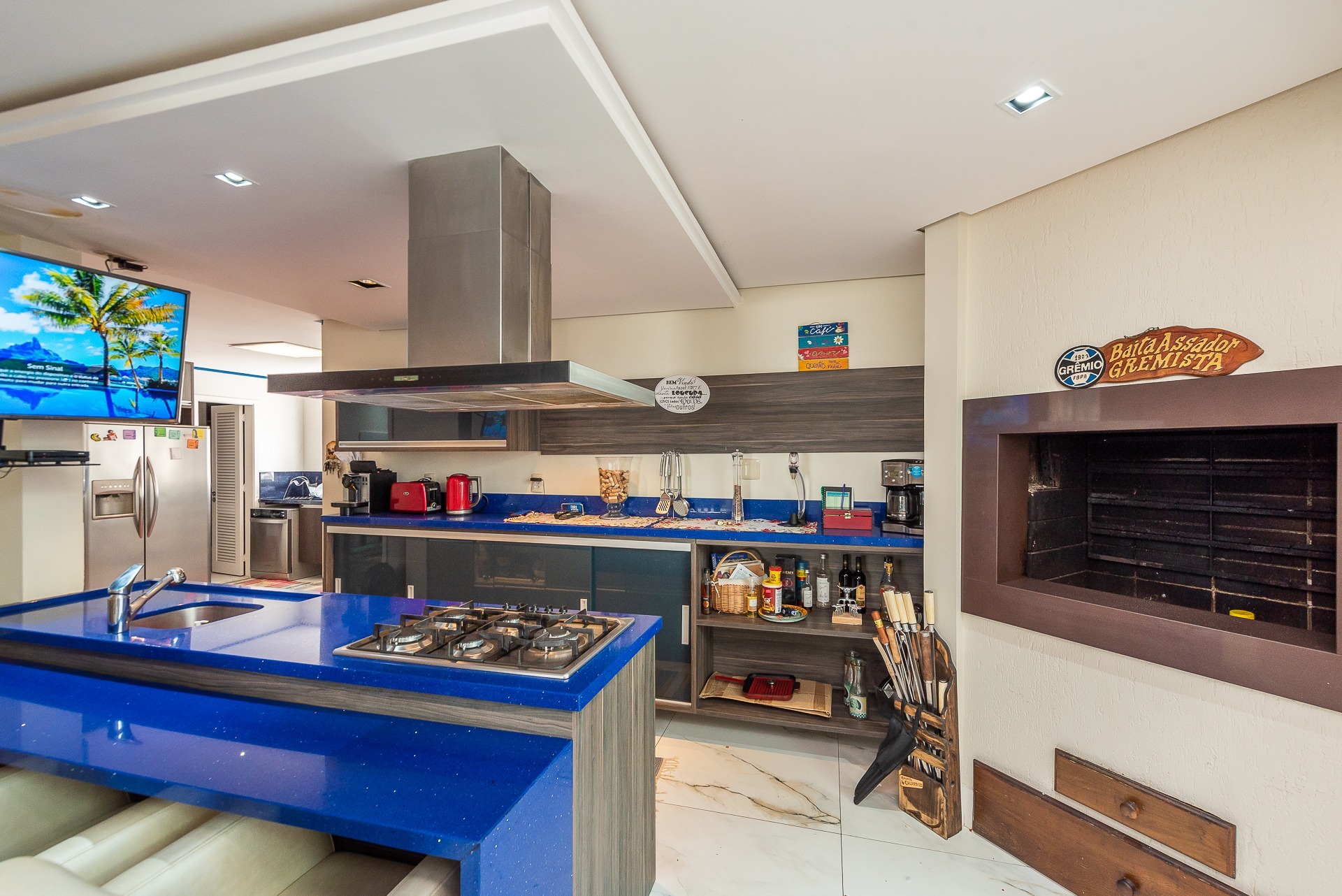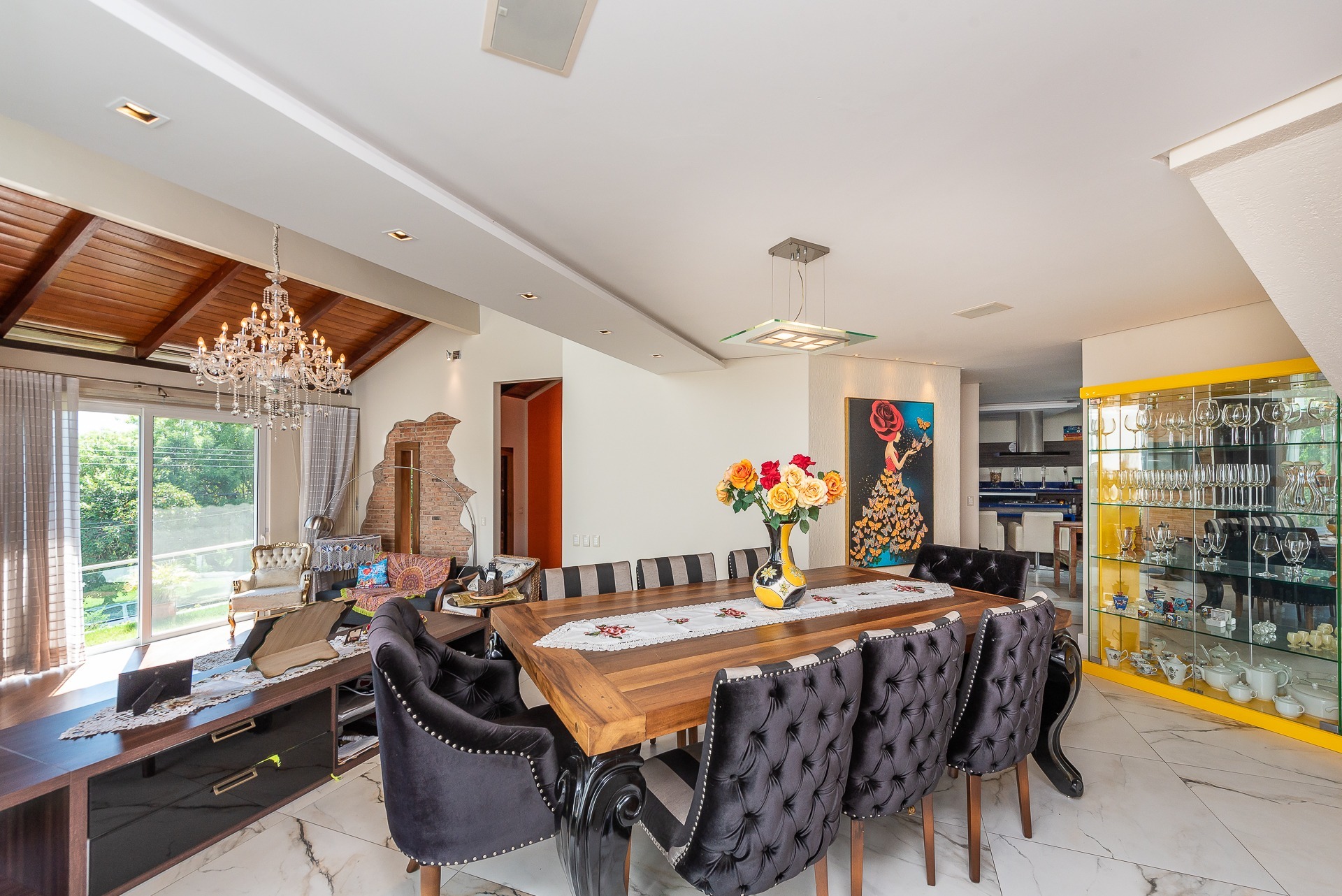 Amplo living para 3 ambientes com lareira, lavabo, estar social, estar intimo para curtir a Netflix com a familia, sala de jantar com bancada Gourmet, churrasqueira, ampla copa-cozinha planejada, área de serviço com dependência completa, 4 vagas de garagem, mais um depósito.