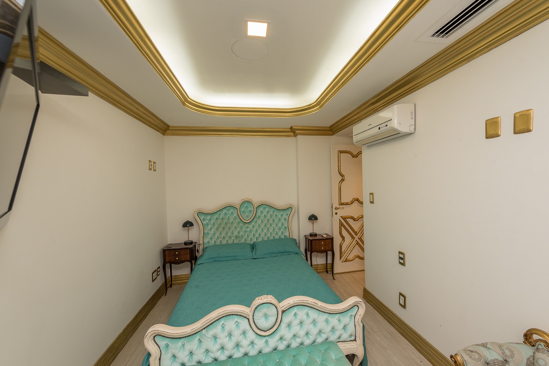 Apartamento para alugar mobiliado com 4 dormitórios, sendo 2 suítes, 179m de área privativa, living com ar condicionado, sacada fechada e ampla com churrasqueira, escrivaninha, cômodas, ventiladores de teto e cortinas, banheiro social com armários, cozinha completa com armários, fogão, geladeira, micro-ondas e coifa e área de serviço.