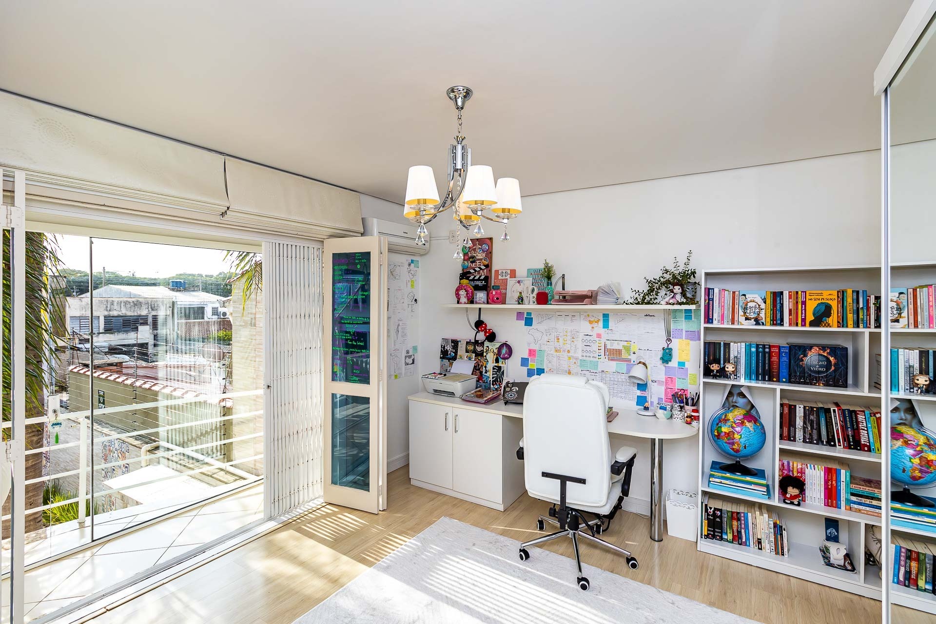 Casa com 4 níveis, divididos em sala de estar, sala de jantar, lavabo, cozinha, nos níveis superiores, encontramos um estar íntimo com varanda e vista para a piscina, 3 dorms, sendo 1 suíte, além de um escritório no último piso.