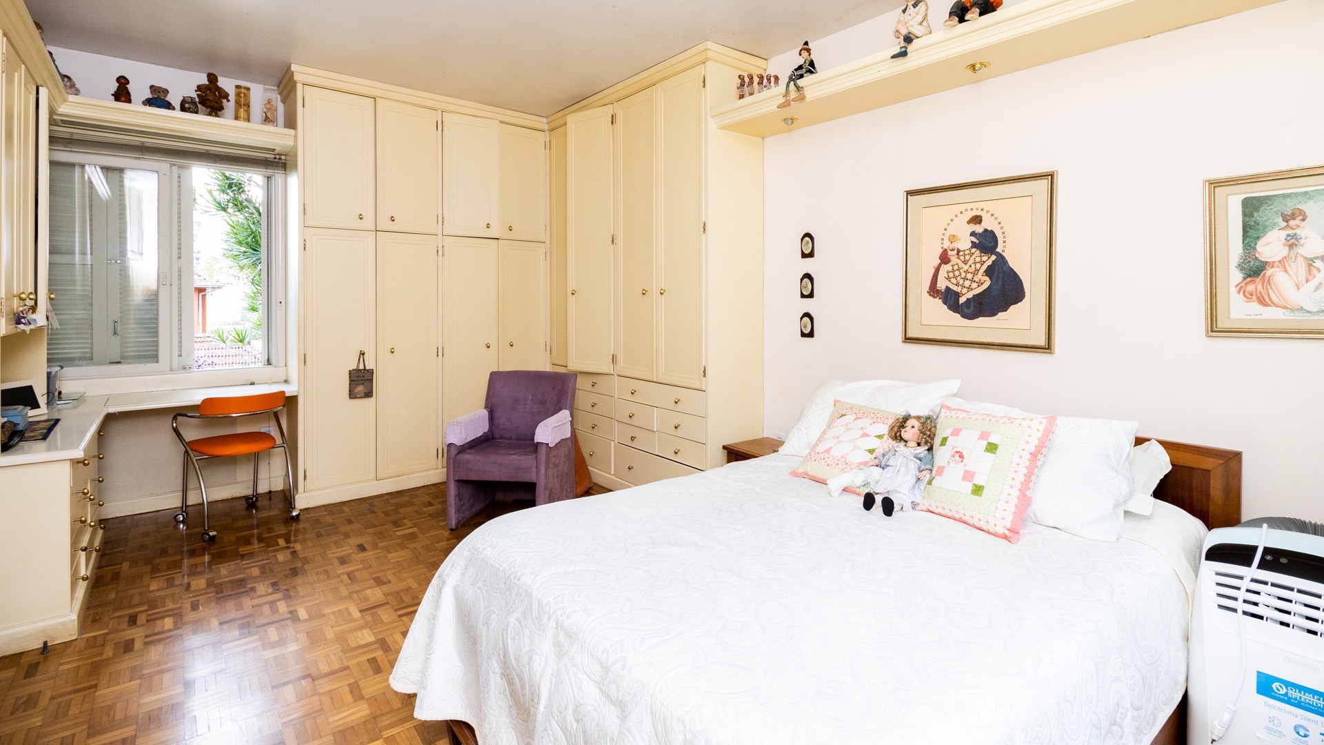 Apartamento para alugar mobiliado com 4 dormitórios, sendo 2 suítes, 179m de área privativa, living com ar condicionado, sacada fechada e ampla com churrasqueira, escrivaninha, cômodas, ventiladores de teto e cortinas, banheiro social com armários, cozinha completa com armários, fogão, geladeira, micro-ondas e coifa e área de serviço.