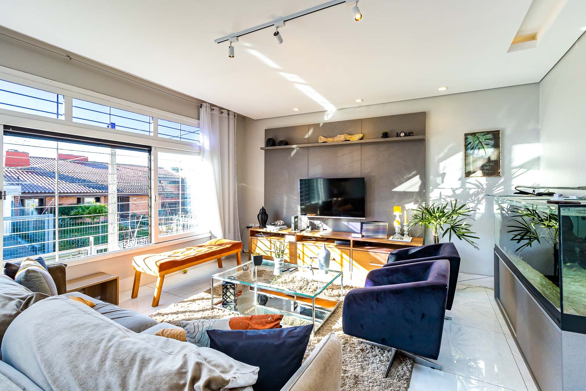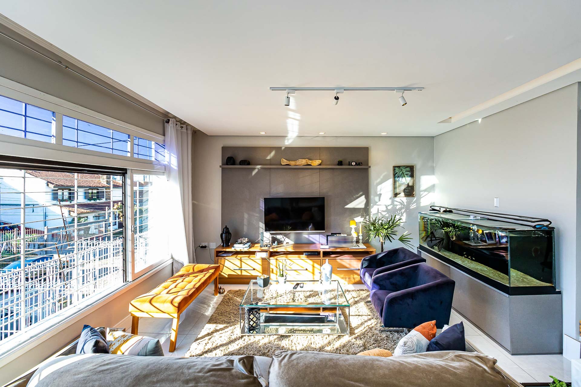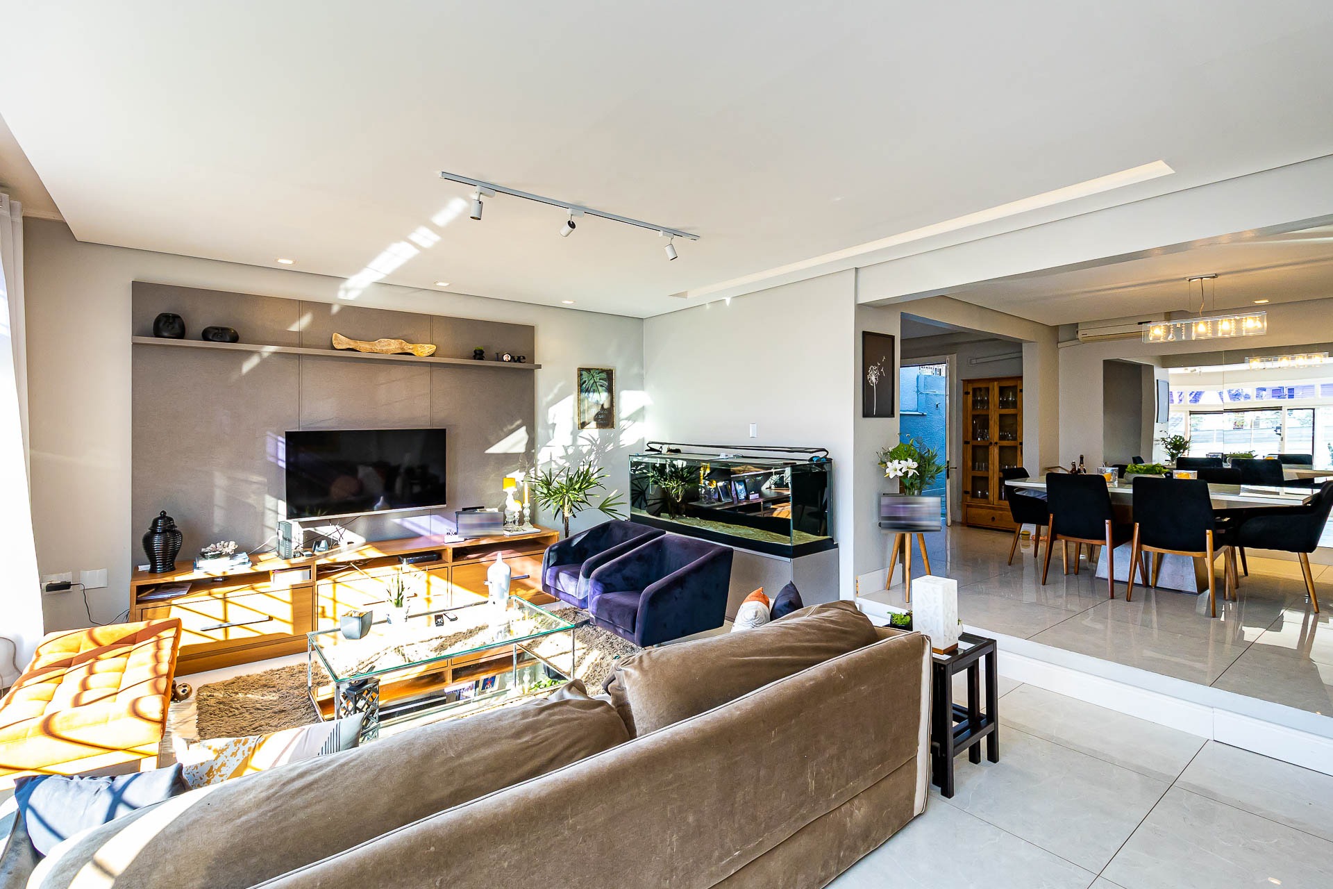 Pé-direito de 3m e esquadrias piso-teto que permitem ambientes abertos, arejados e com muita iluminação natural. Além disso, as esquadrias fazem com que o interior se integre com o espaço externo, tornando o living em uma grande varanda. A ideia é descomplicar a vida e favorecer o convívio.
