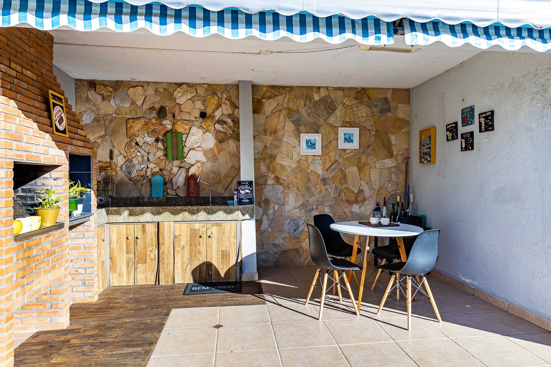 Na parte superior, um ambiente aconchegante com churrasqueira, sala de jantar, banheiro social, e um amplo terraço com piscina.