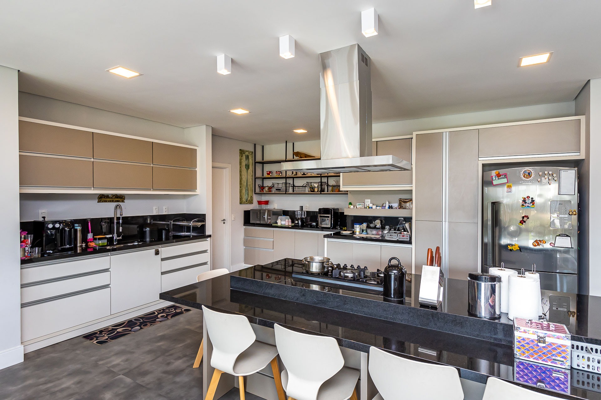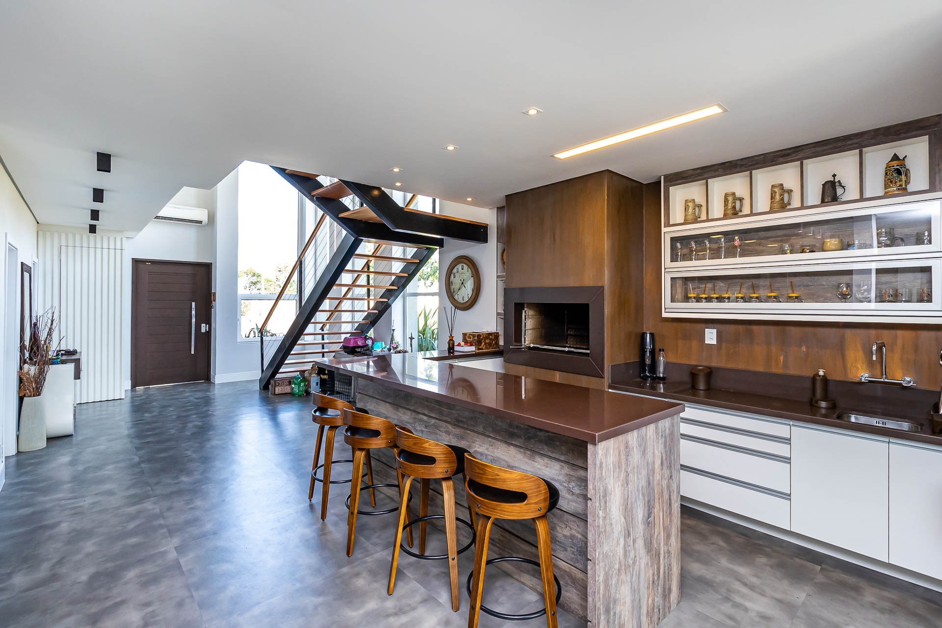 O piso inferior da casa inclui um living para até 4 ambientes, lavabo, elevador, copa-cozinha integrada a um espaço gourmet completo, ...