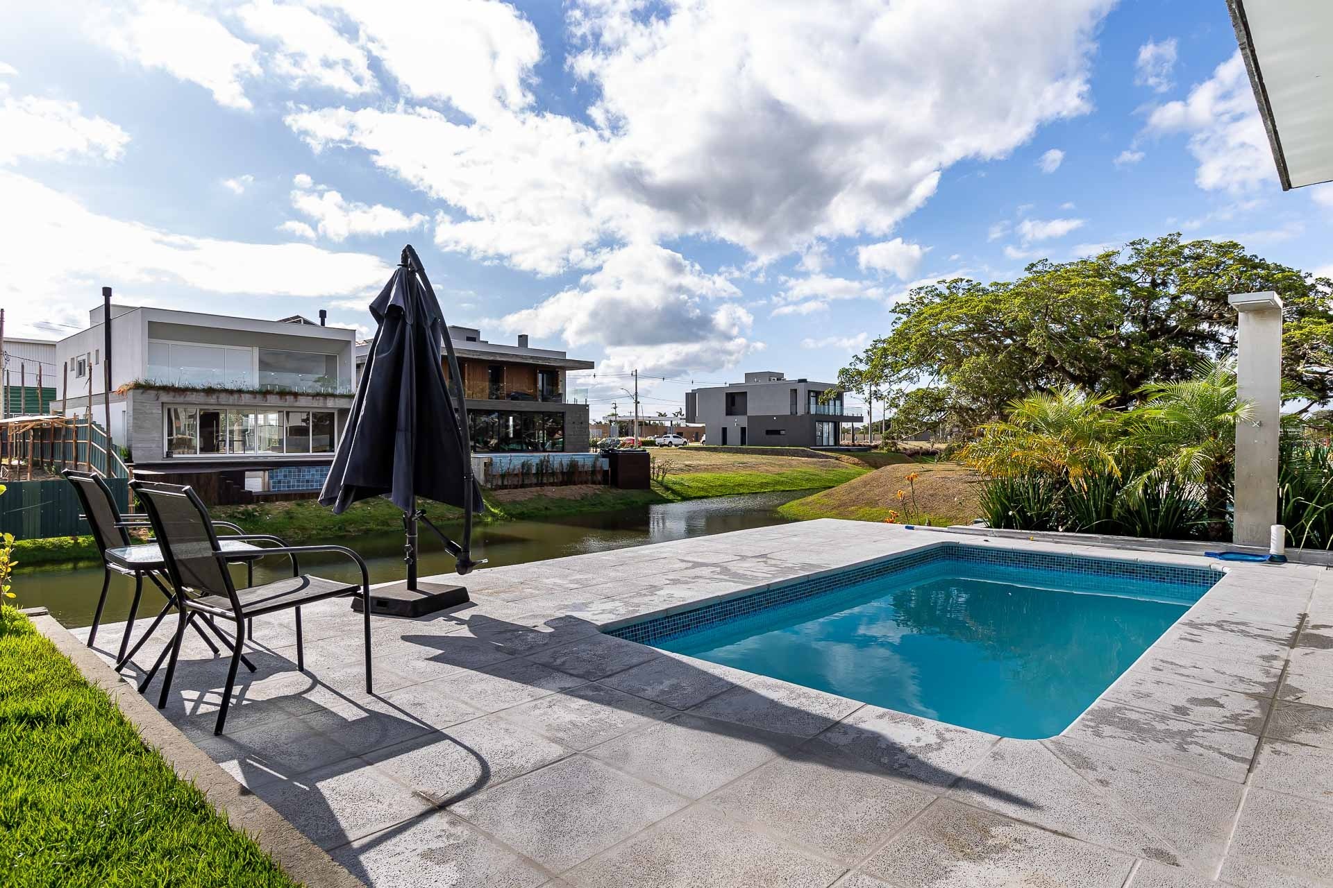 À venda no condomínio Ponta da Figueira, esta casa em lote molhado navegável inclui um deck privativo e piscina. Com 410 m² de área construída, a residência oferece 4 suítes, living para 3 ambientes, cozinha ampla com ilha, varanda espaçosa, piso aquecido, lavabo, jardim de inverno, duas churrasqueiras tipo parrilla, lareira e uma vista impressionante para o Rio Guaíba.