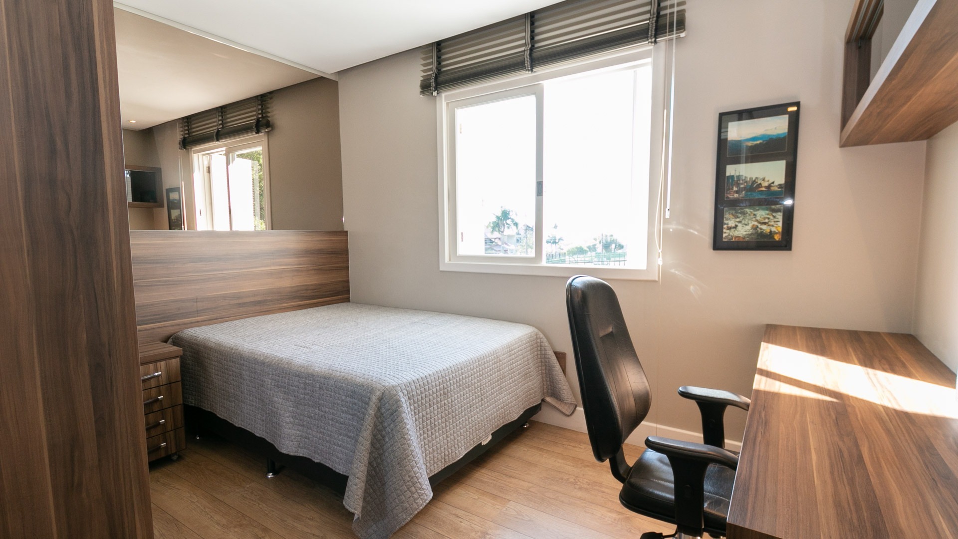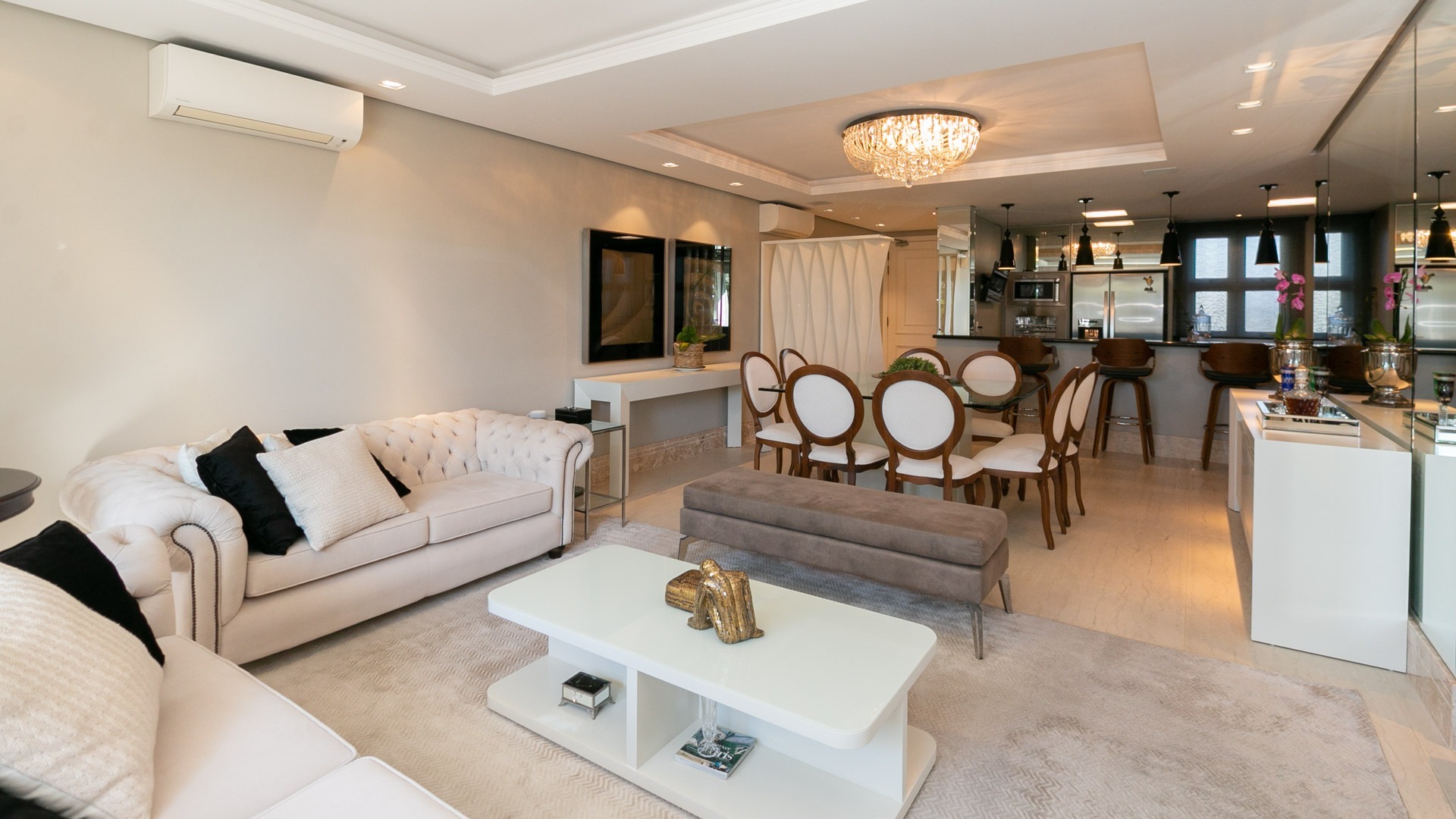 Apartamento para alugar mobiliado com 4 dormitórios, sendo 2 suítes, 179m de área privativa, living com ar condicionado, sacada fechada e ampla com churrasqueira, escrivaninha, cômodas, ventiladores de teto e cortinas, banheiro social com armários, cozinha completa com armários, fogão, geladeira, micro-ondas e coifa e área de serviço.