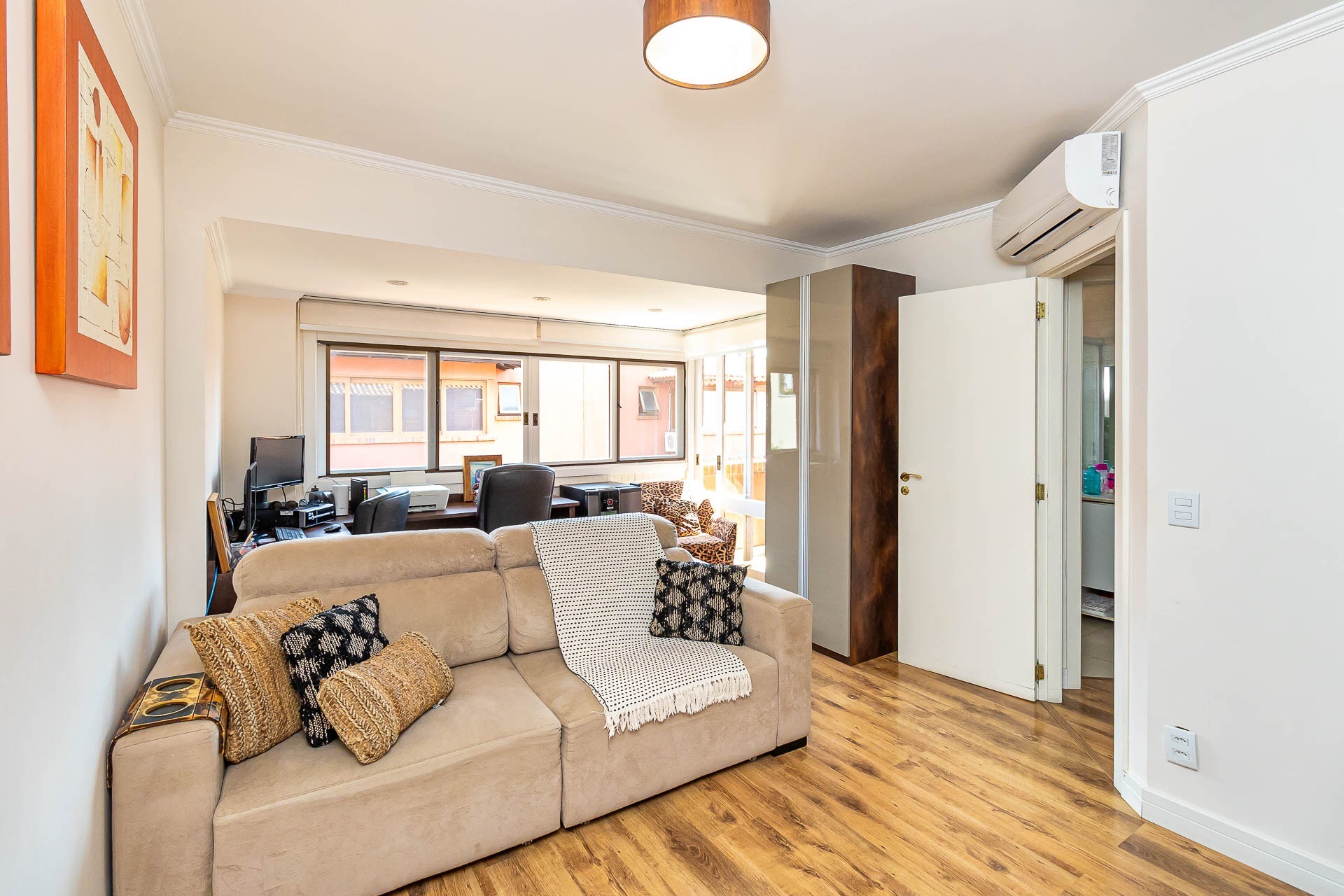 Apartamento semimobiliado gardem 3 dormitórios sendo 1 suíte, com 143m² de área privativa 1 vaga dupla. Living estendido com pátio integrado e espaço gourmet com churrasqueira, cozinha área se serviço com pátio. Ambiente com ótima iluminação e ventilação natural. Na área intima são 3 dormitórios sendo 1 suíte com gabinete, 2 dormitórios sendo 1 usado como home office e banheiro auxiliar. Prédio en...