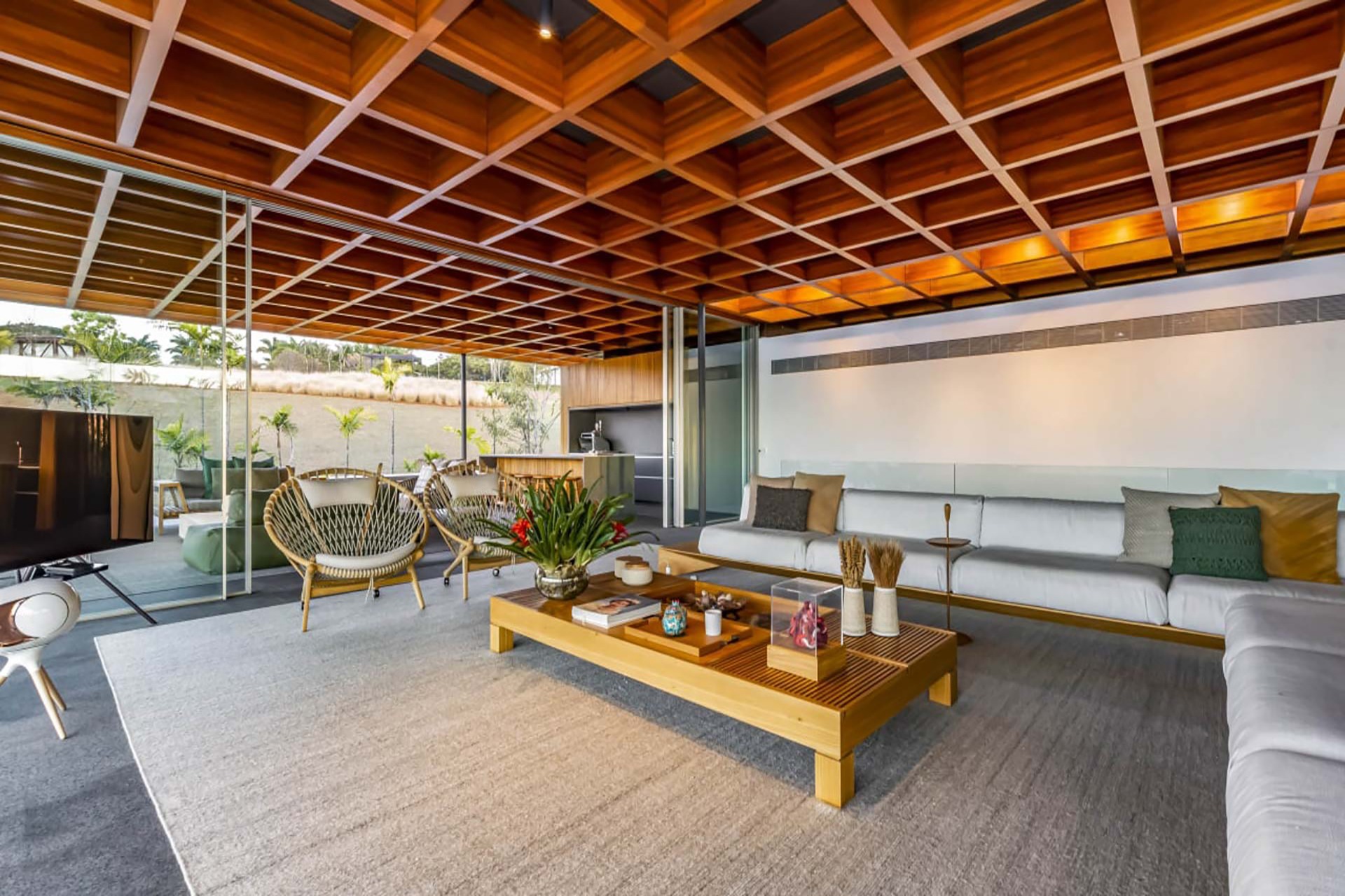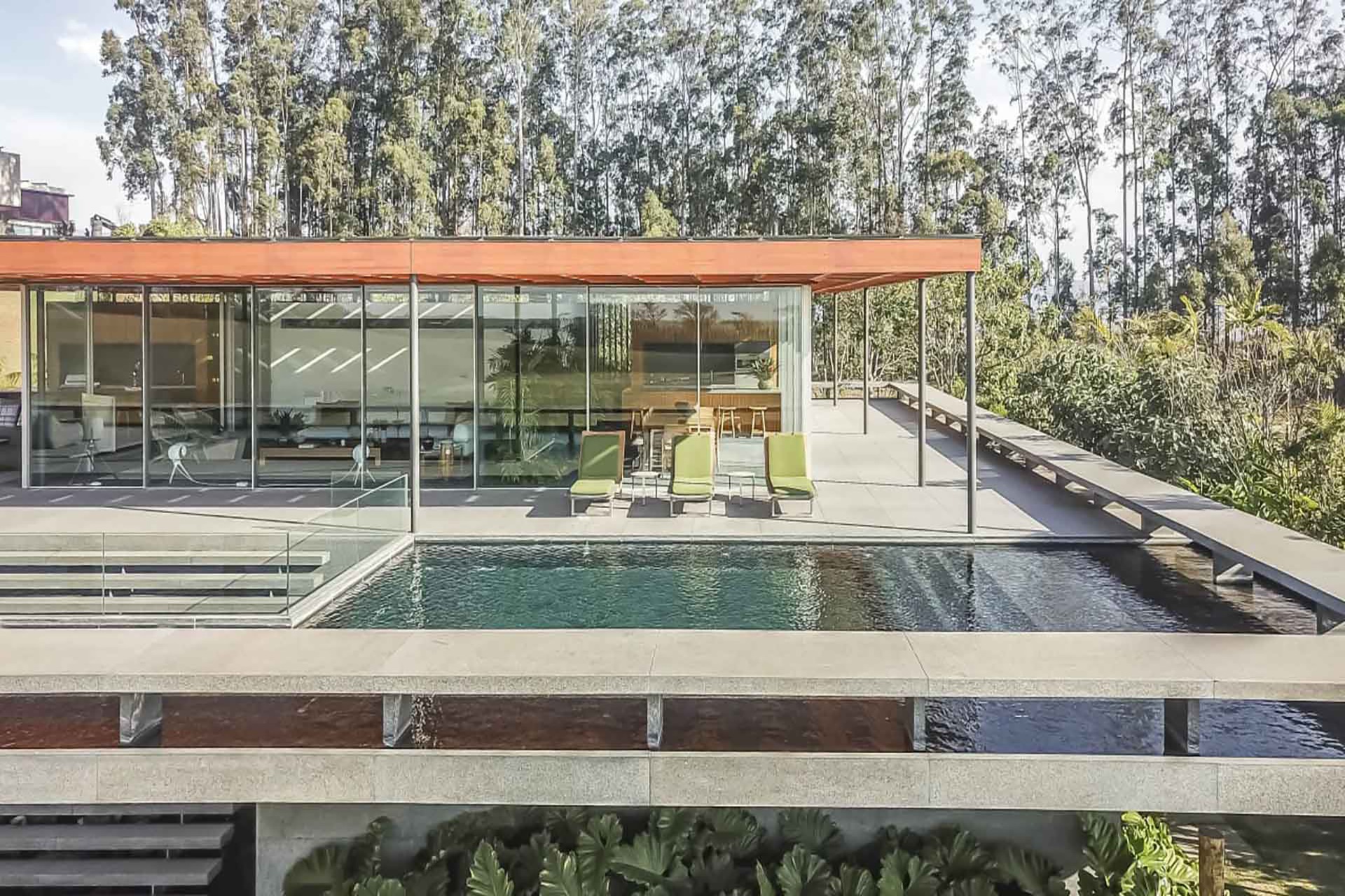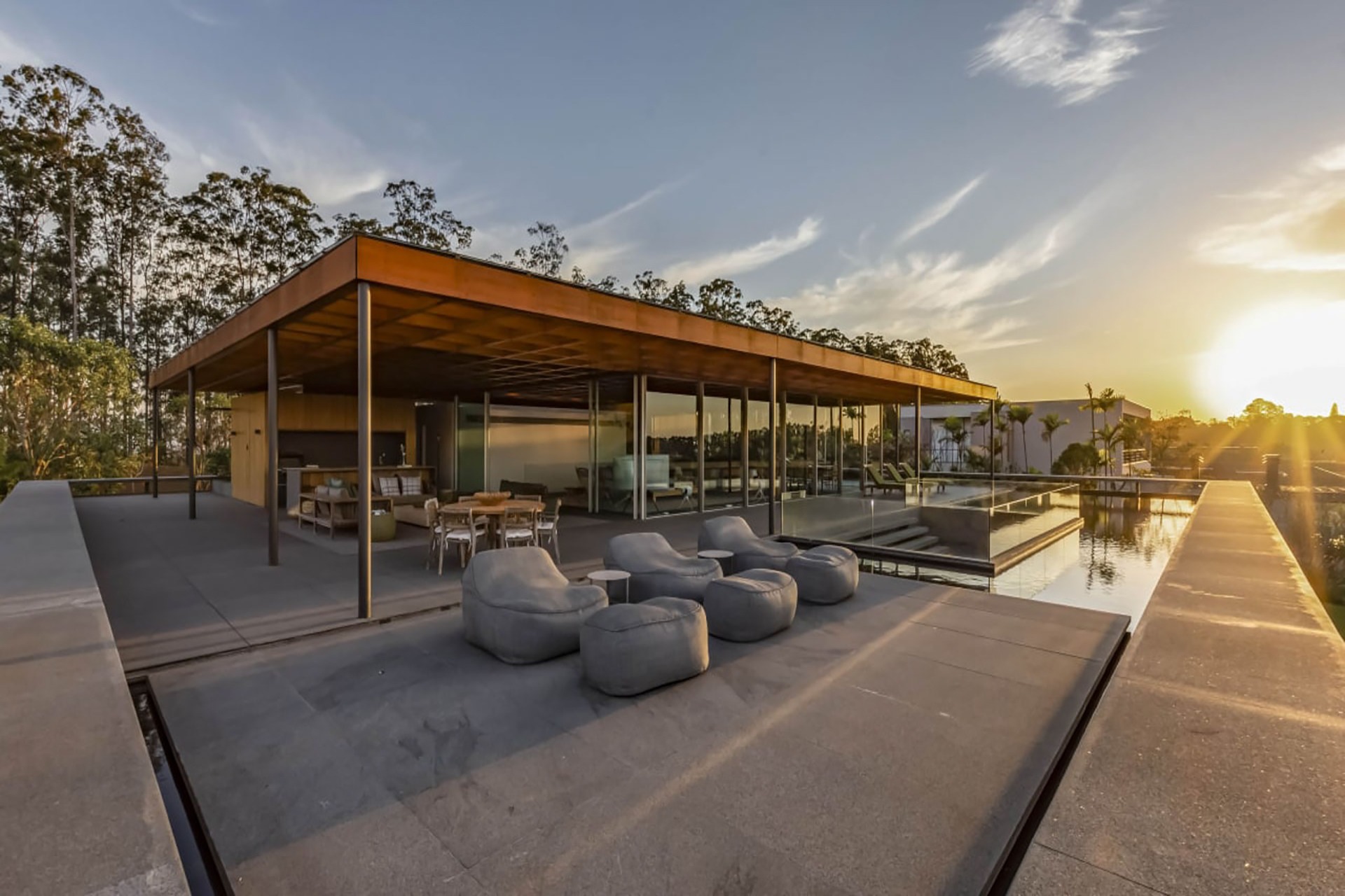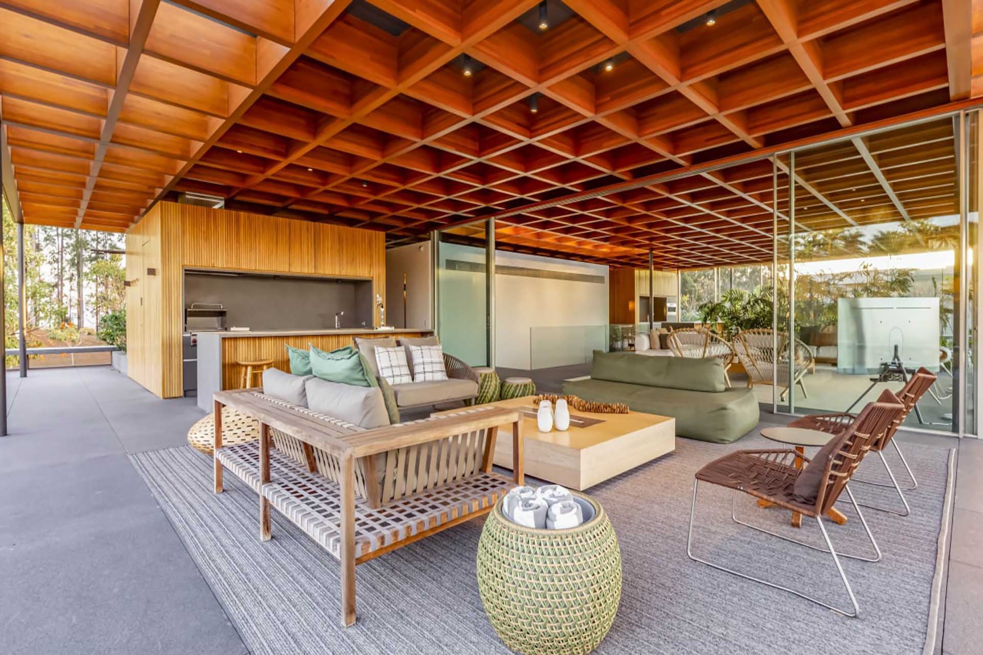 Estrutura de madeira com muitos vidros e integração com a natureza e entre os ambientes.