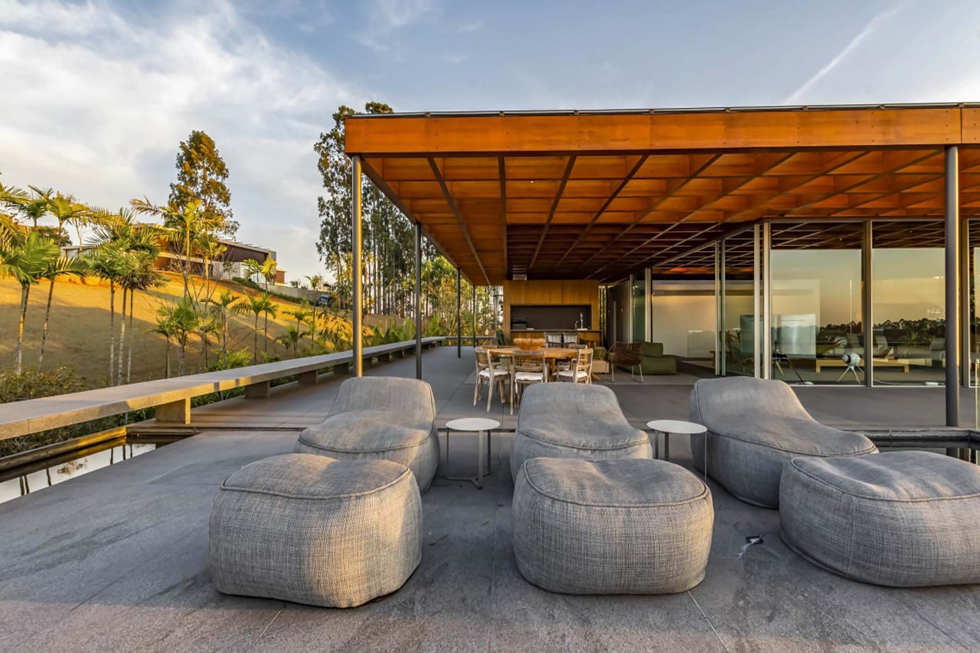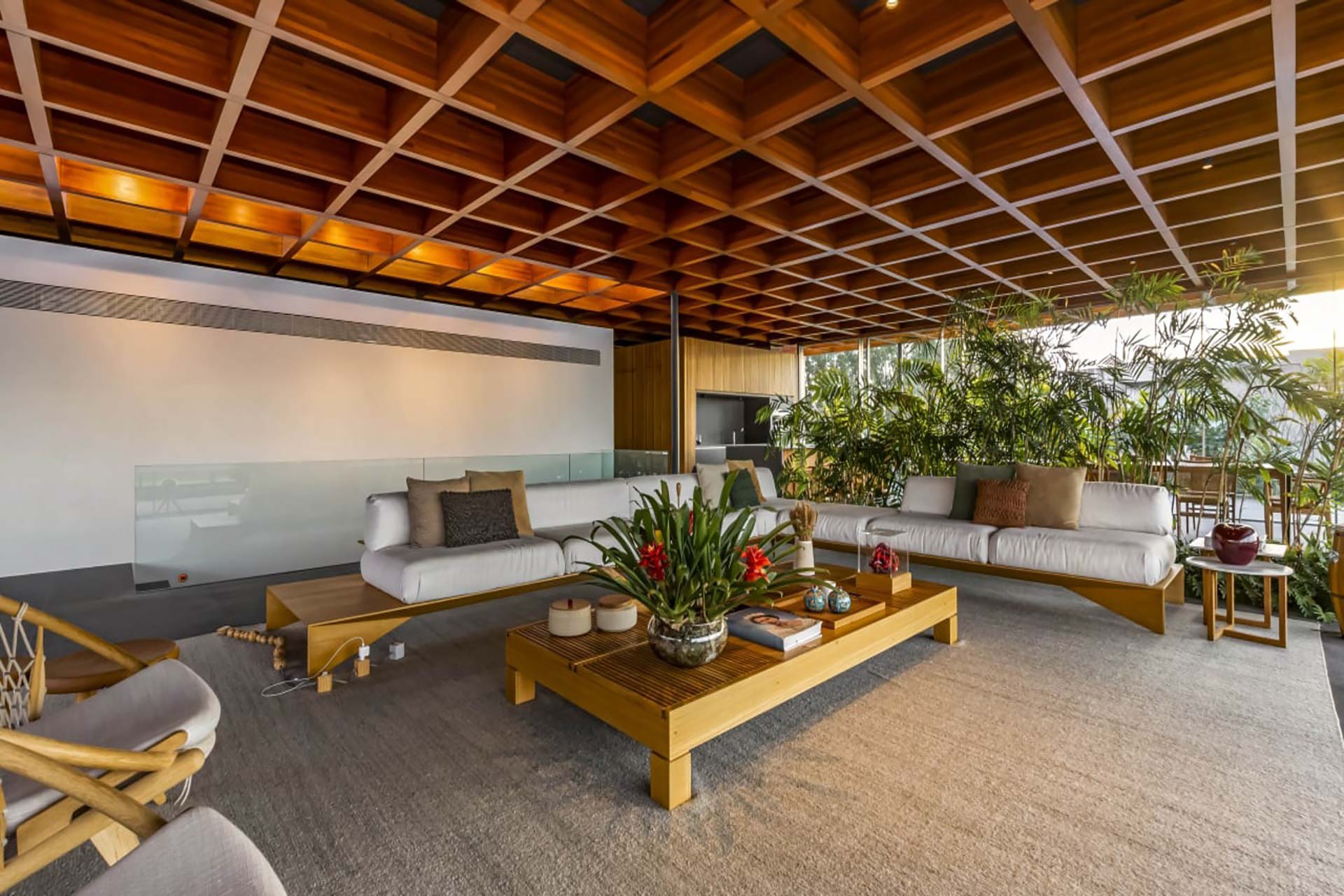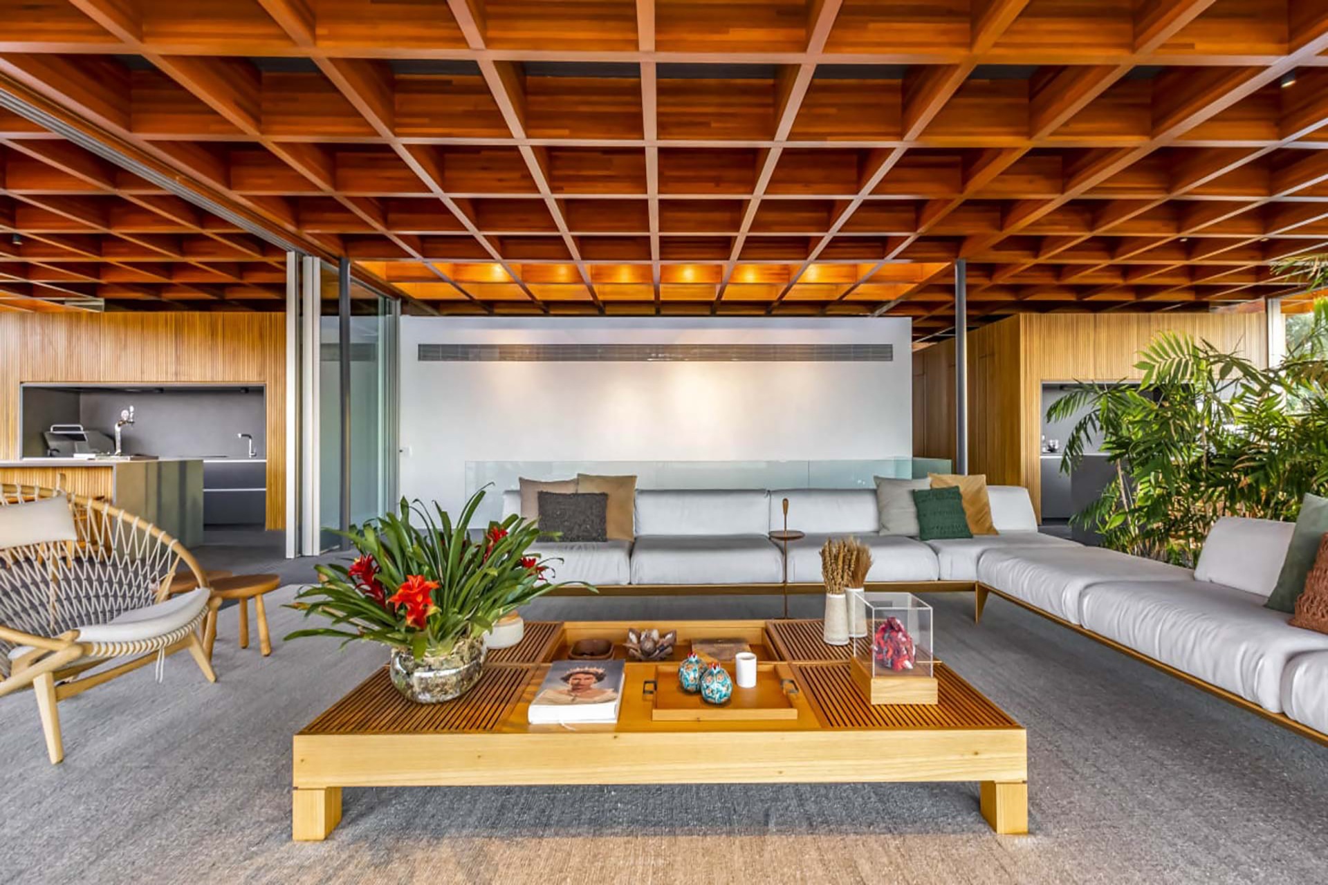 Estrutura de madeira com muitos vidros e integração com a natureza e entre os ambientes.