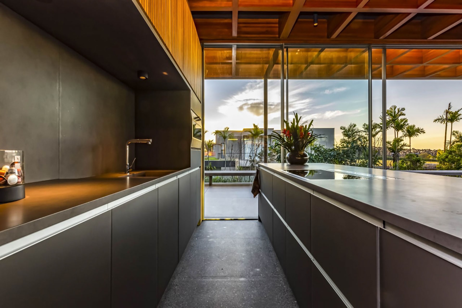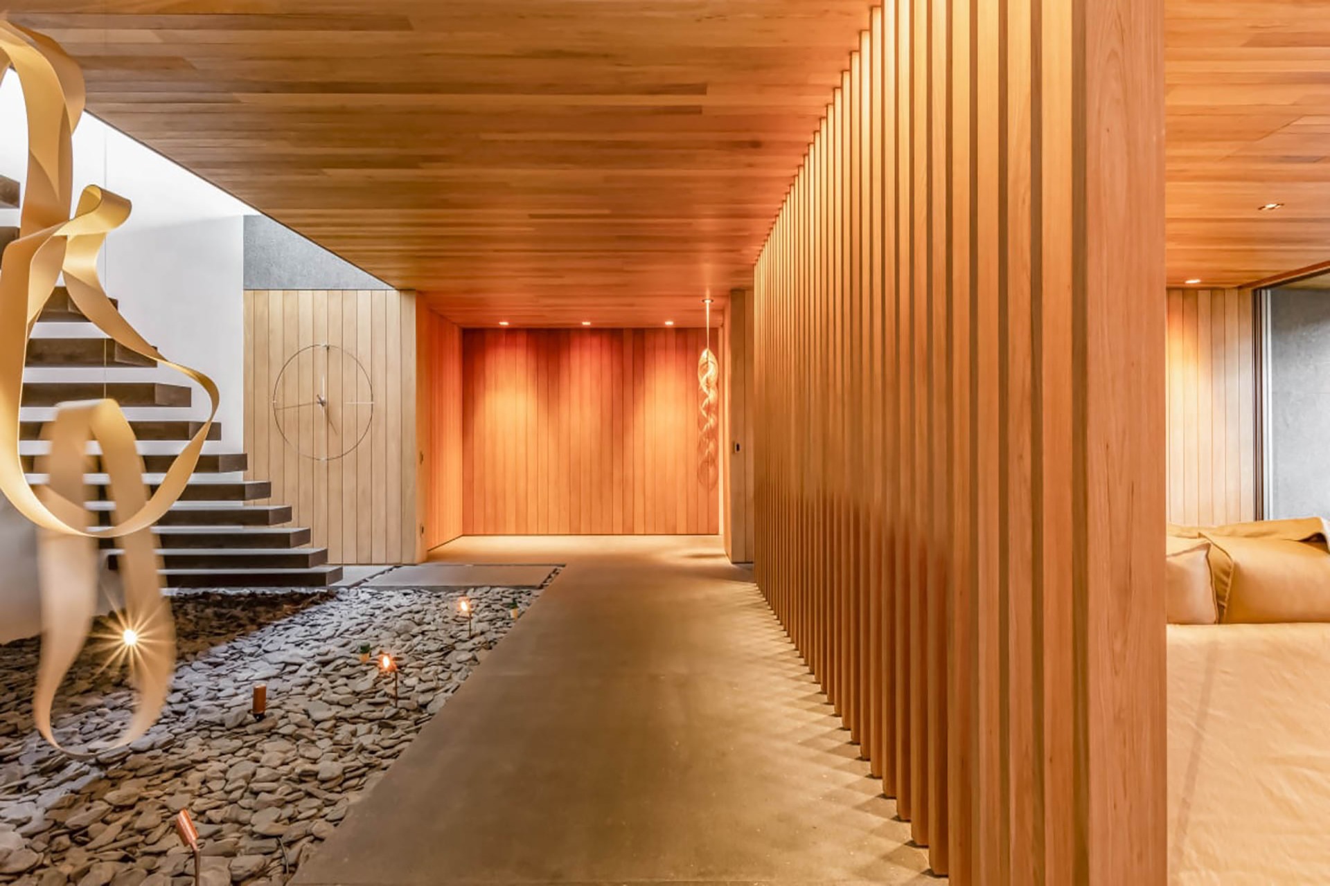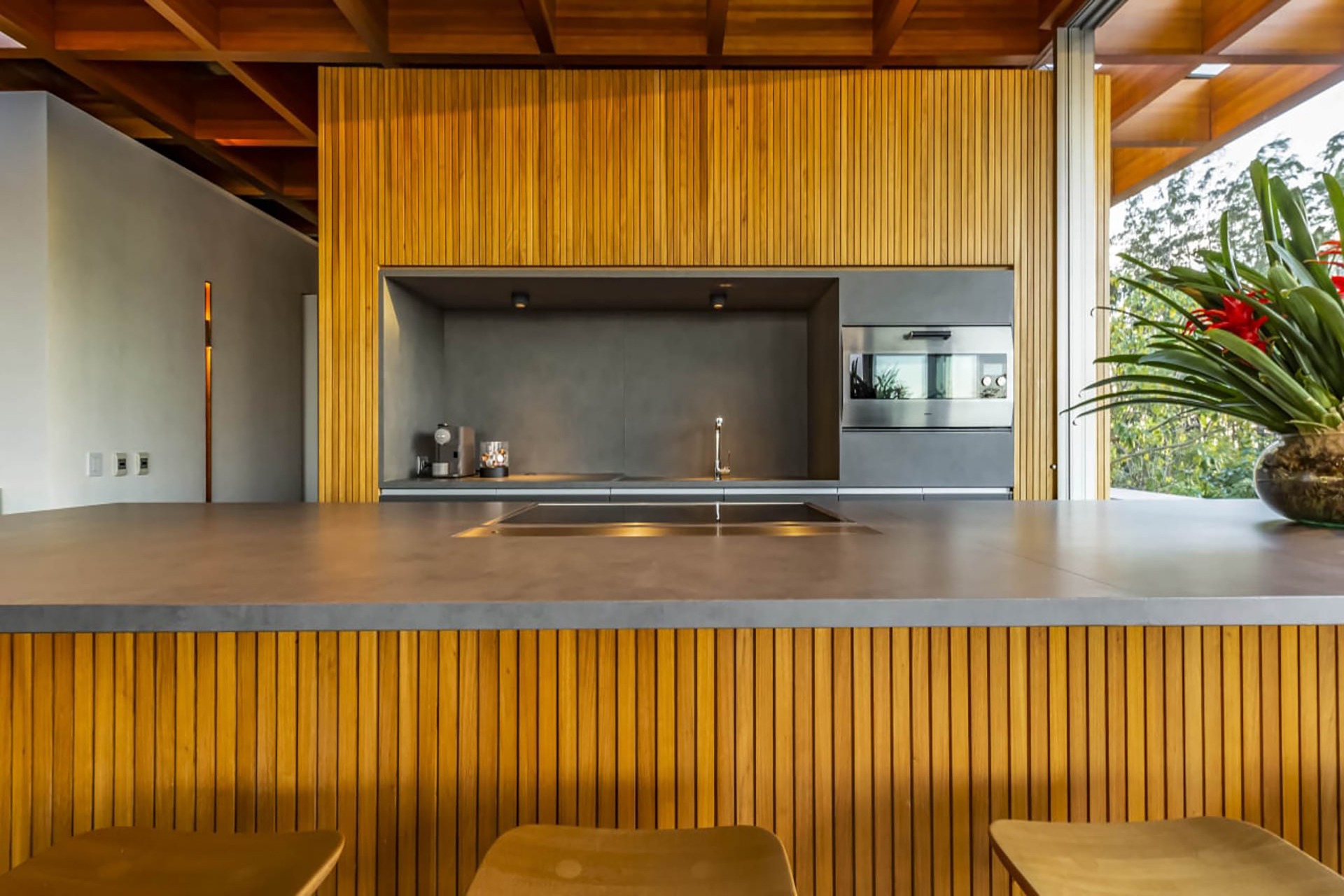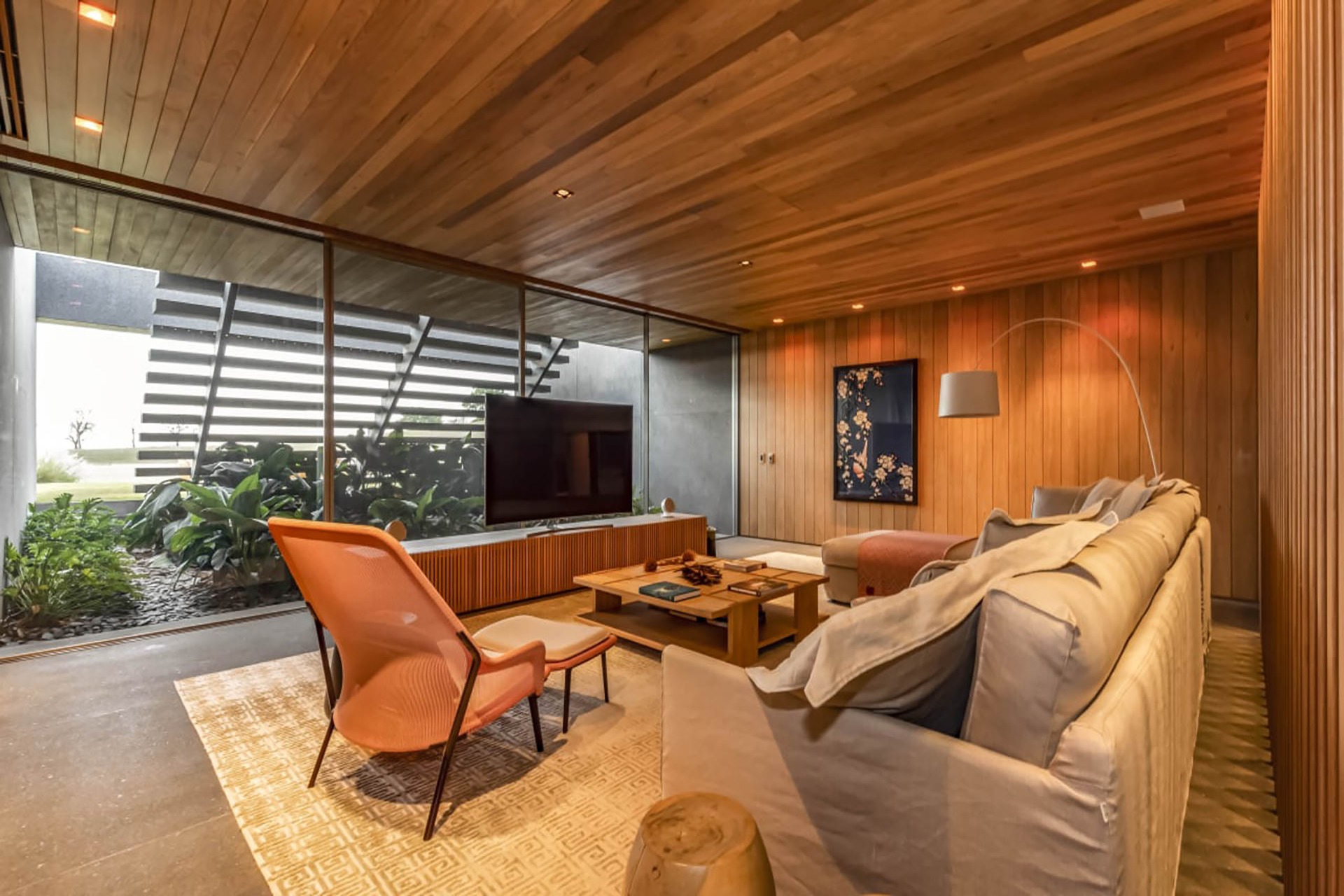 Estrutura de madeira com muitos vidros e integração com a natureza e entre os ambientes.
