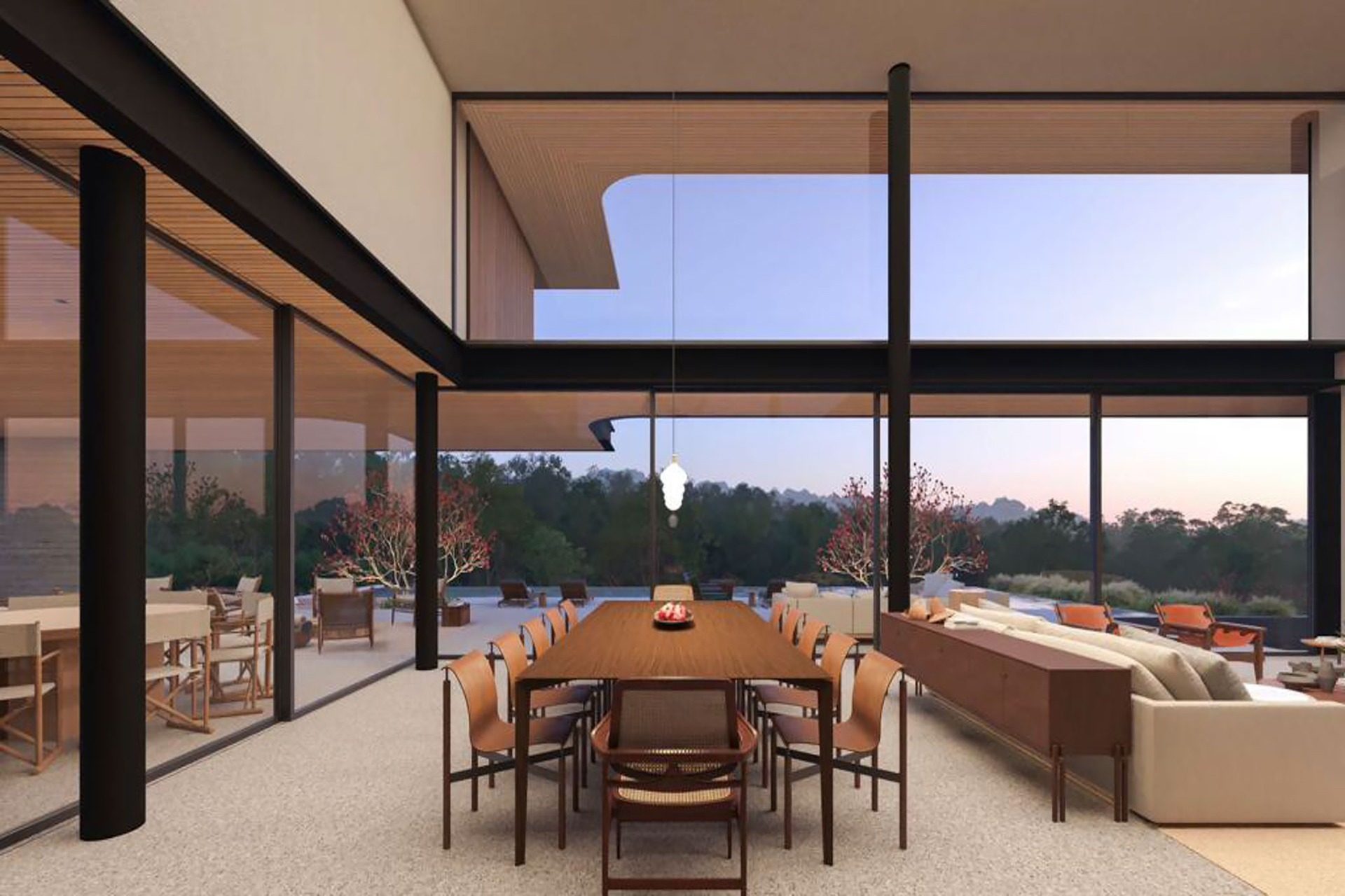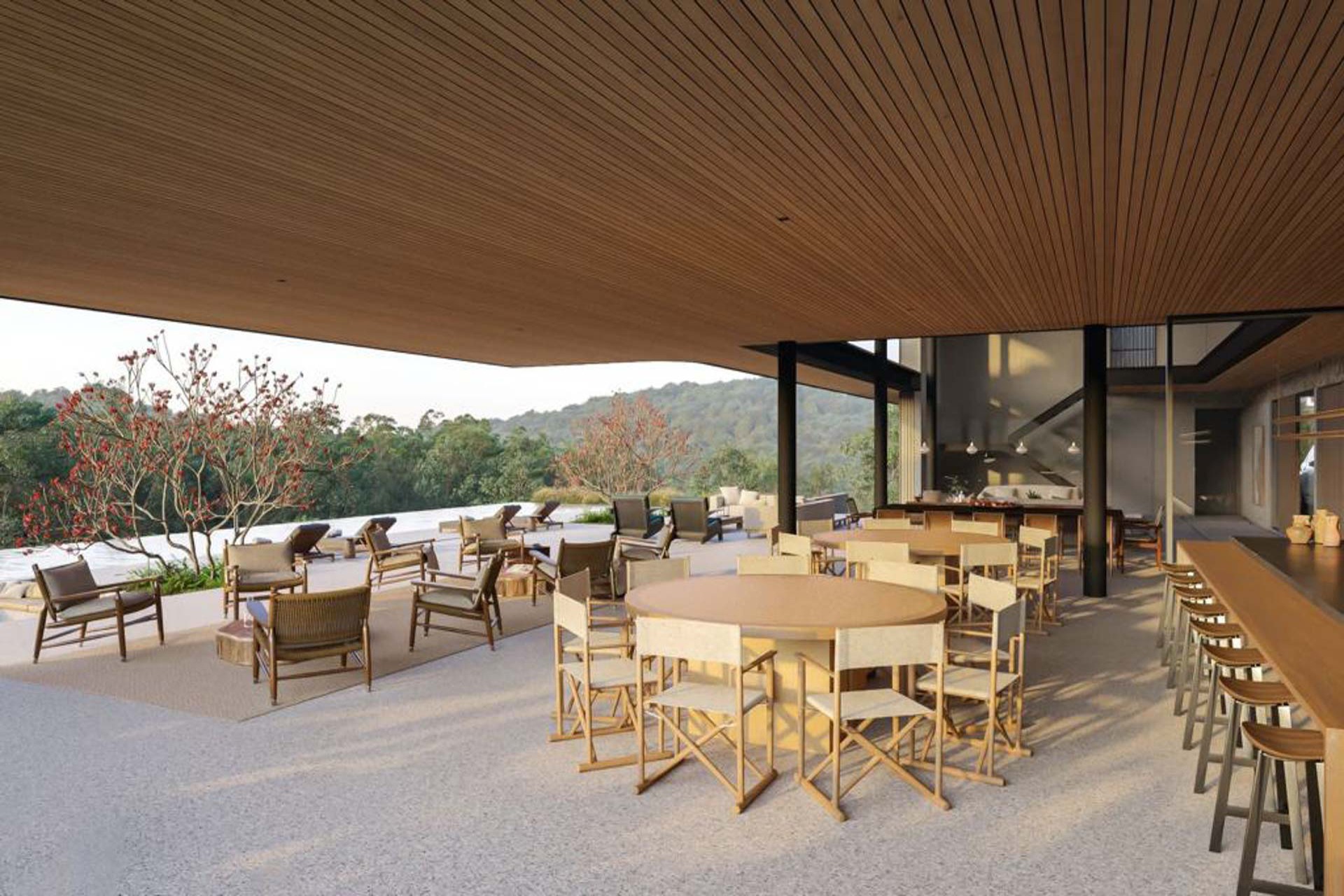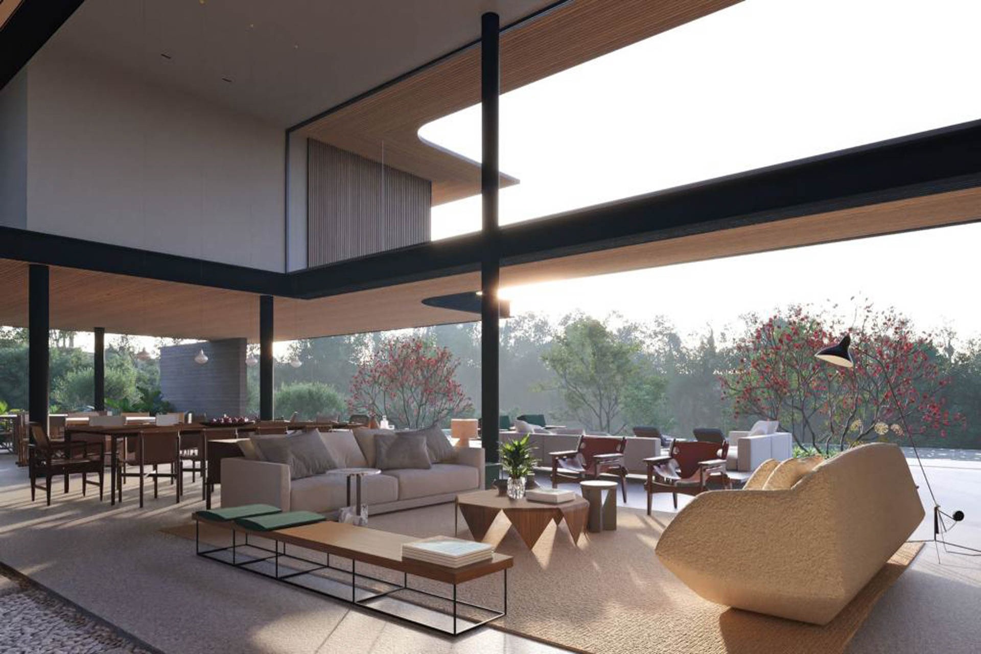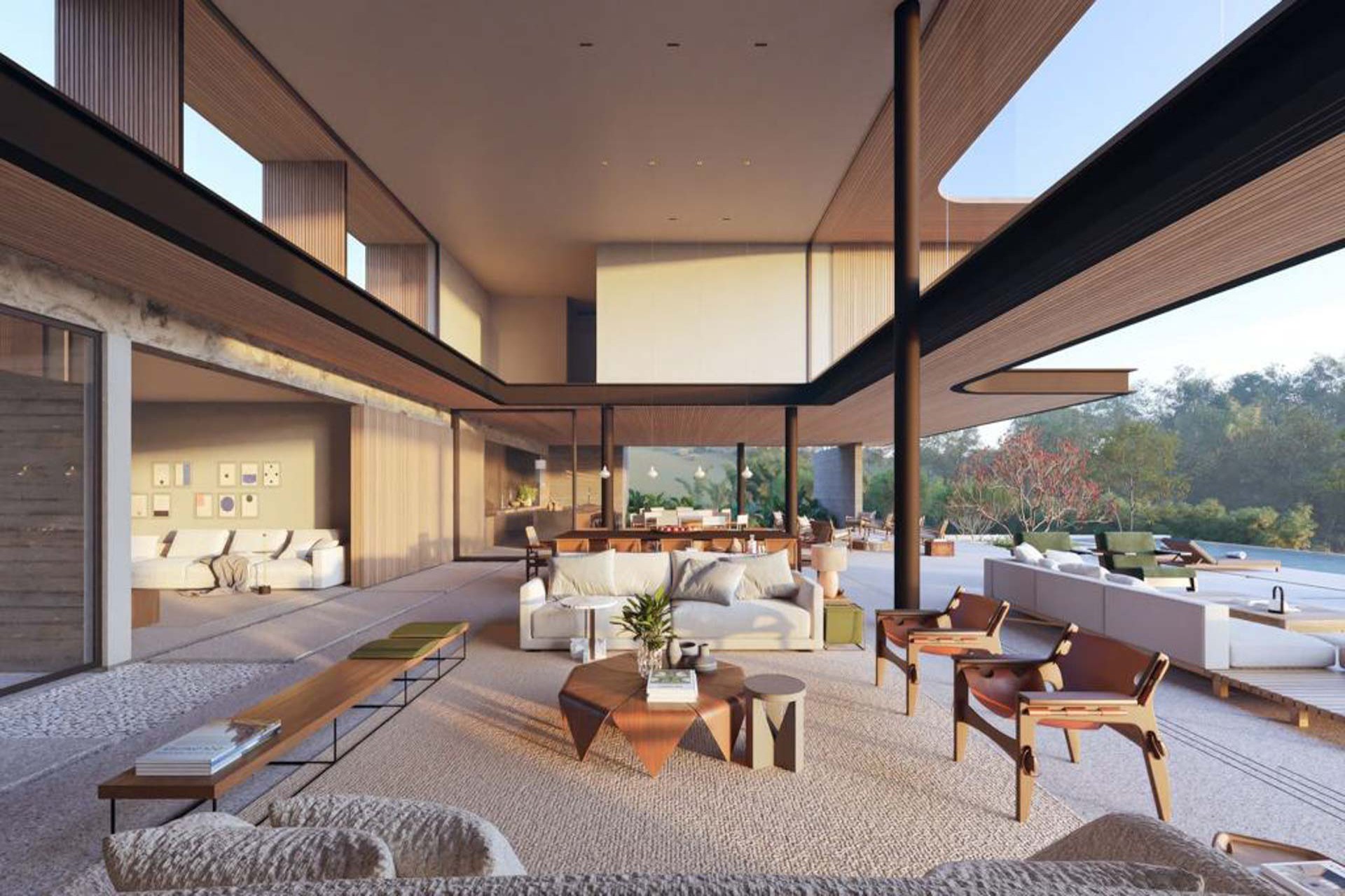 Estrutura de madeira com muitos vidros e integração com a natureza e entre os ambientes.