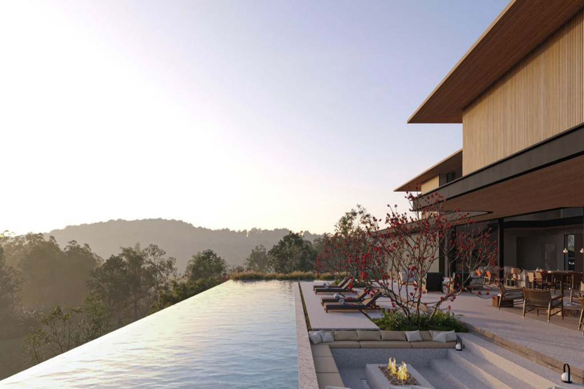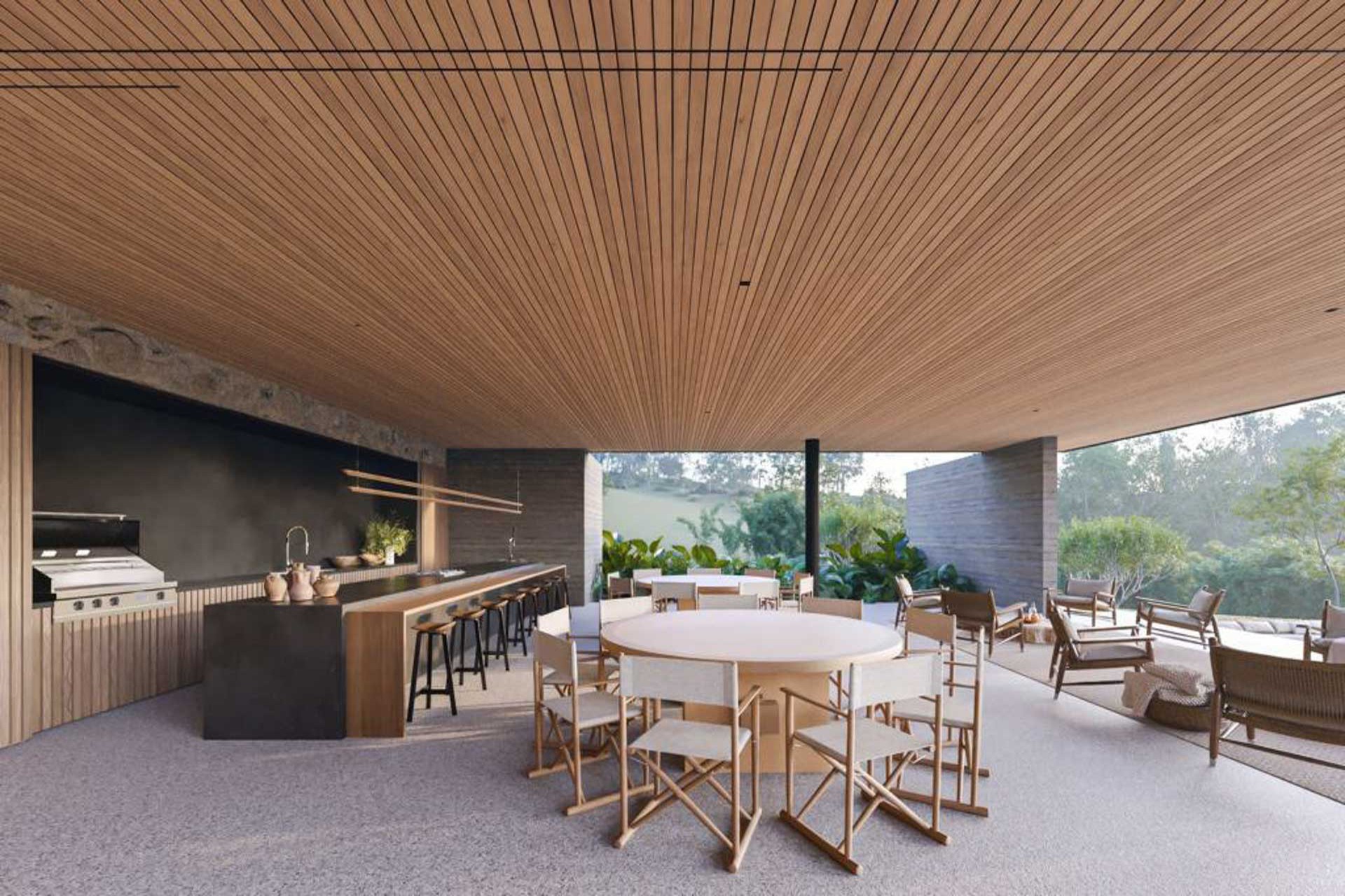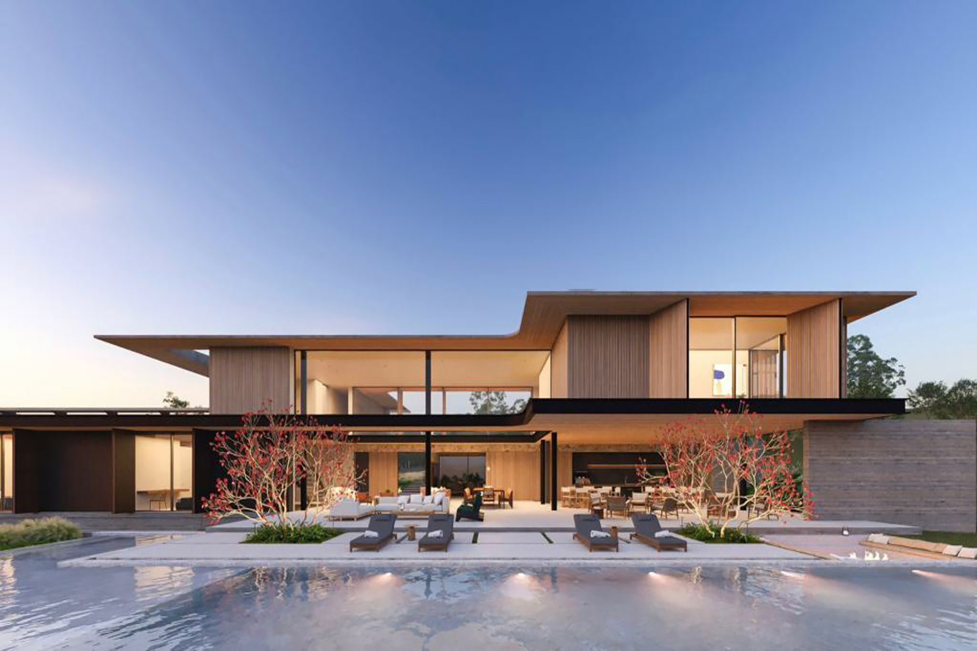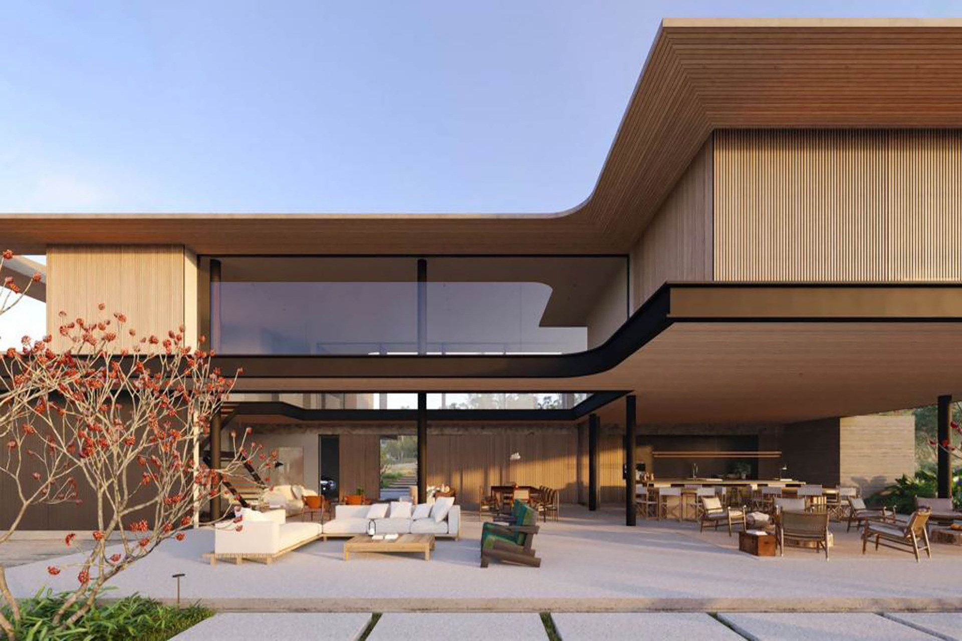 Estrutura de madeira com muitos vidros e integração com a natureza e entre os ambientes.