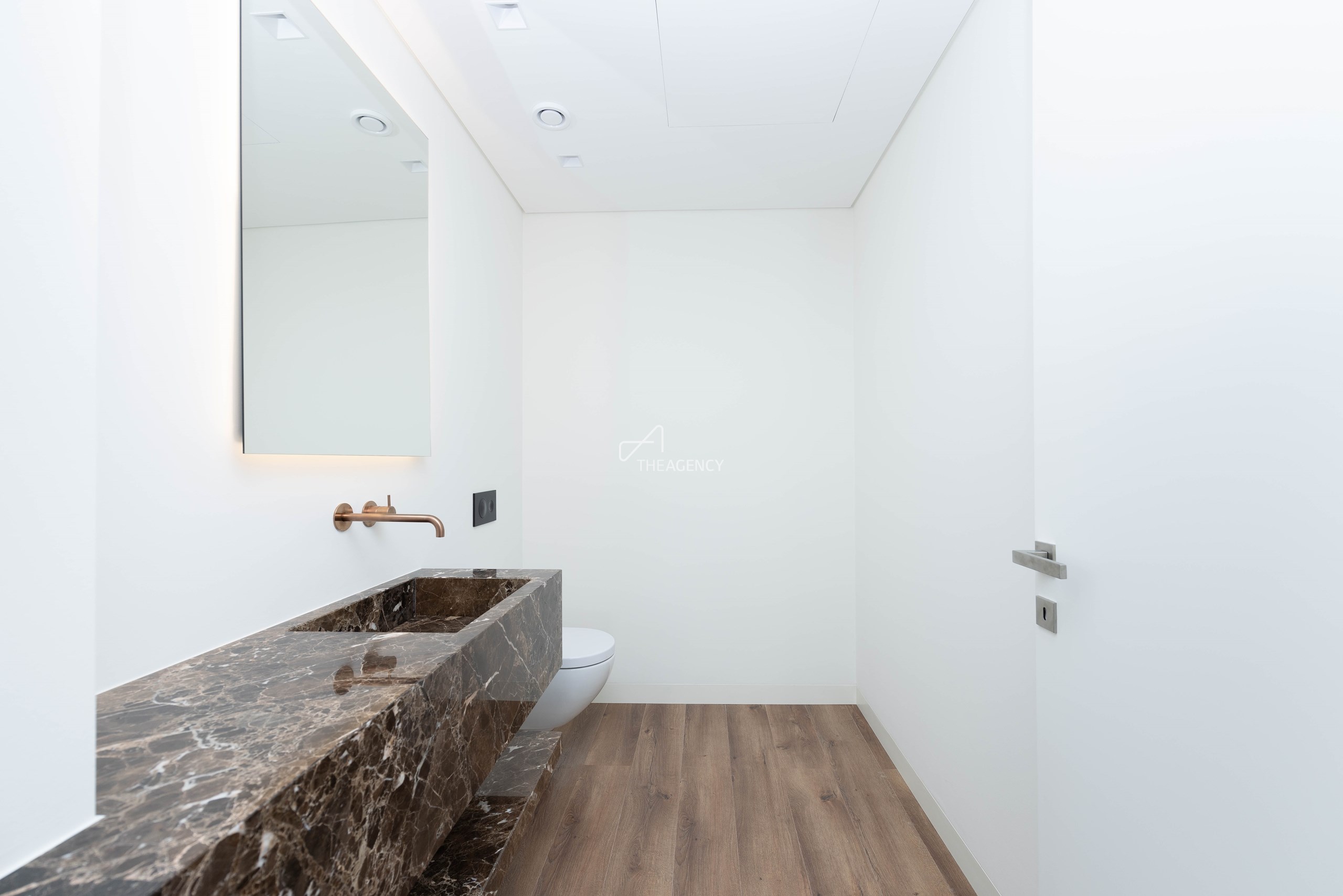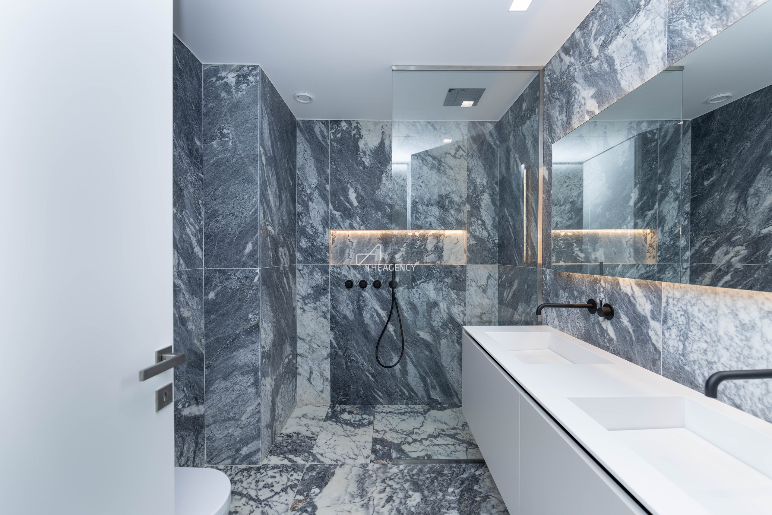 As casas de banho, com atmosfera de spa, apresentam mármore Volakas, banheiras de hidromassagem Jacuzzi e acessórios italianos das marcas Cielo, Hotbath e Antoniolupi o auge do requinte contemporâneo.