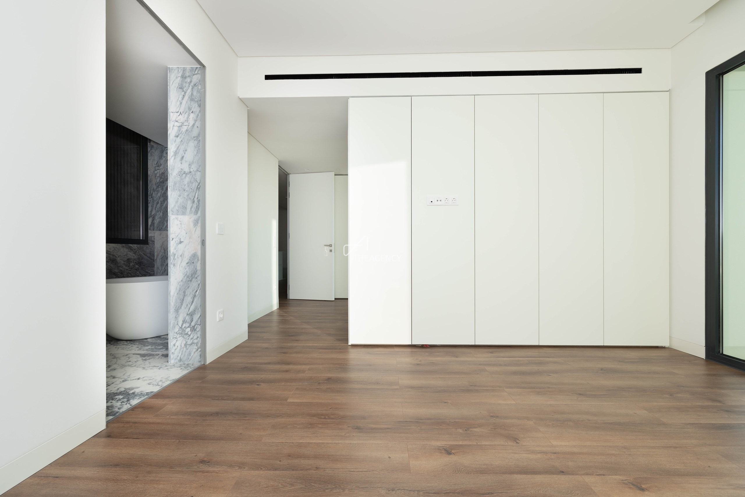 Desde a pedra natural e as texturas quentes da madeira até aos pavimentos em porcelanato, roupeiros por medida e iluminação minimalista cada acabamento reflete um luxo discreto.