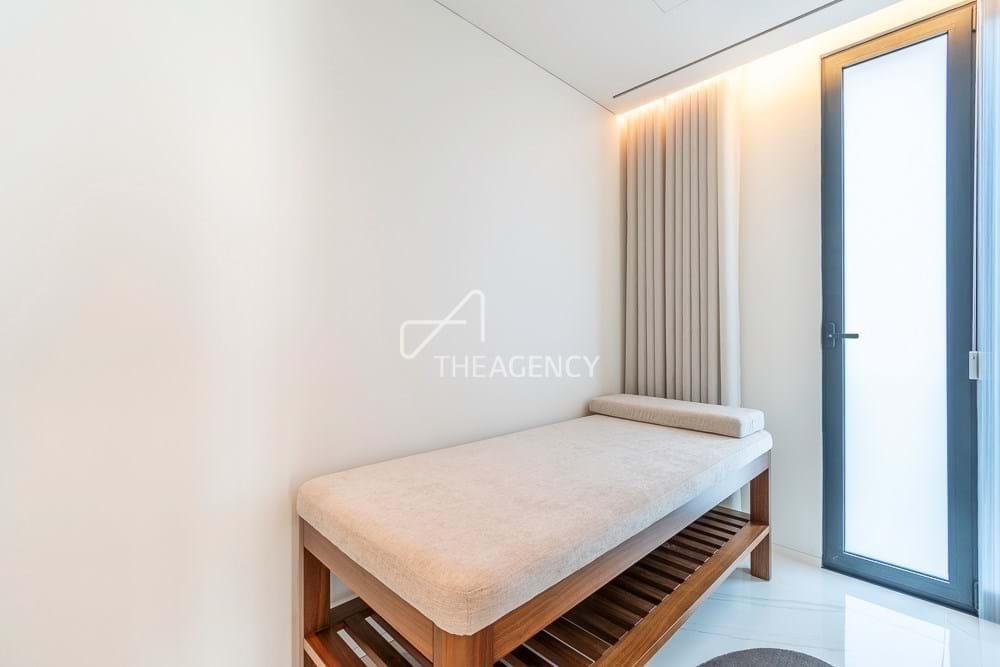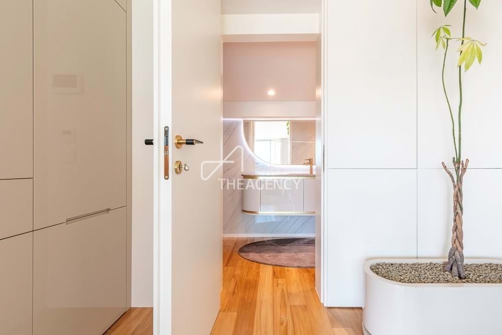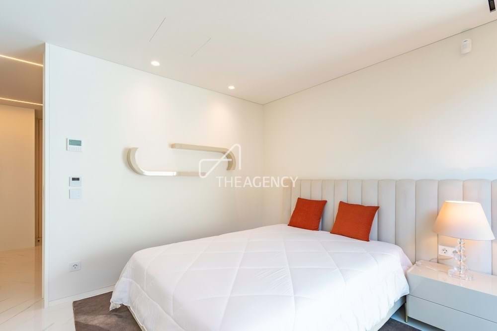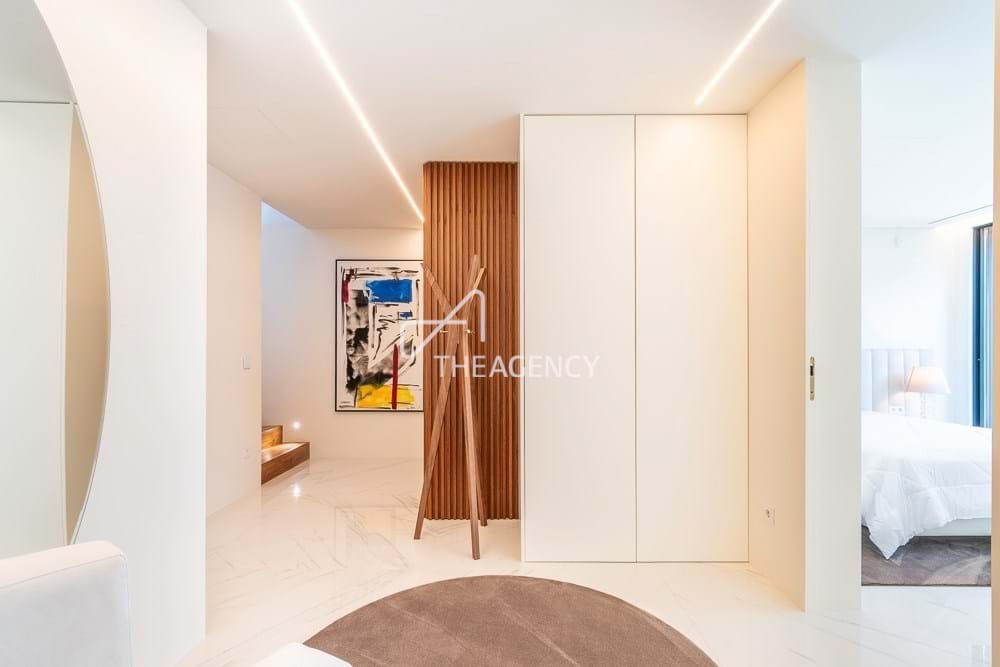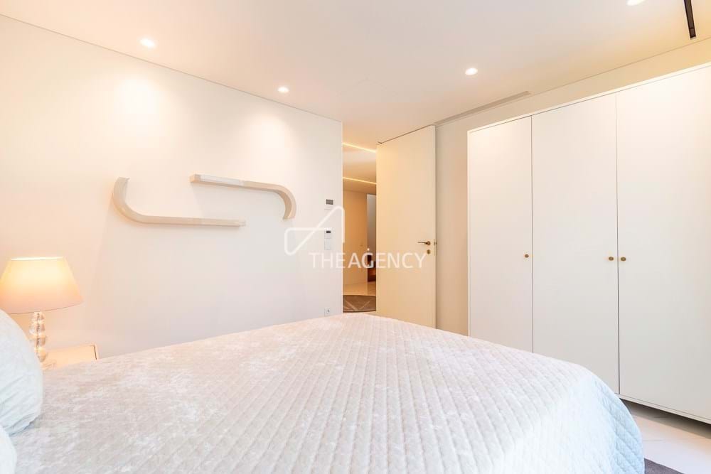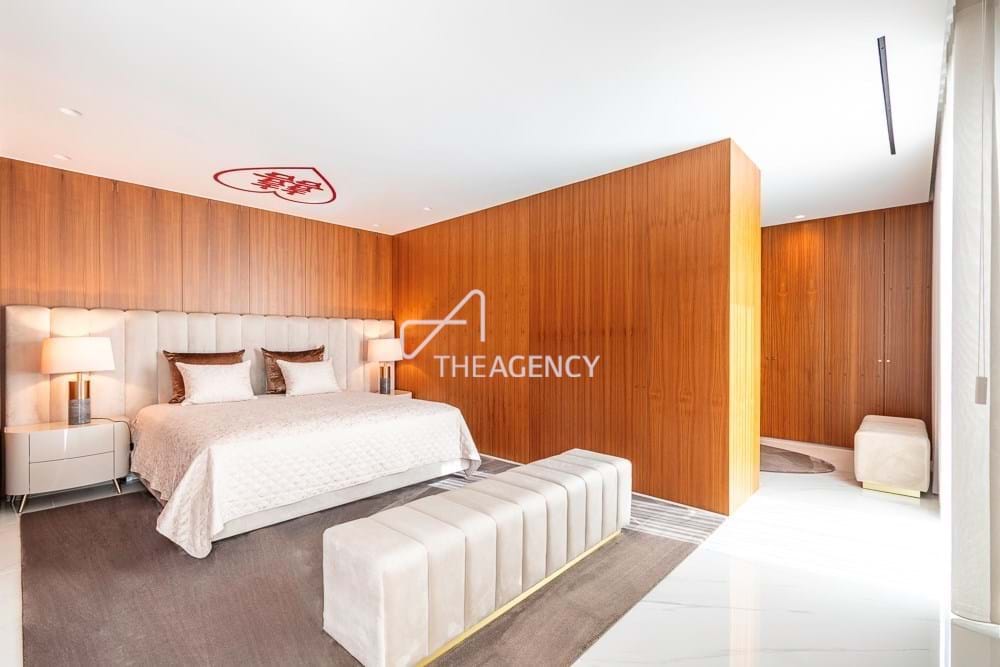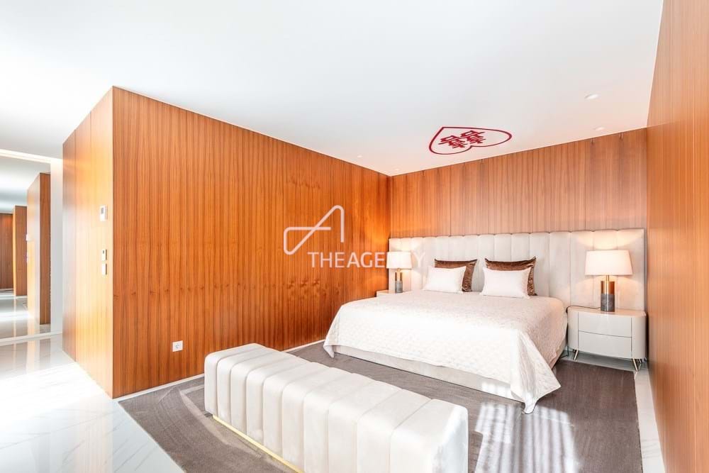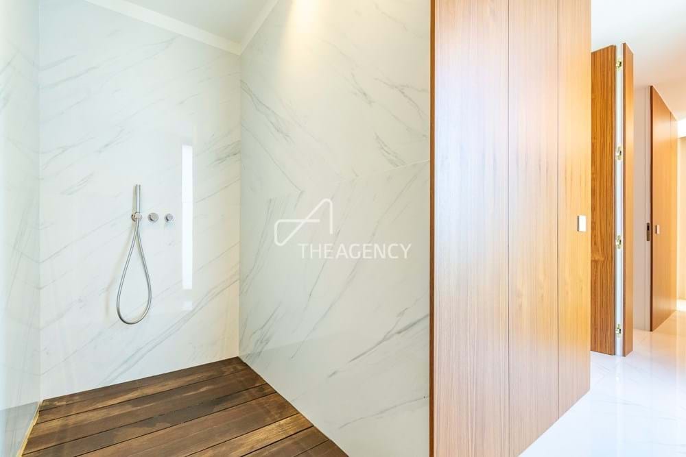 Somos convidados a conhecer o primeiro piso desta deslumbrante propriedade que ficou reservado na sua totalidade para a master suite permitindo total privacidade e fruição de todo um piso com vista mar. Ao entrarmos na suite, protegida por porta blindada, temos uma sala de estar privativa com mesa de refeição para dois e espaço de meditação. Encontramos de seguida um enorme walking closet que nos encaminha para a zona de dormir que foi pensada como refúgio e proteção, de acordo com as boas práticas de feng shui. Com o mar mesmo aos pés da cama somos chamados a contemplar o por do sol ou a vida marítima ao amanhecer. Este piso fica completo com dois Wcs individuais para maior comodidade do casal e um duche partilhado.