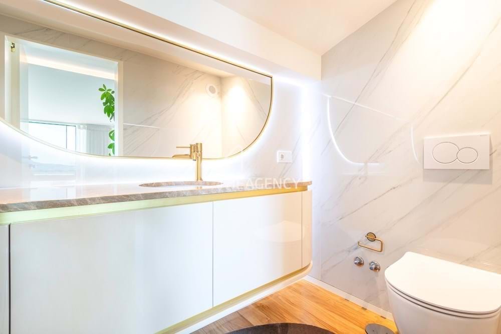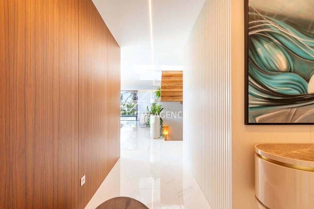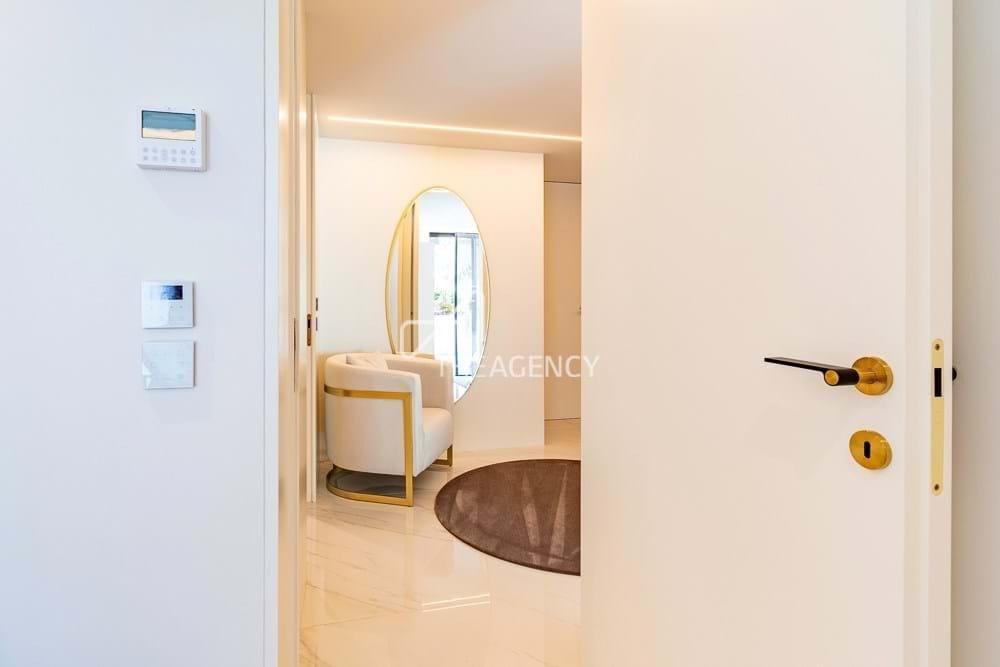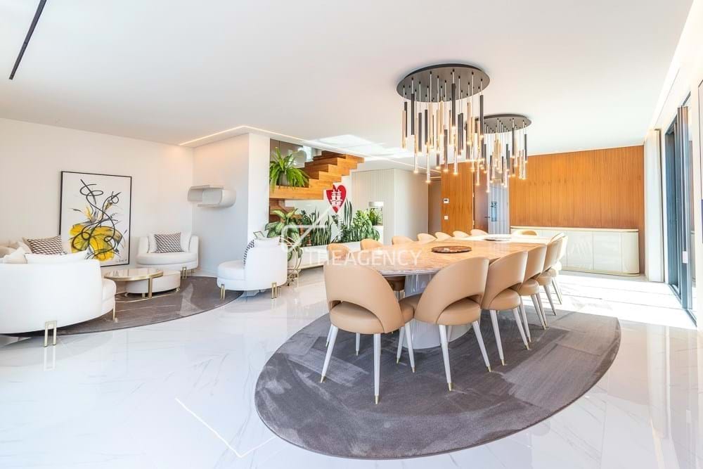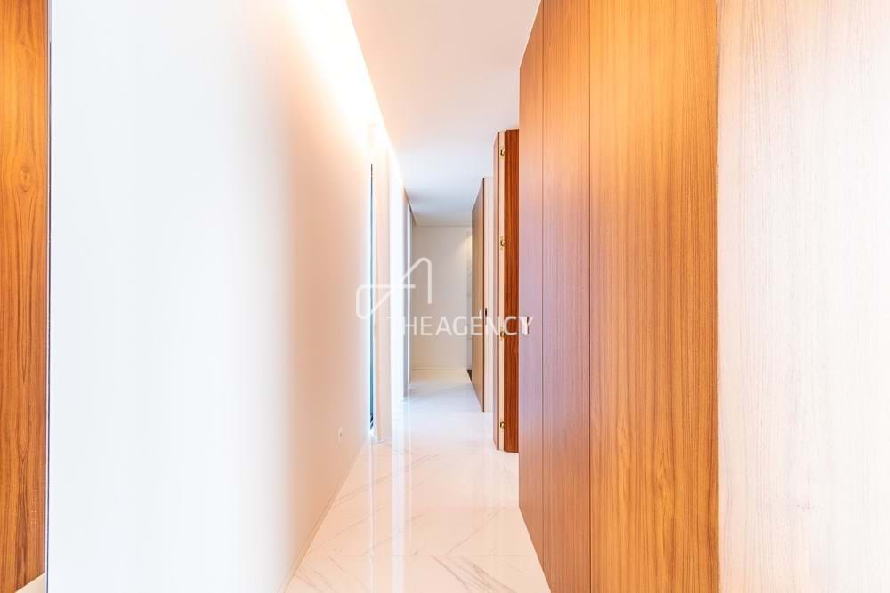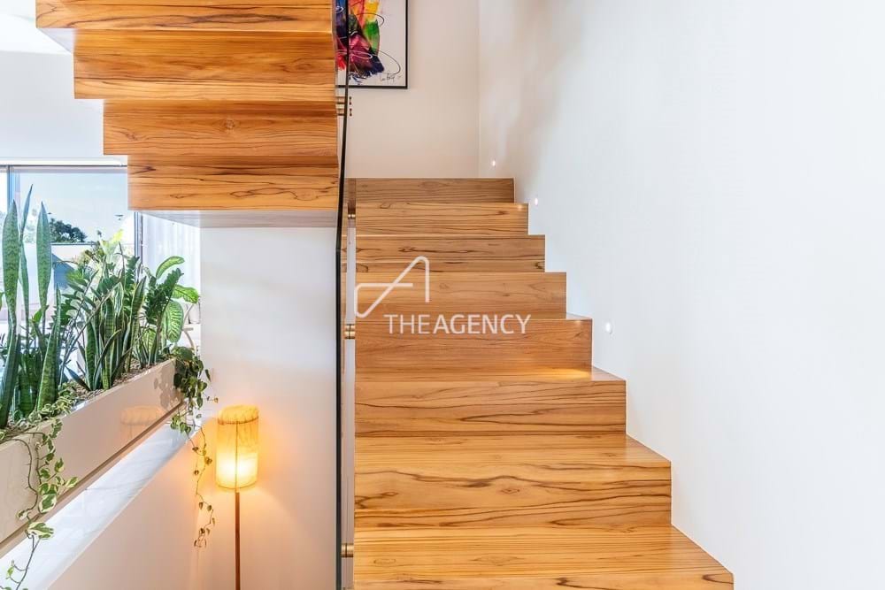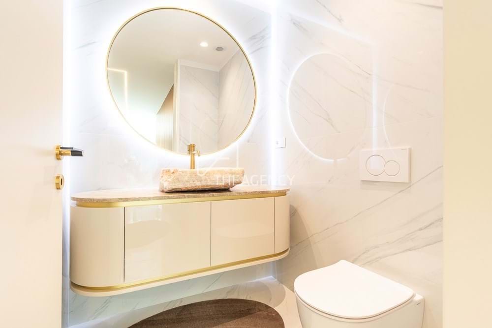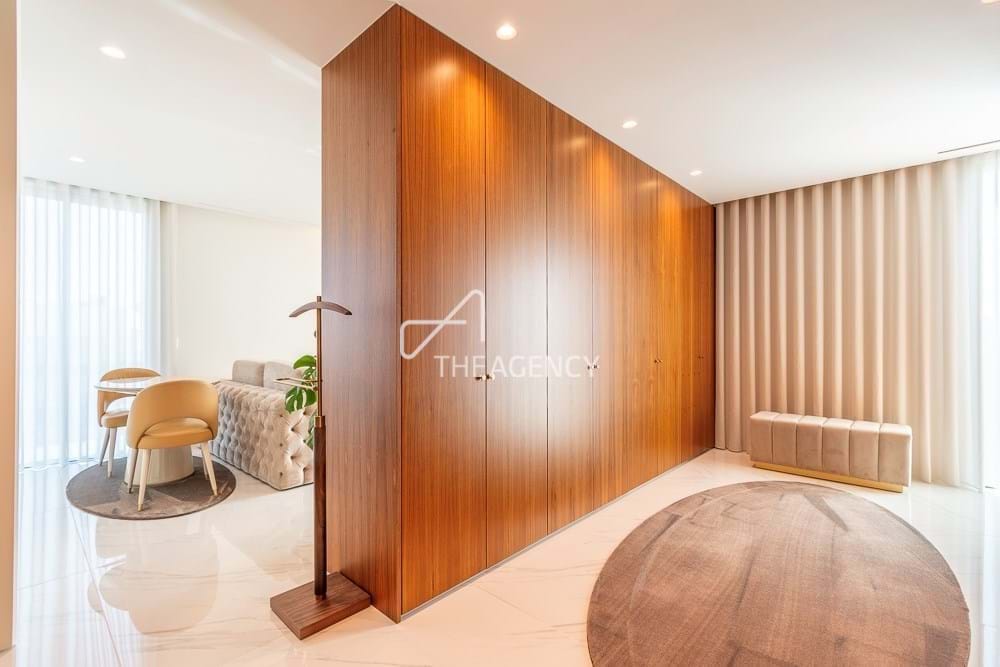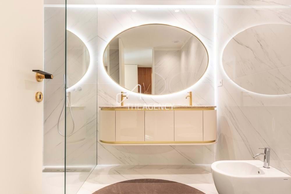 Somos convidados a conhecer o primeiro piso desta deslumbrante propriedade que ficou reservado na sua totalidade para a master suite permitindo total privacidade e fruição de todo um piso com vista mar. Ao entrarmos na suite, protegida por porta blindada, temos uma sala de estar privativa com mesa de refeição para dois e espaço de meditação. Encontramos de seguida um enorme walking closet que nos encaminha para a zona de dormir que foi pensada como refúgio e proteção, de acordo com as boas práticas de feng shui. Com o mar mesmo aos pés da cama somos chamados a contemplar o por do sol ou a vida marítima ao amanhecer. Este piso fica completo com dois Wcs individuais para maior comodidade do casal e um duche partilhado.
