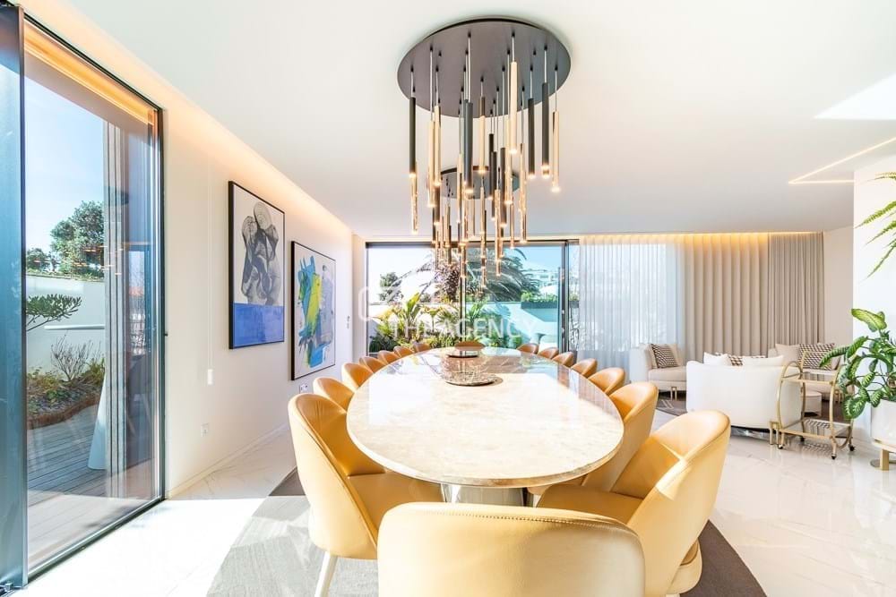 Somos acolhidos no piso de entrada por um hall que nos direciona para uma luminosa sala comum onde a peça de excelência é uma sumptuosa mesa de jantar, para 16 convidados, em mármore imperador, com cadeirões em pele. A sala conta ainda com uma área de estar com vista para a zona de convívio exterior. A completar este piso temos uma generosa cozinha totalmente equipada com eletrodoméstico topo de gama e uma mesa de refeições para 6 pessoas. Para comodidade dos convidados este piso dispõe de uma toillet que marca a sua posição na decoração com um lavatório esculpido numa peça de mármore rústico.
