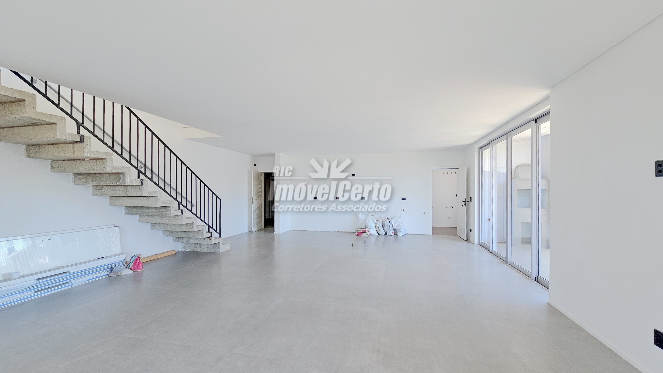 Sala de estar com pé direito duplo, garantindo maior luminosidade.