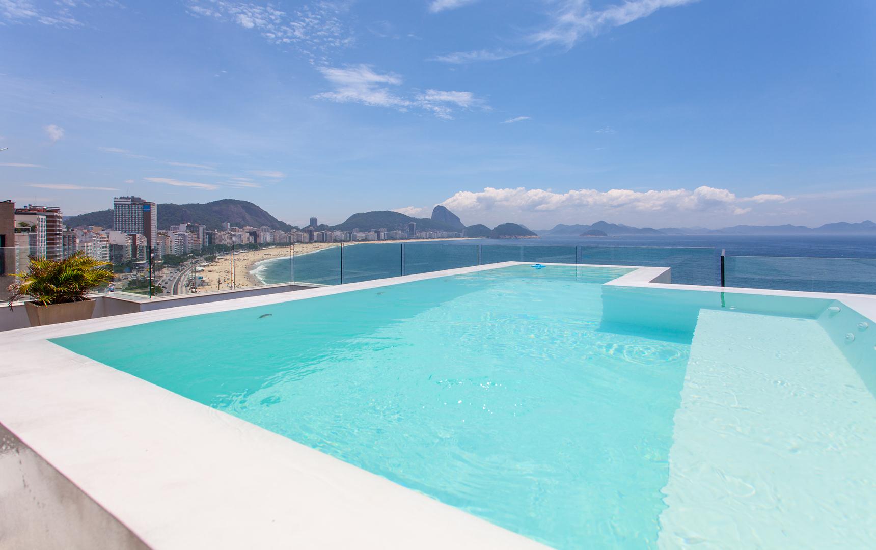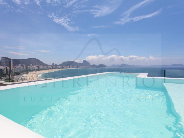 Com sua piscina e vista panorâmica da praia, ela está à venda. Construída em duplex, oferece a melhor vista para o mar e um grande espaço.Possui grandes salas de estar no primeiro e segundo andares e está localizado no décimo oitavo andar do edifício. A cobertura oferece uma vista panorâmica magnífica de Copacabana.