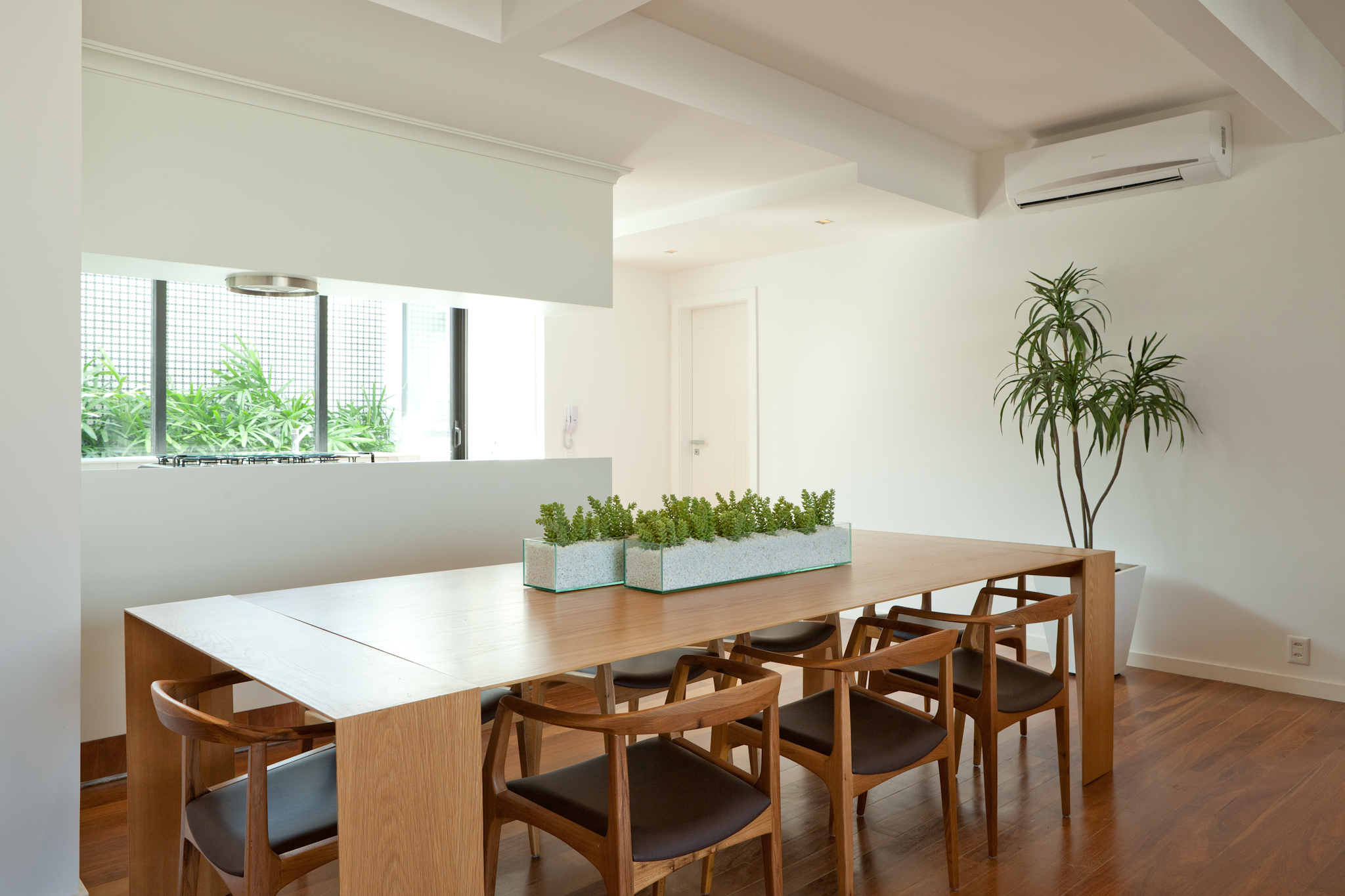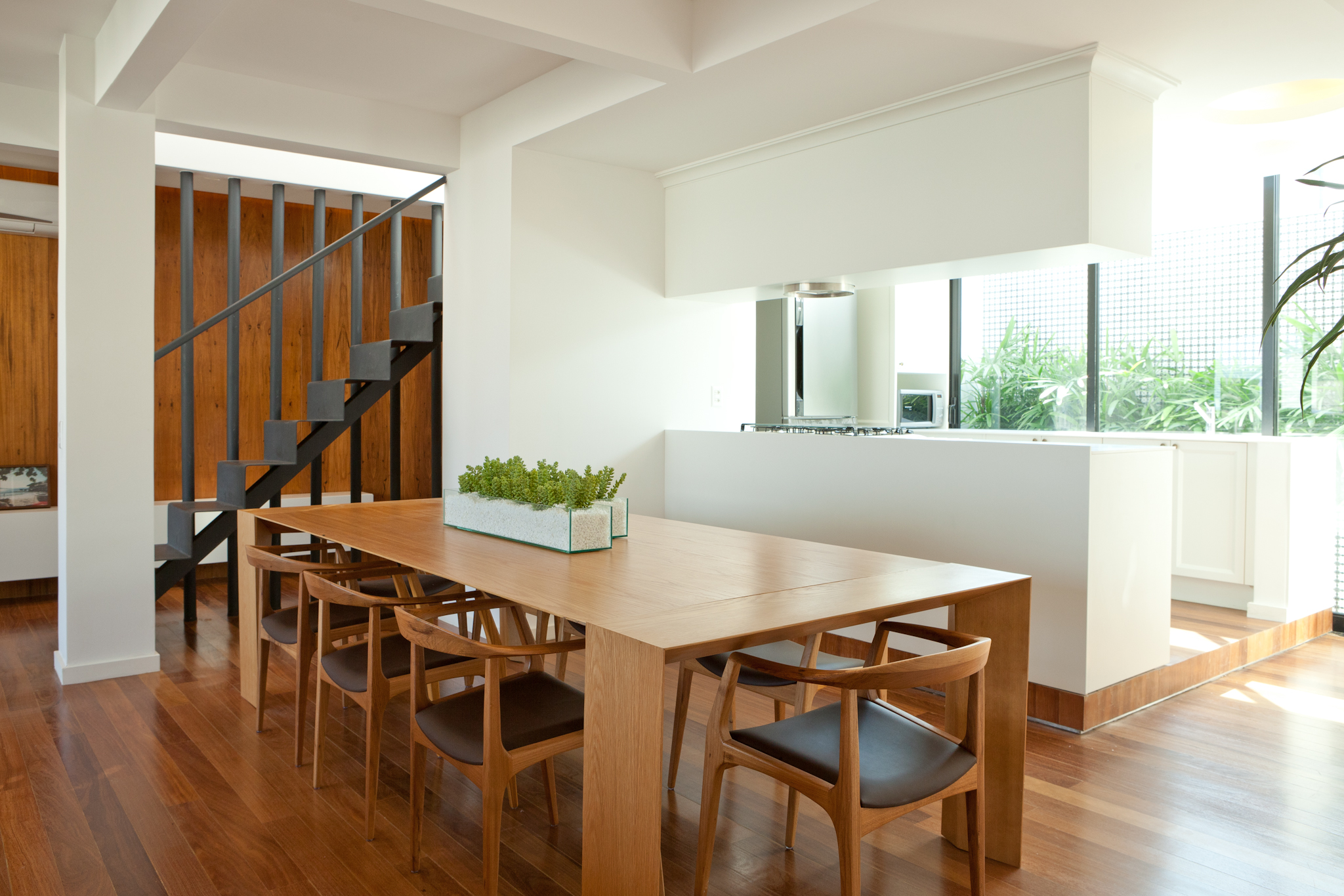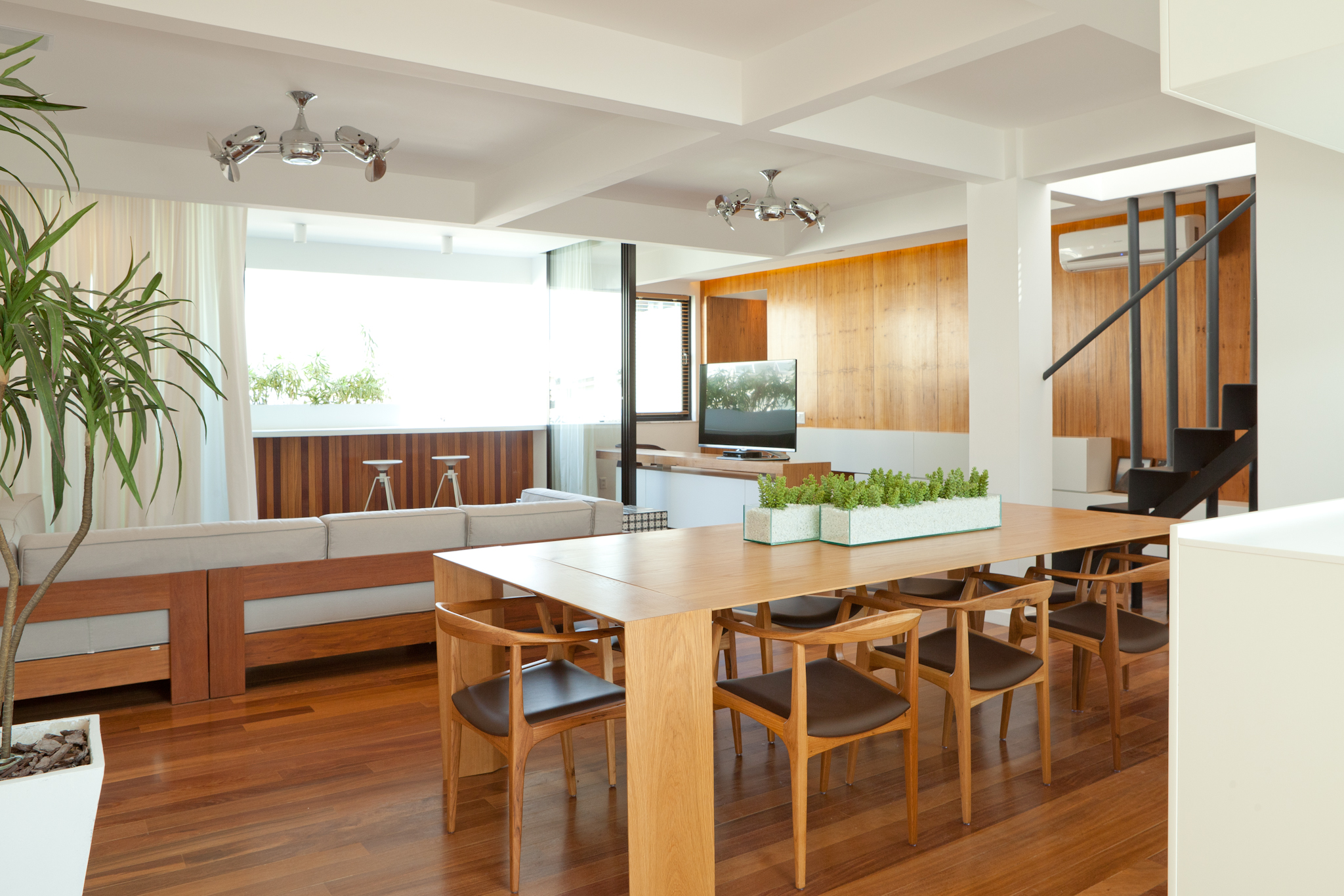 No primeiro piso, a sala ampla e com pé direito alto oferece conforto para receber convidados, com o amplo sofá a proximidade da varanda, e a grande mesa de 8 lugares. A cozinha americana, esta totalmente equipada e abre num charmoso jardim de inverno.