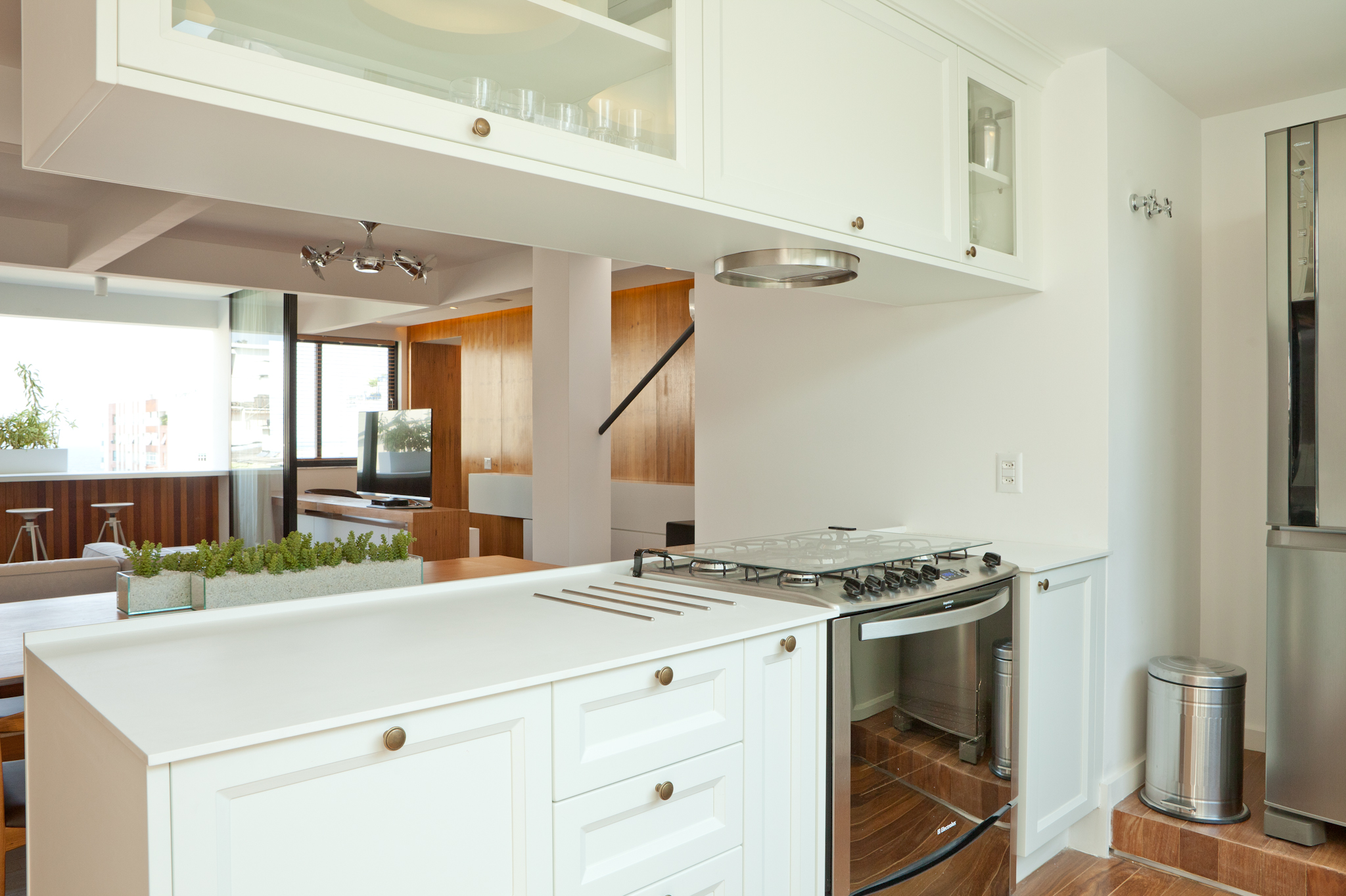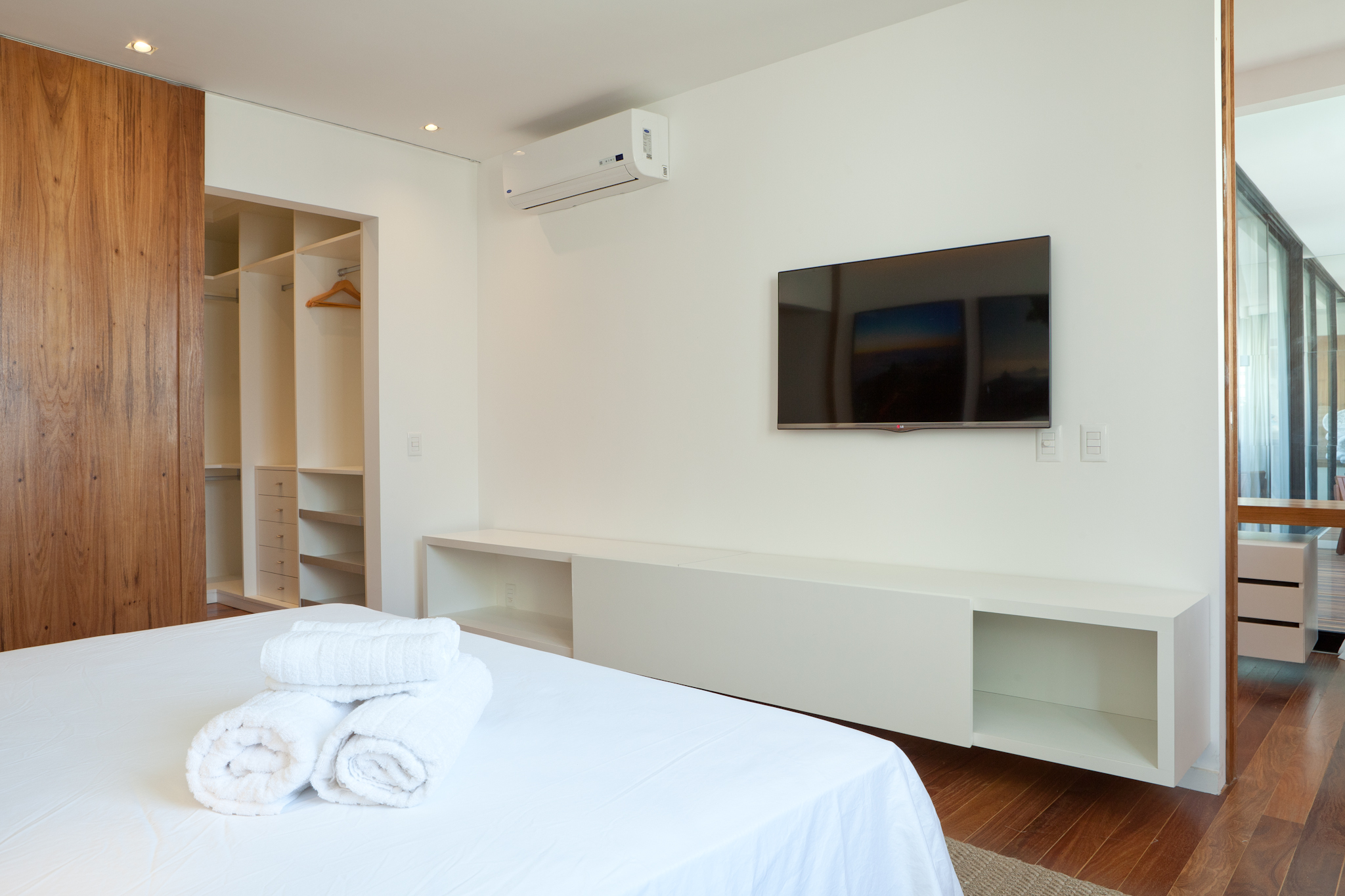 A propriedade possuí duas suítes espaçosas, com camas king size e armários, sendo a master com closet e vista mar, um espaço home-office na sala, um lavabo e um quartos de serviço utilizado como lavanderia.