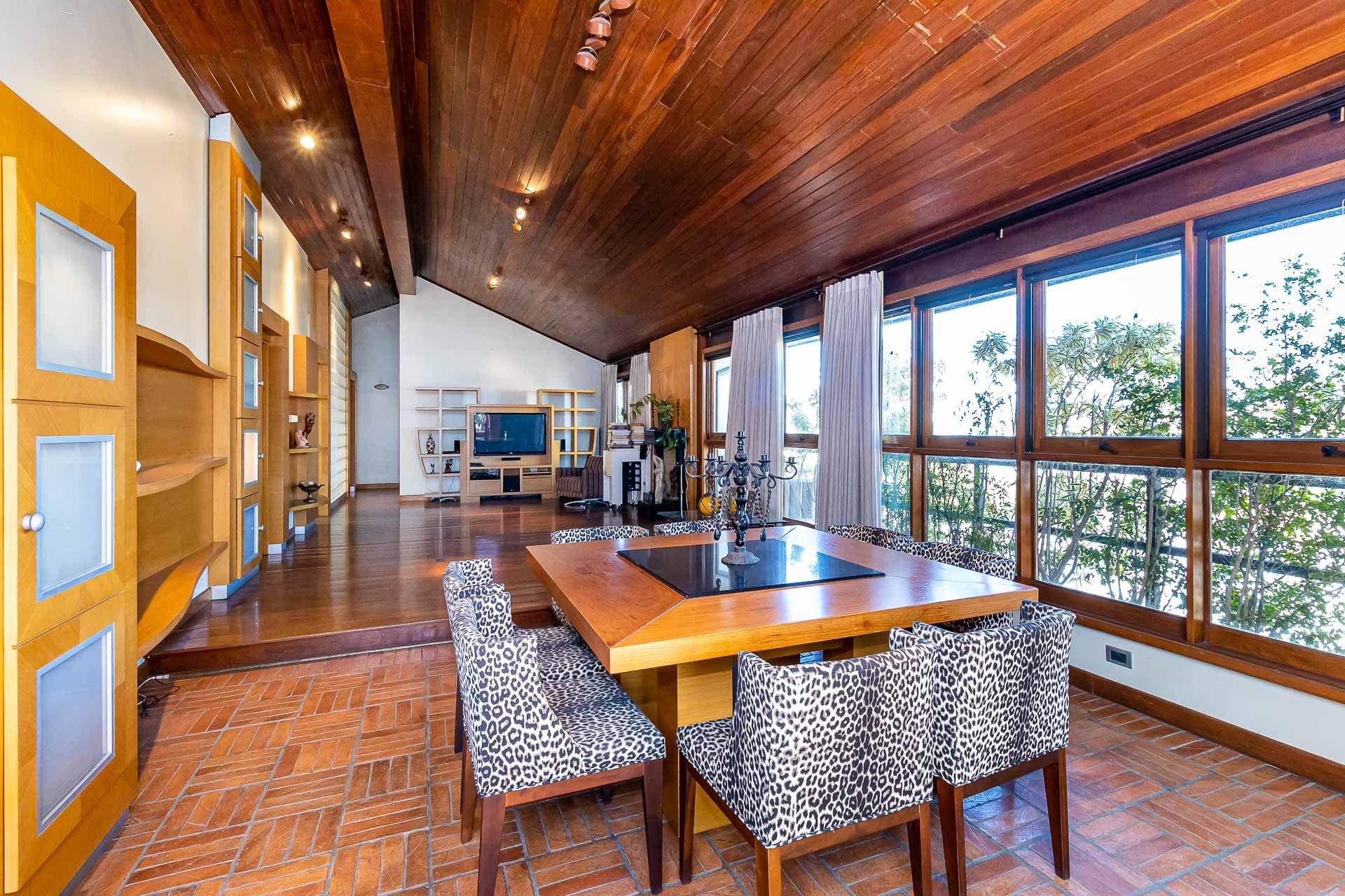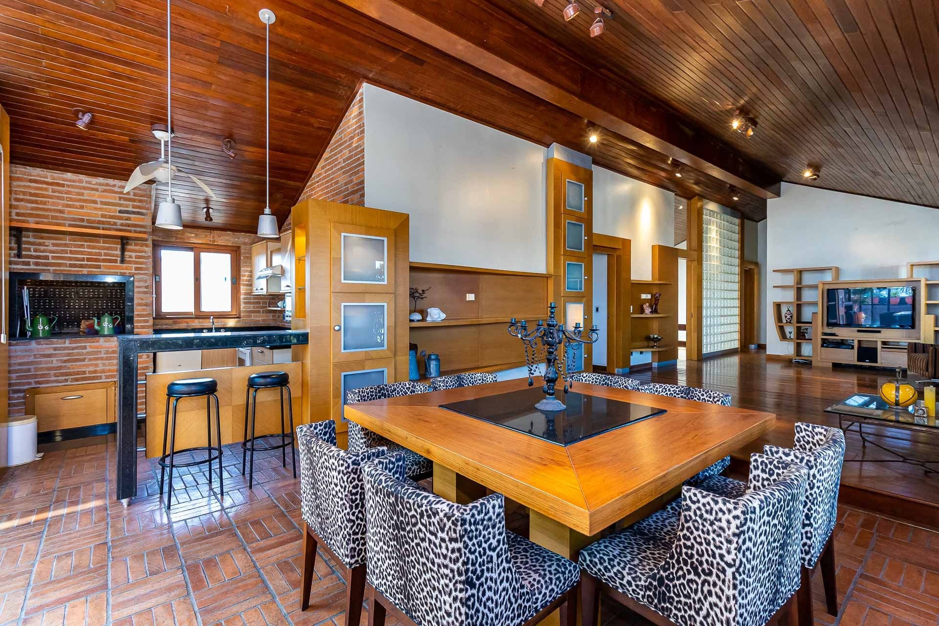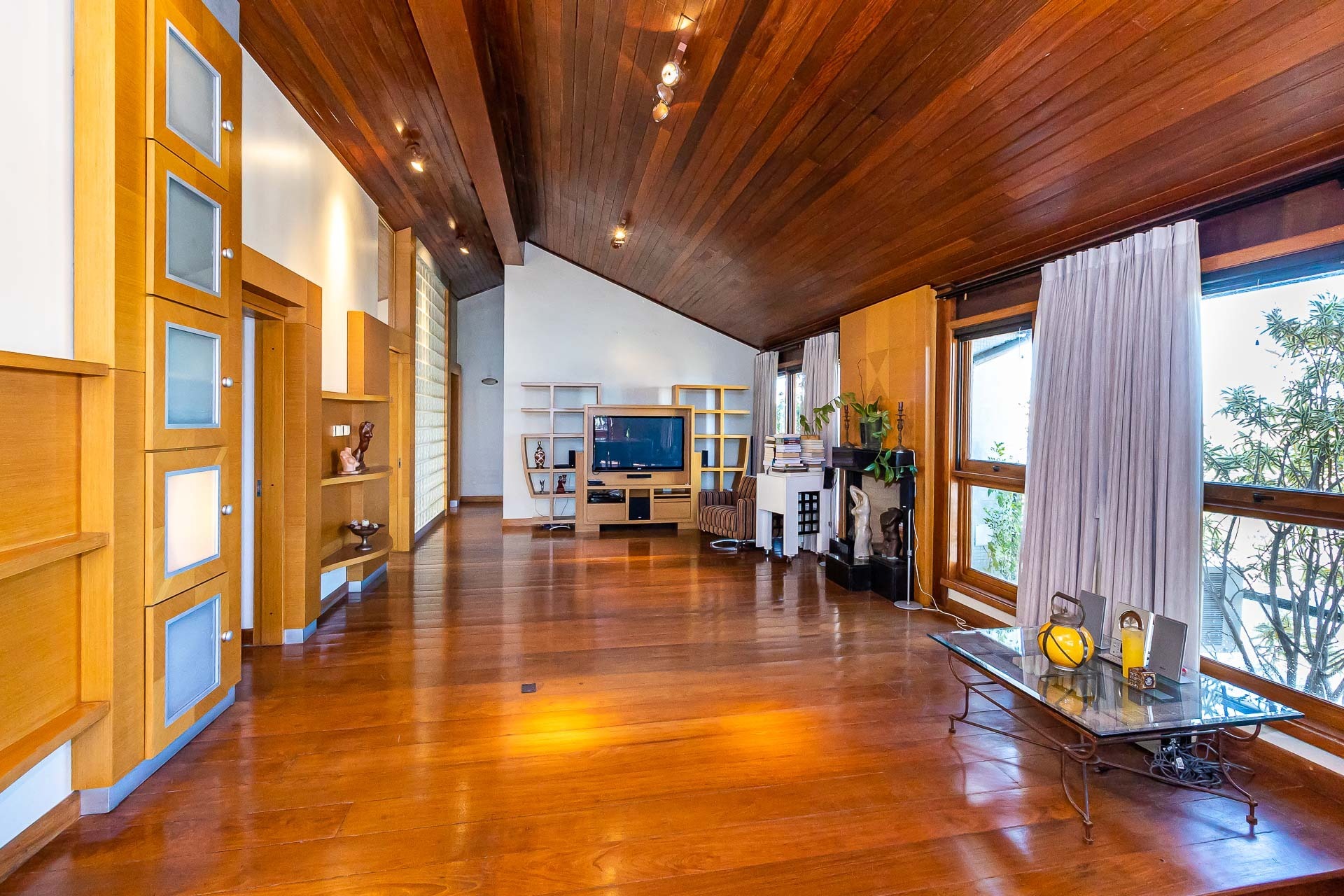 O pavimento superior possui living amplo para 3 ambientes com lareira, banheiro social...