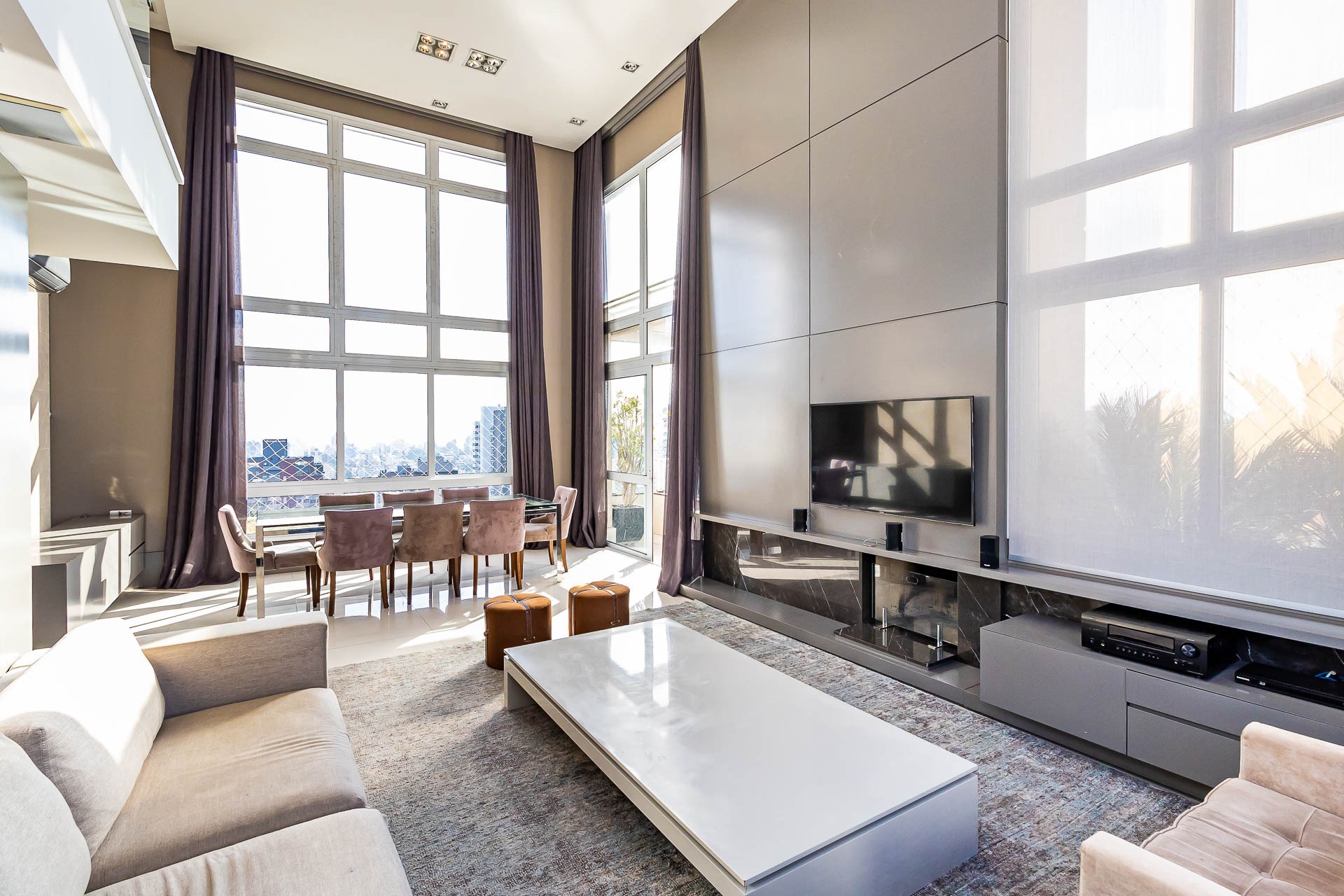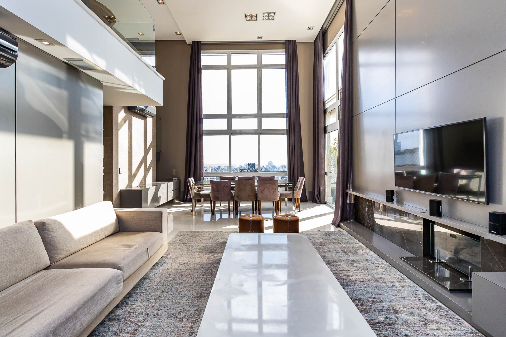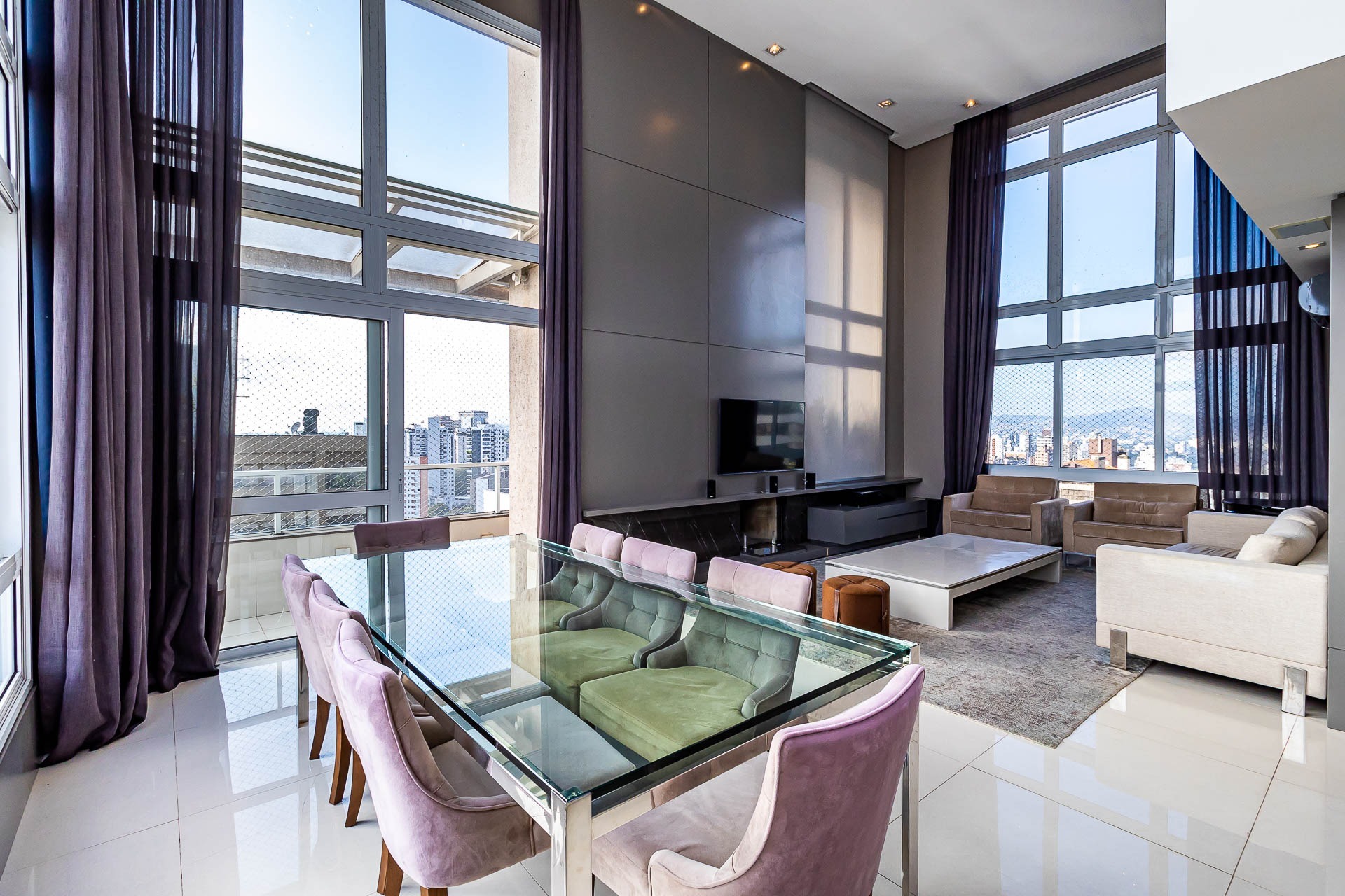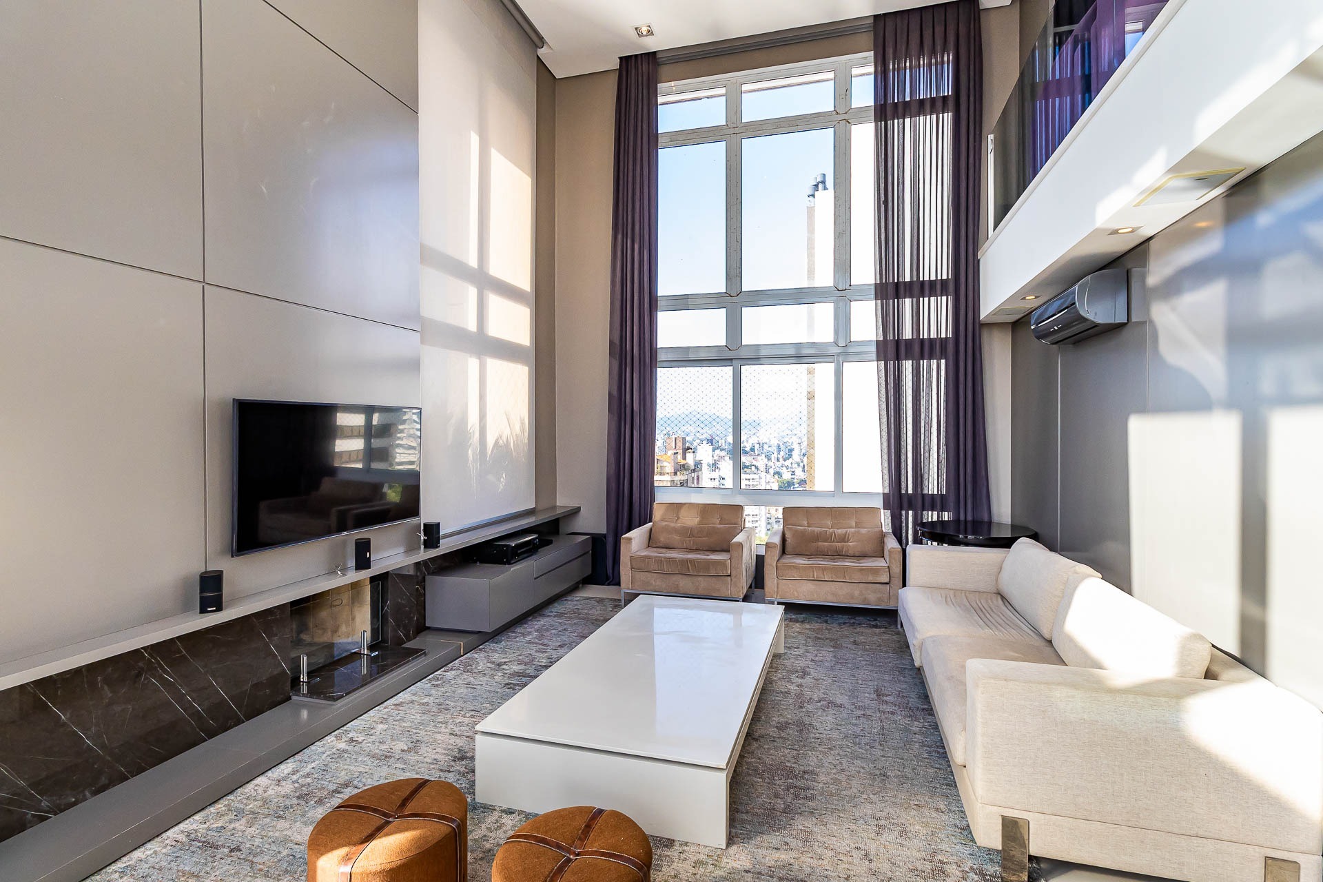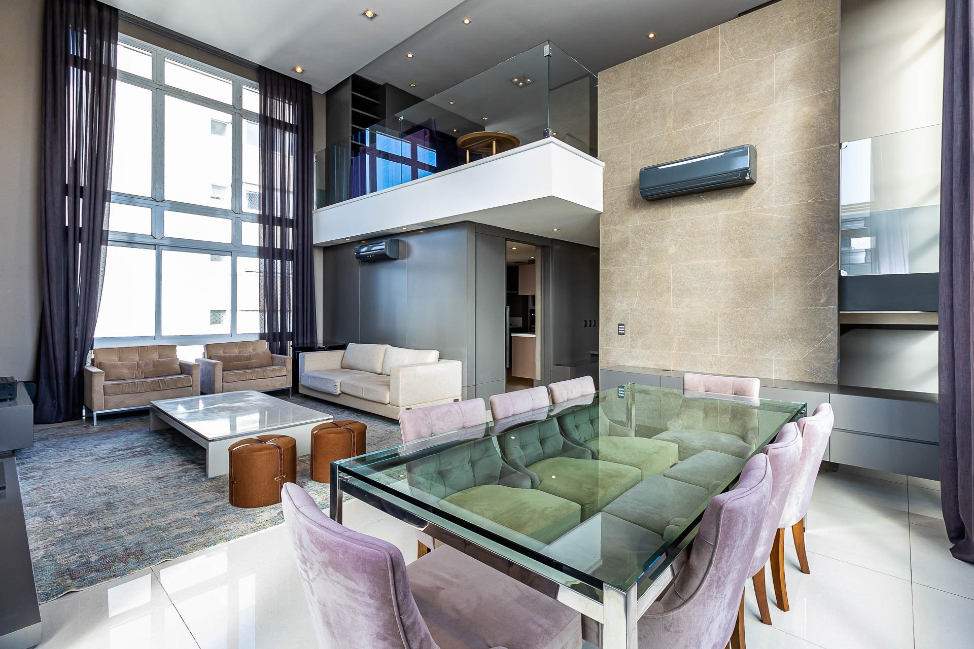 Deslumbrante cobertura duplex, totalmente mobiliada, com três dormitórios, incluindo uma suíte, duas vagas de garagem cobertas e um depósito privativo.