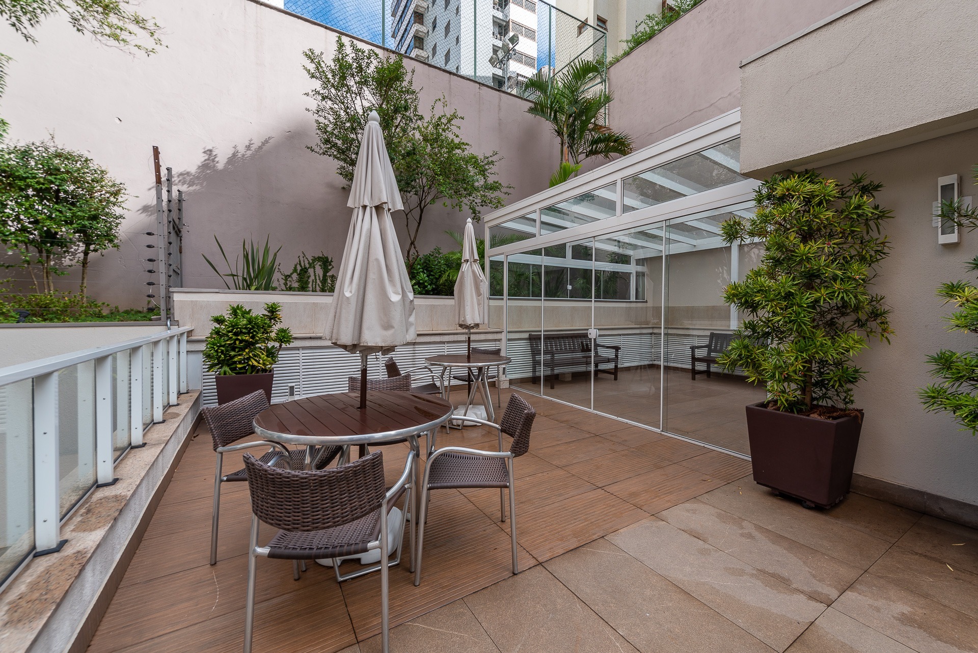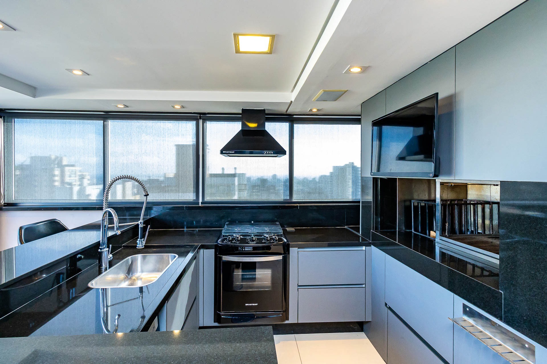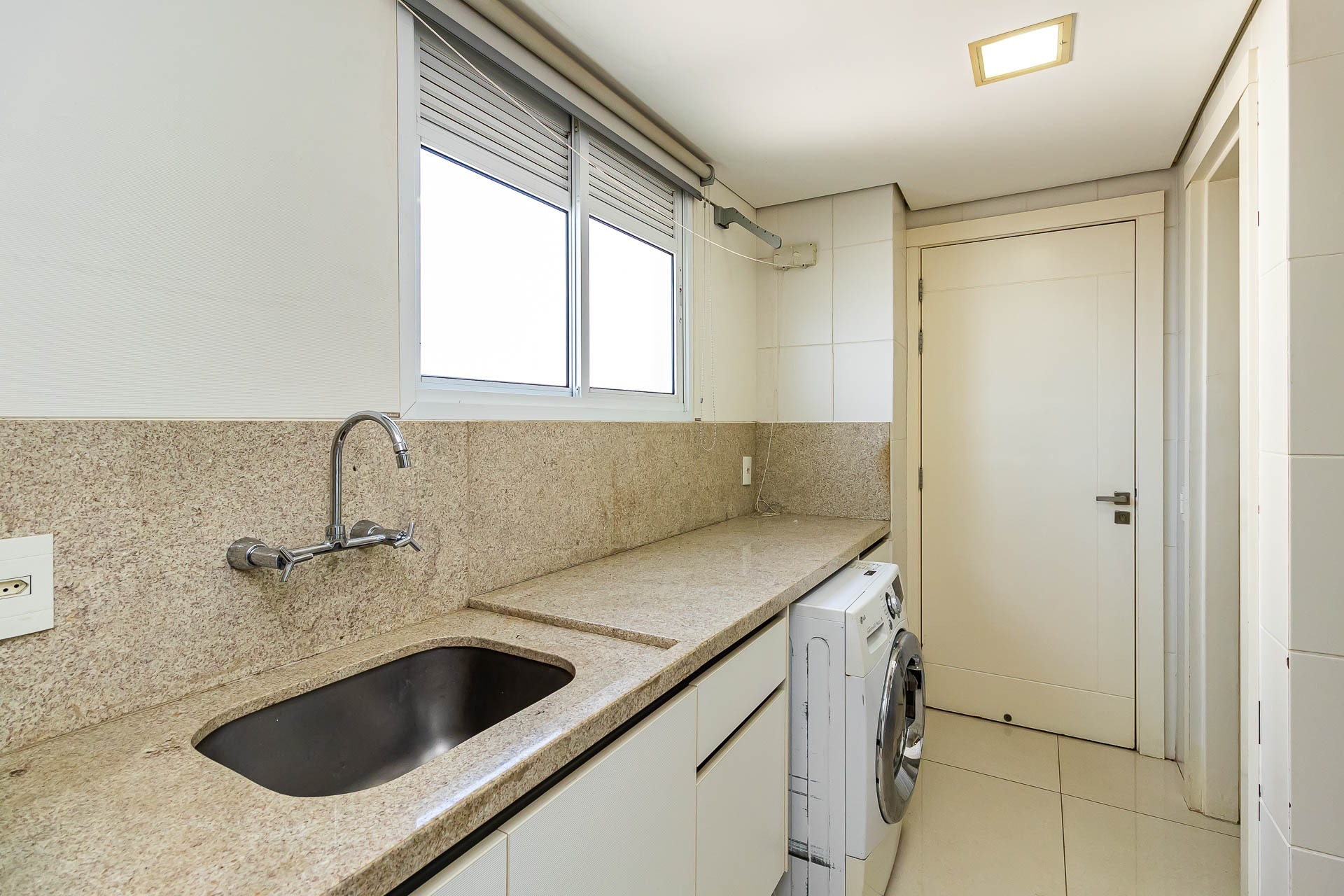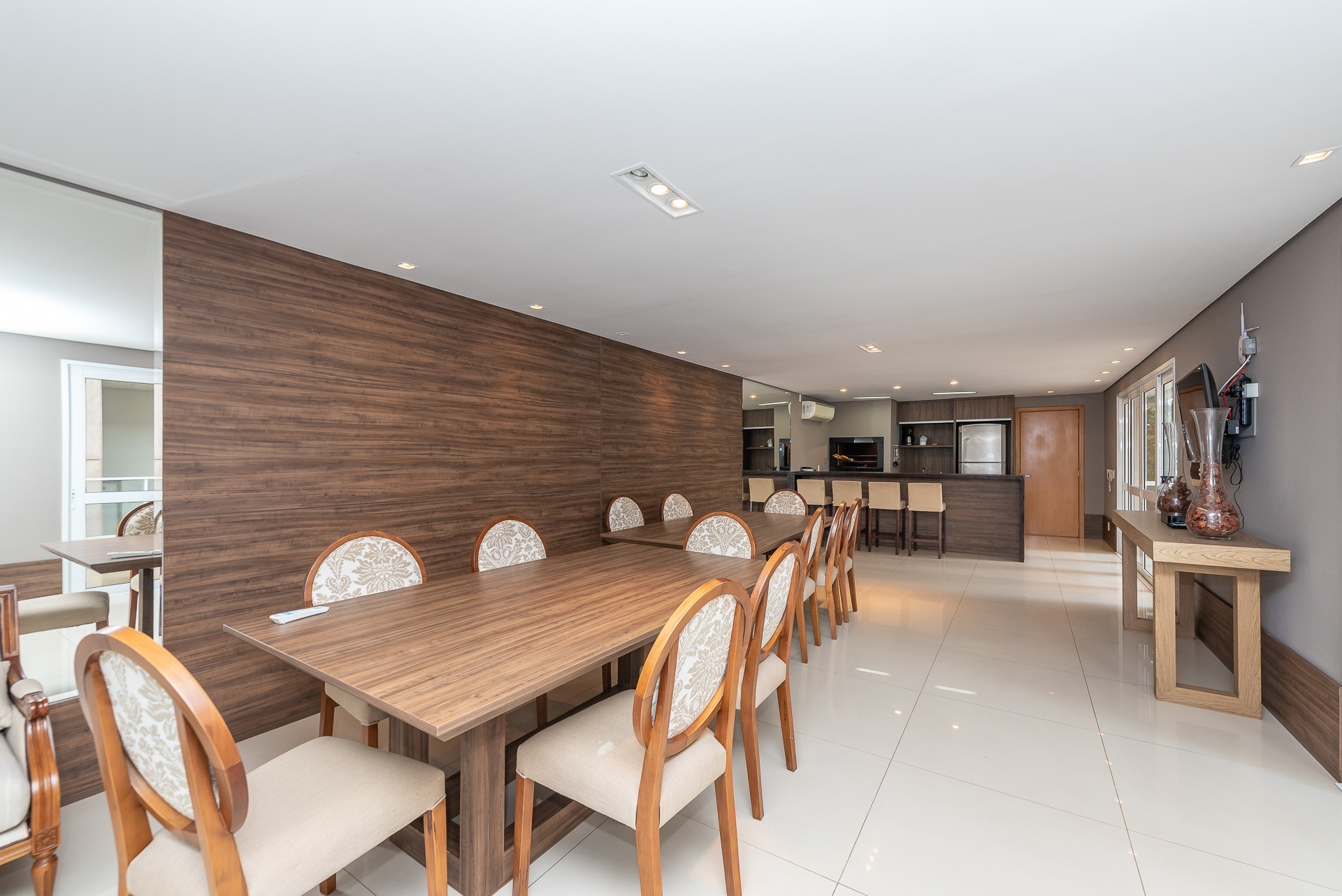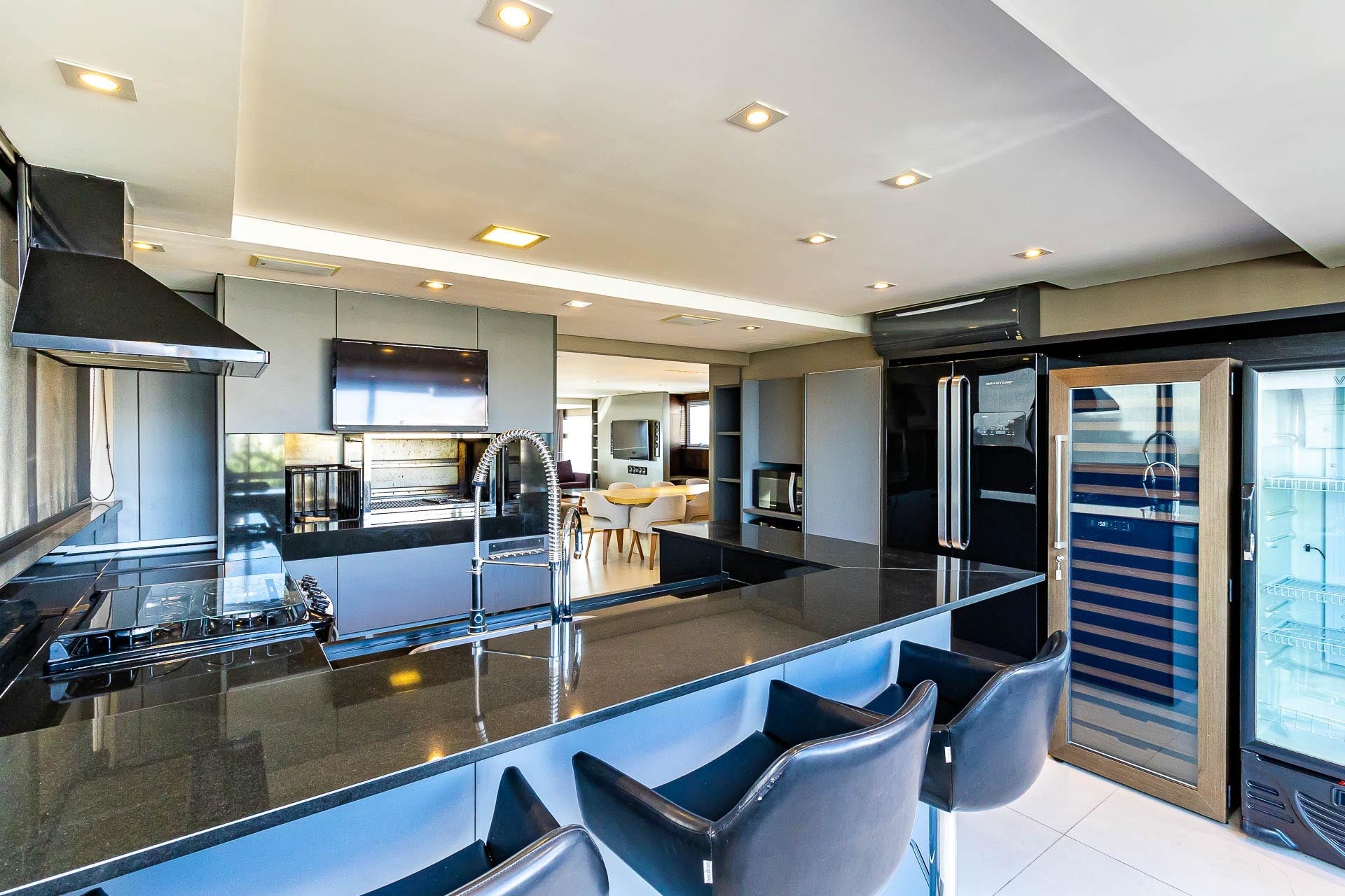 Apartamento para alugar mobiliado com 4 dormitórios, sendo 2 suítes, 179m de área privativa, living com ar condicionado, sacada fechada e ampla com churrasqueira, escrivaninha, cômodas, ventiladores de teto e cortinas, banheiro social com armários, cozinha completa com armários, fogão, geladeira, micro-ondas e coifa e área de serviço.