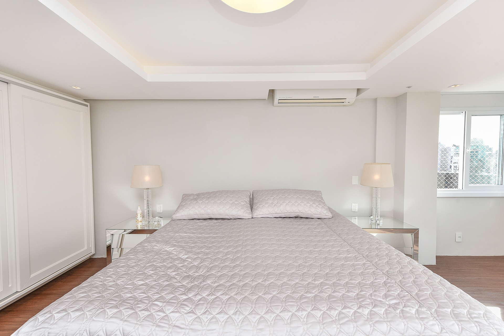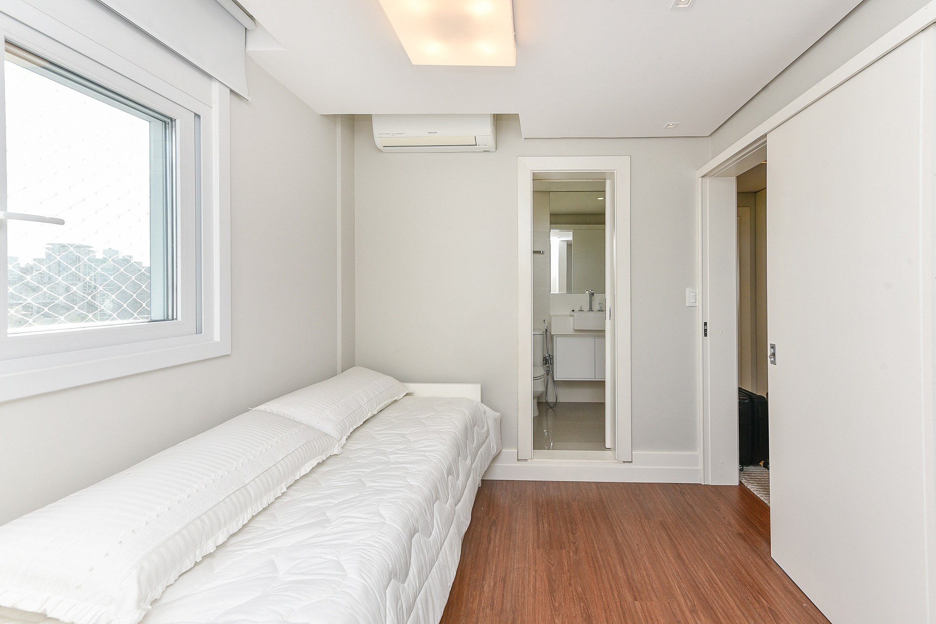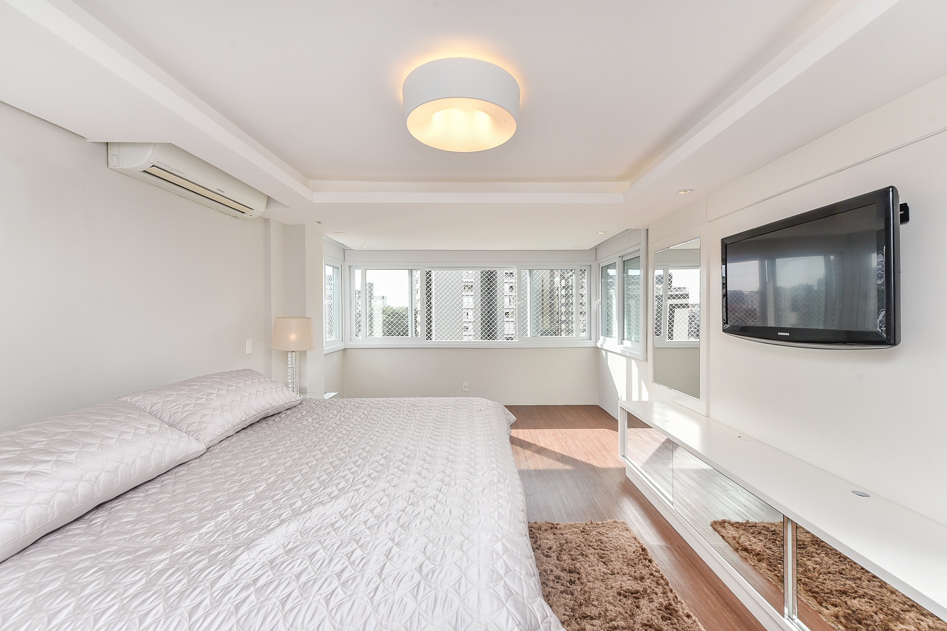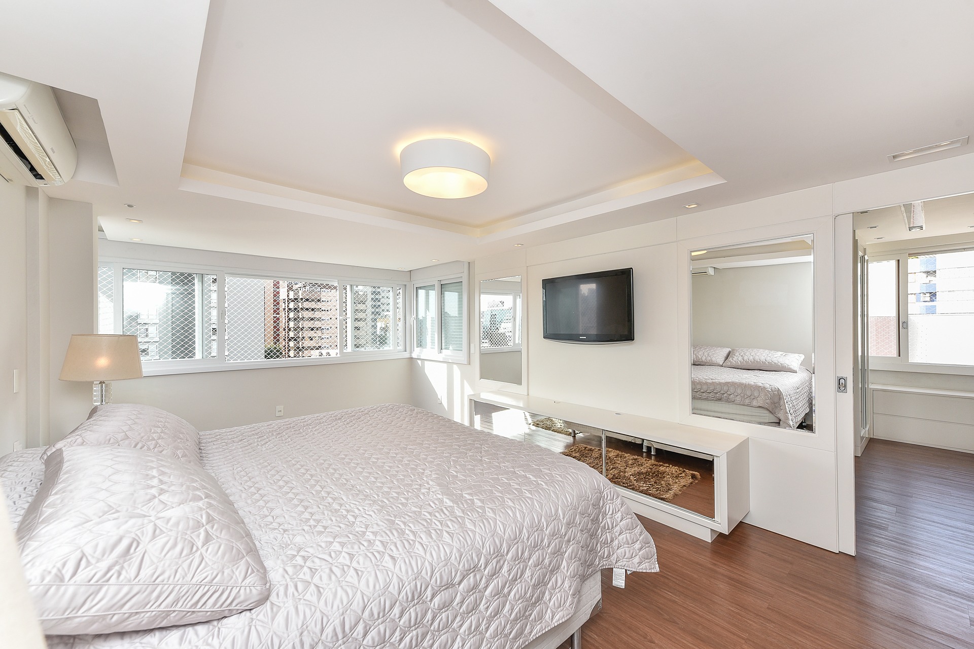 Apartamento para alugar mobiliado com 4 dormitórios, sendo 2 suítes, 179m de área privativa, living com ar condicionado, sacada fechada e ampla com churrasqueira, escrivaninha, cômodas, ventiladores de teto e cortinas, banheiro social com armários, cozinha completa com armários, fogão, geladeira, micro-ondas e coifa e área de serviço.