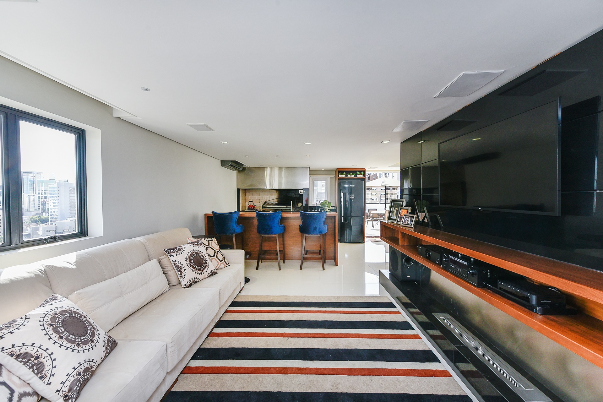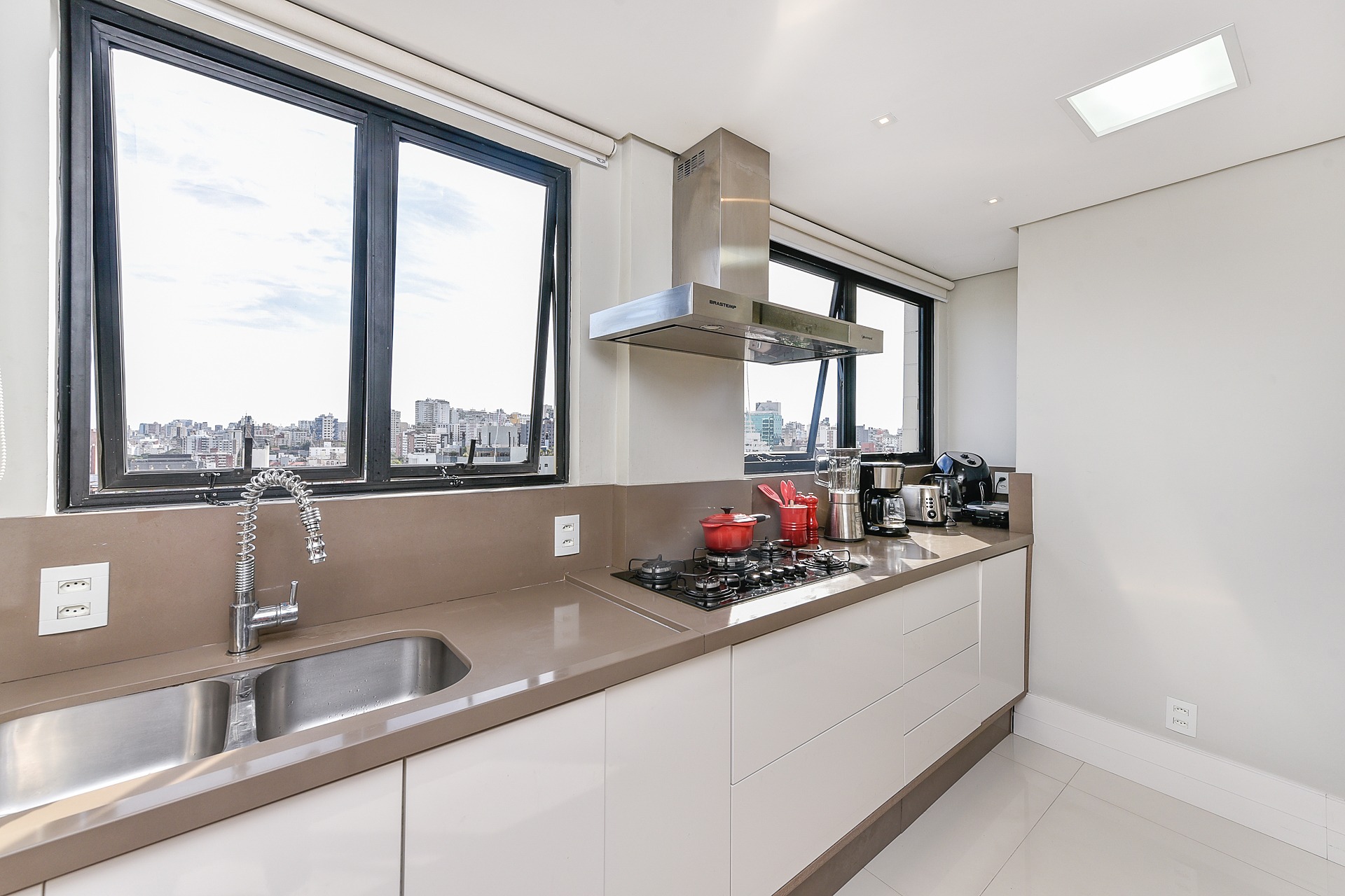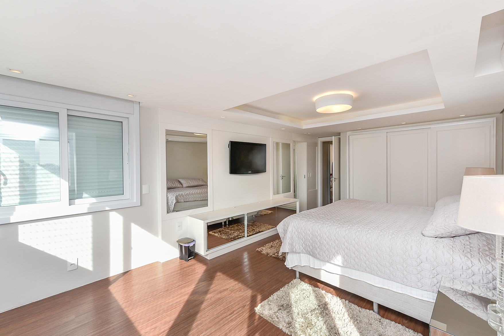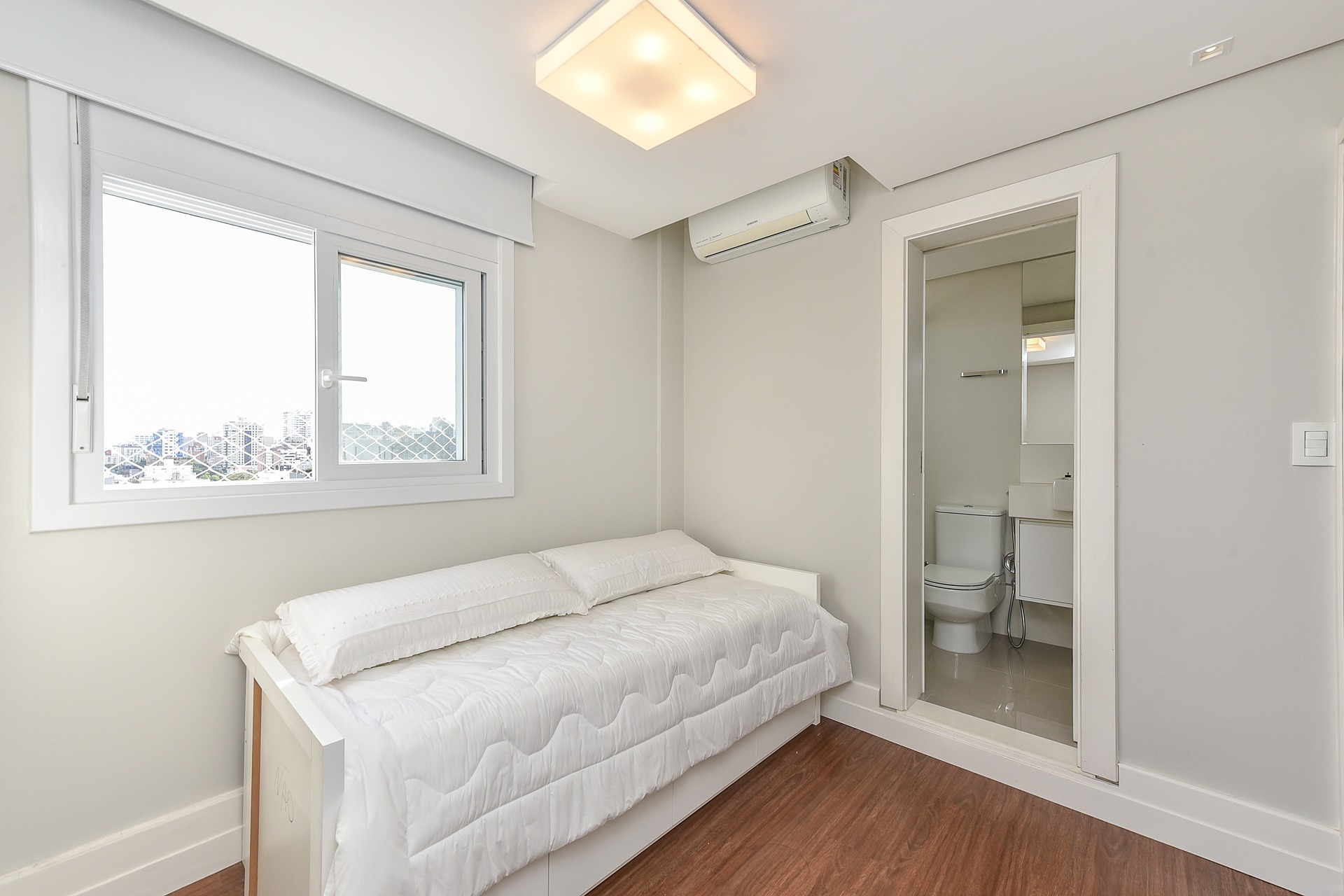Apartamento para alugar mobiliado com 4 dormitórios, sendo 2 suítes, 179m de área privativa, living com ar condicionado, sacada fechada e ampla com churrasqueira, escrivaninha, cômodas, ventiladores de teto e cortinas, banheiro social com armários, cozinha completa com armários, fogão, geladeira, micro-ondas e coifa e área de serviço.
