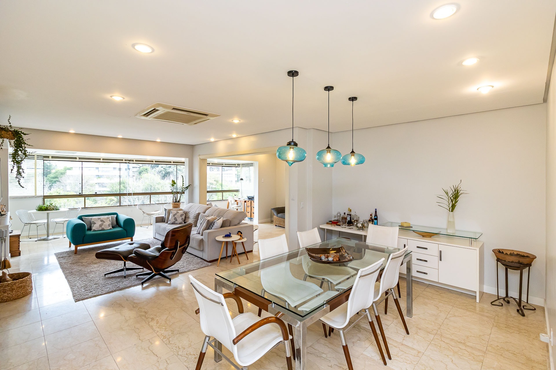 Apartamento mobiliado de 237 m², 3 dormitórios, 3 suítes, 1 suíte máster com closet e hidro, living 3 ambientes com sacada, gabinete, lareira, lavabo, cozinha com churrasqueira, dependência, área de serviço com entrada independente, depósito e 3 vagas de garagens.