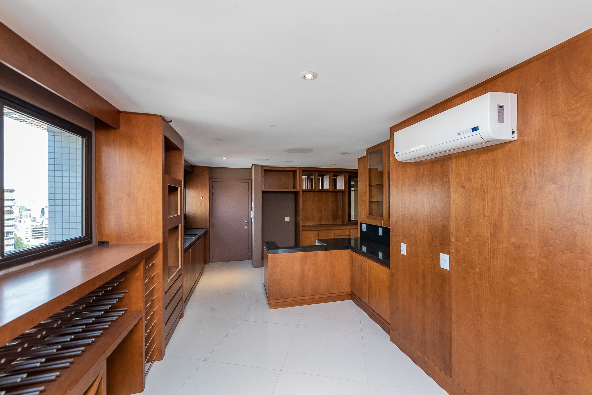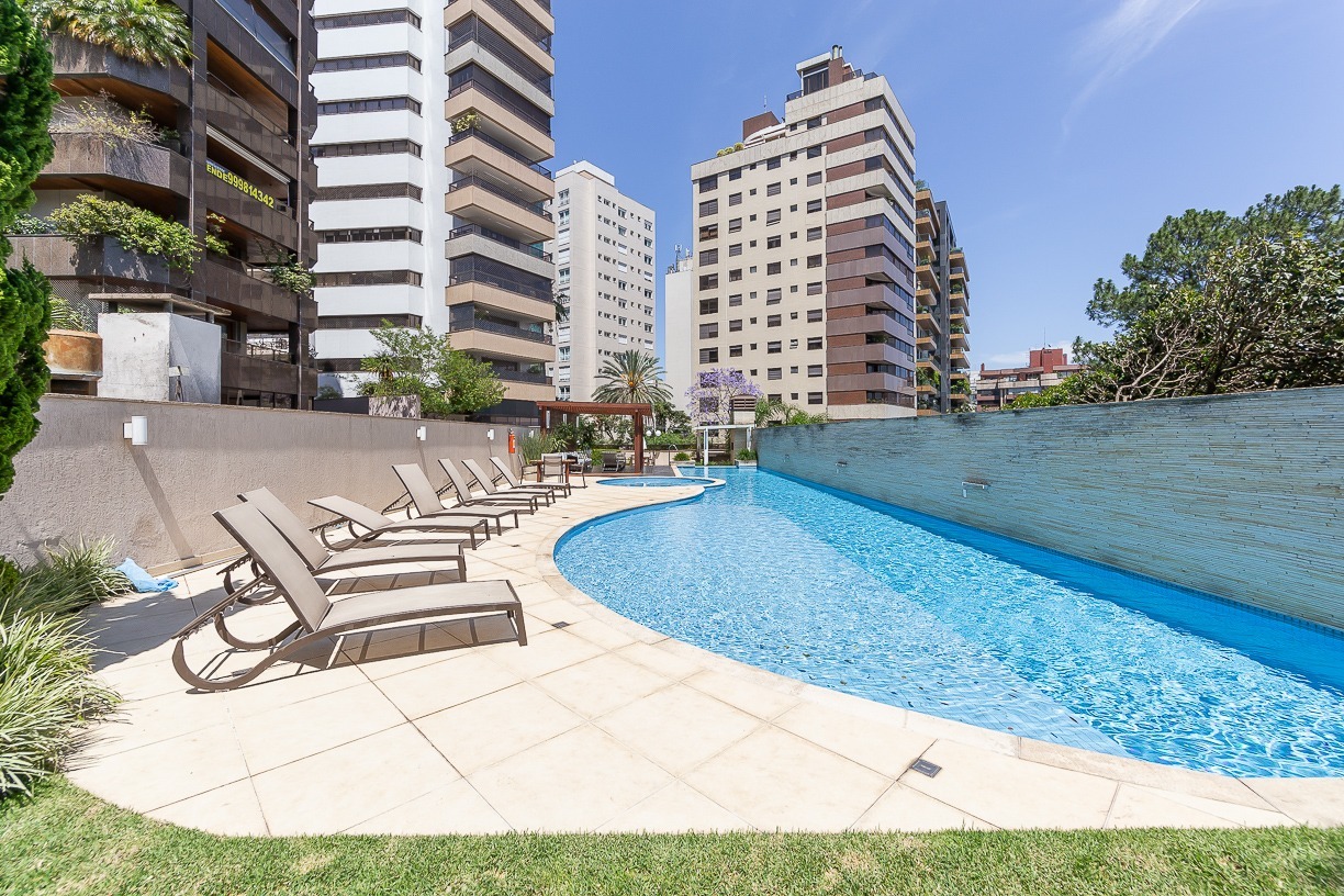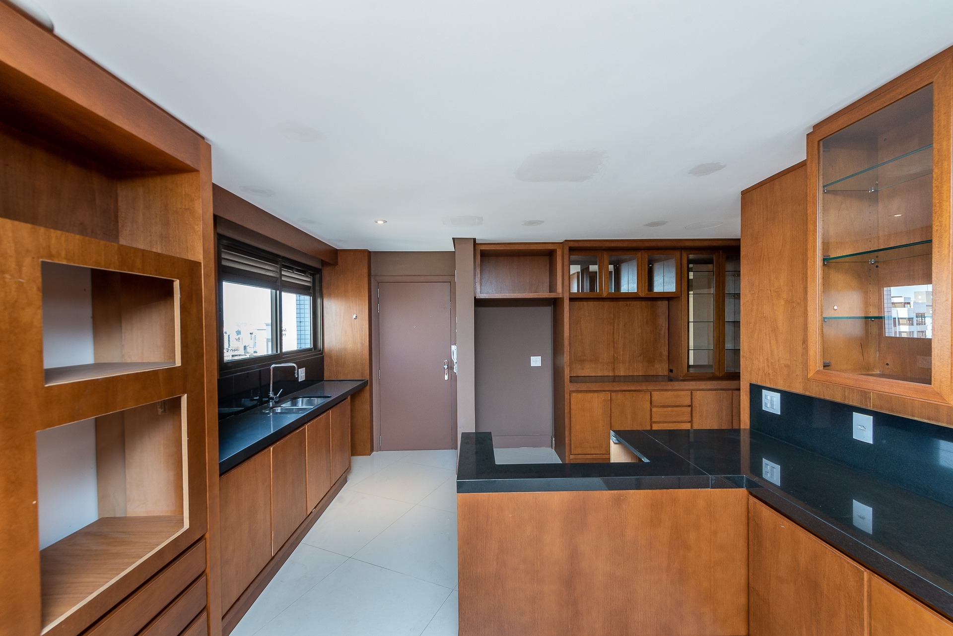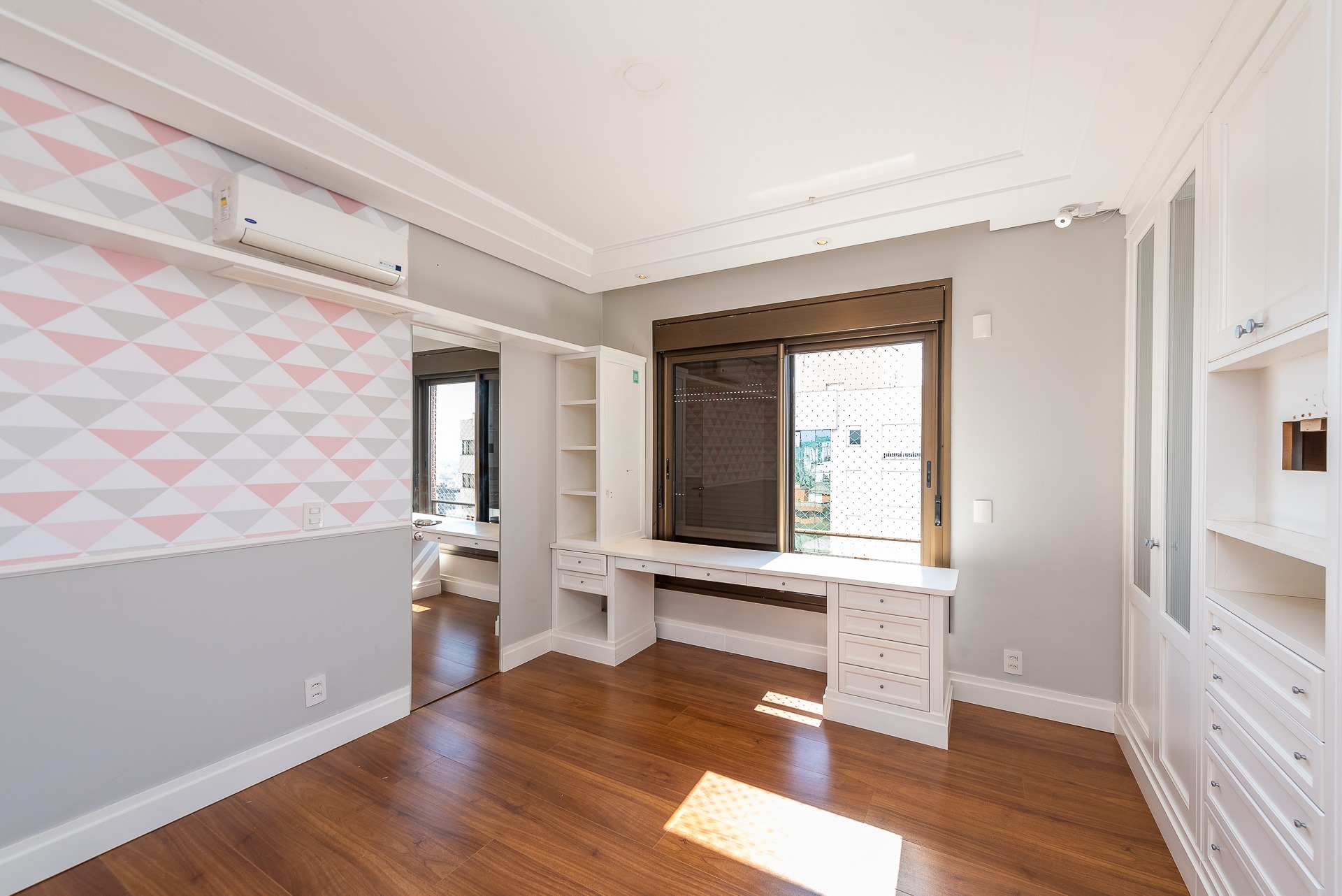 Apartamento para alugar mobiliado com 4 dormitórios, sendo 2 suítes, 179m de área privativa, living com ar condicionado, sacada fechada e ampla com churrasqueira, escrivaninha, cômodas, ventiladores de teto e cortinas, banheiro social com armários, cozinha completa com armários, fogão, geladeira, micro-ondas e coifa e área de serviço.