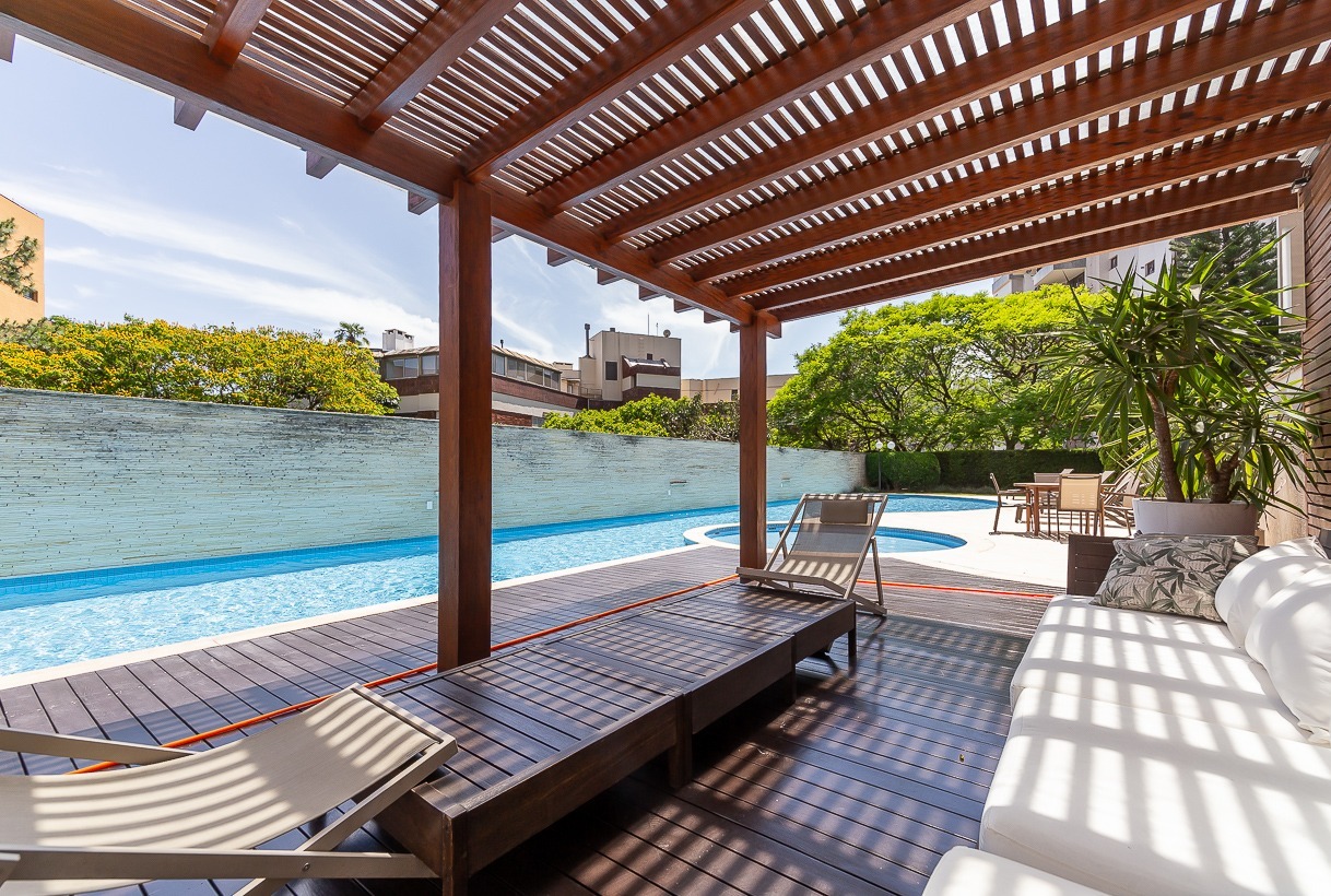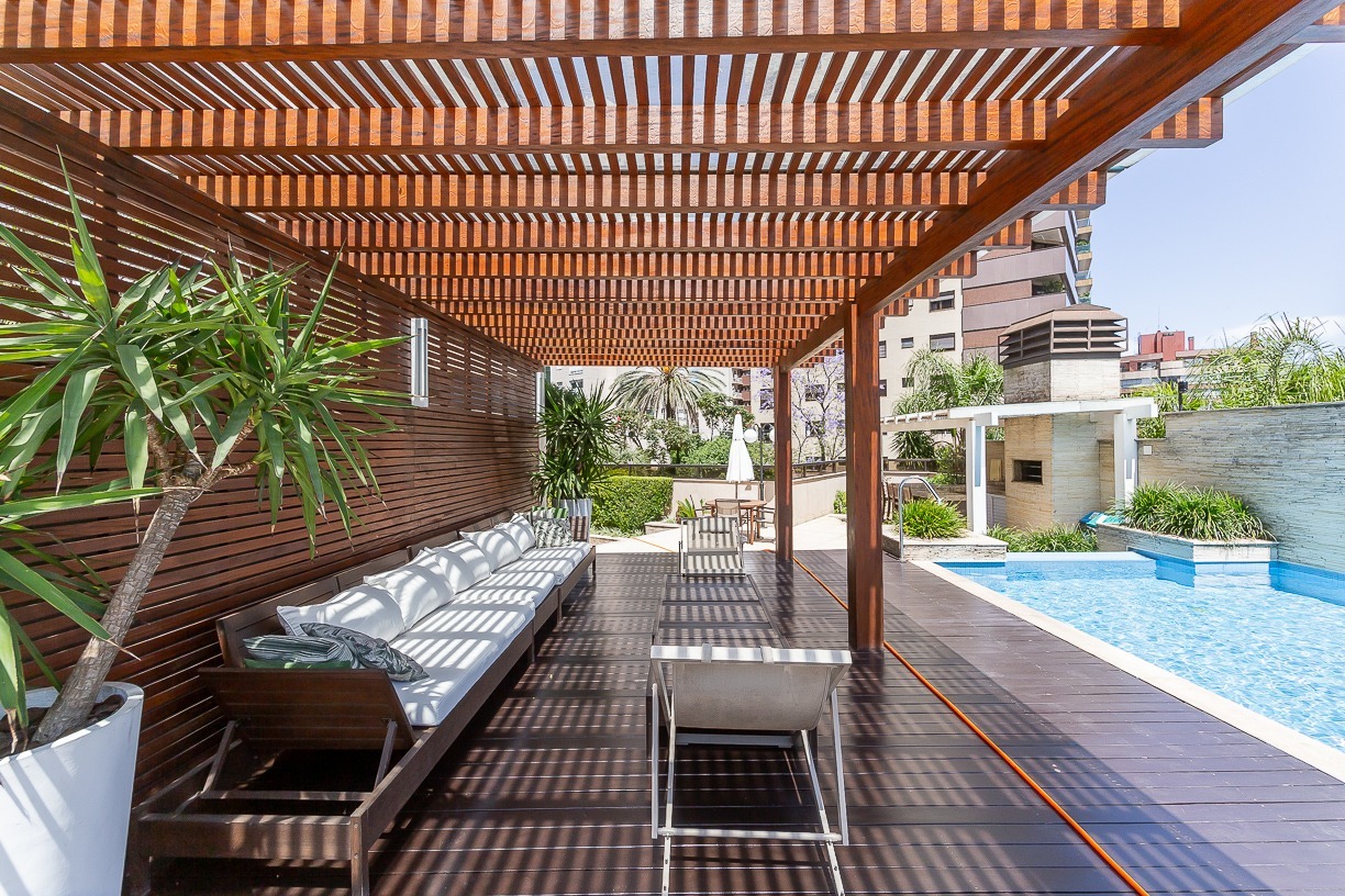 No pavimento superior, espera para piscina, jardim e um belíssimo pergolado.