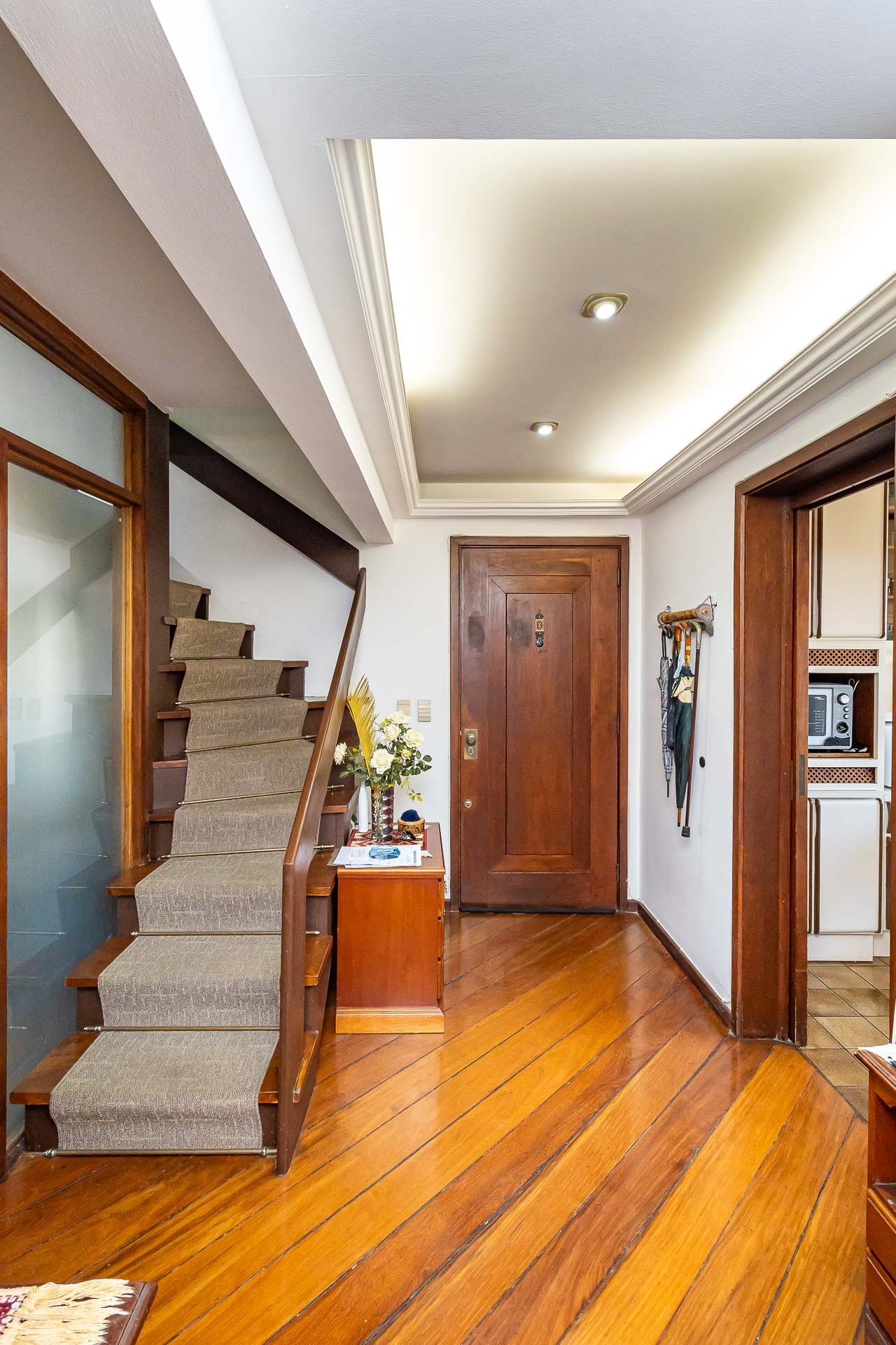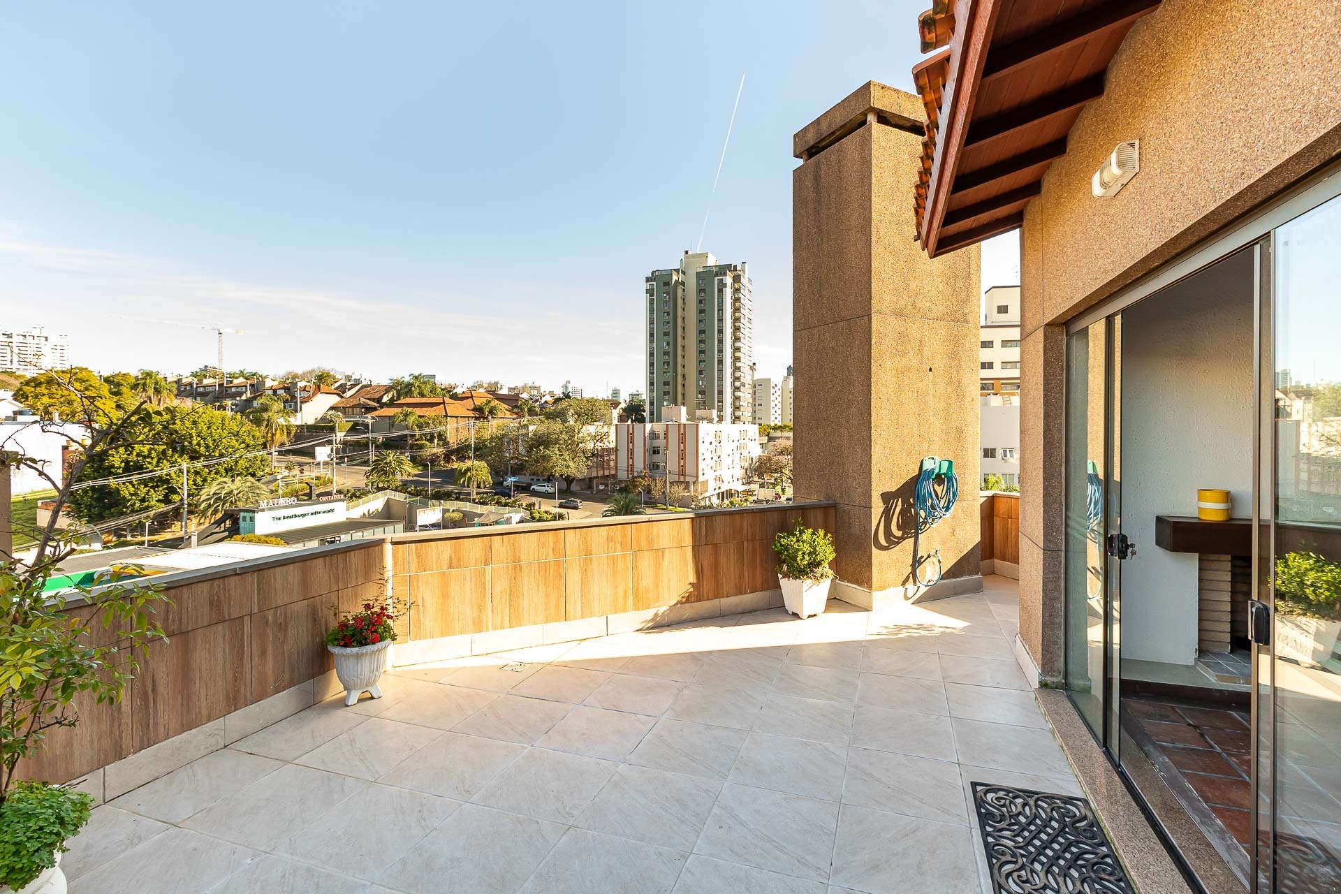 Cobertura exclusiva no bairro Moinhos de Vento, com 290m² de área privativa, três dormitórios (sendo uma suíte) e uma vista panorâmica deslumbrante da cidade. No andar inferior, encontram-se os dormitórios, uma suíte, sala de jantar, living social, banheiro social, lavabo, cozinha espaçosa e área de serviço, todos com excelente orientação solar Oeste, garantindo ambientes amplos e iluminados.