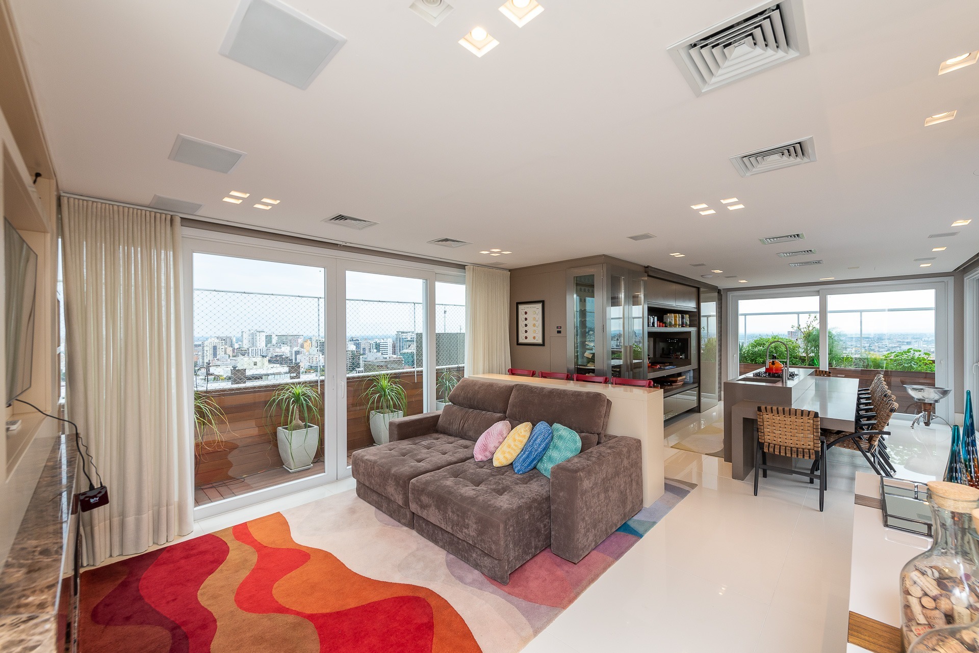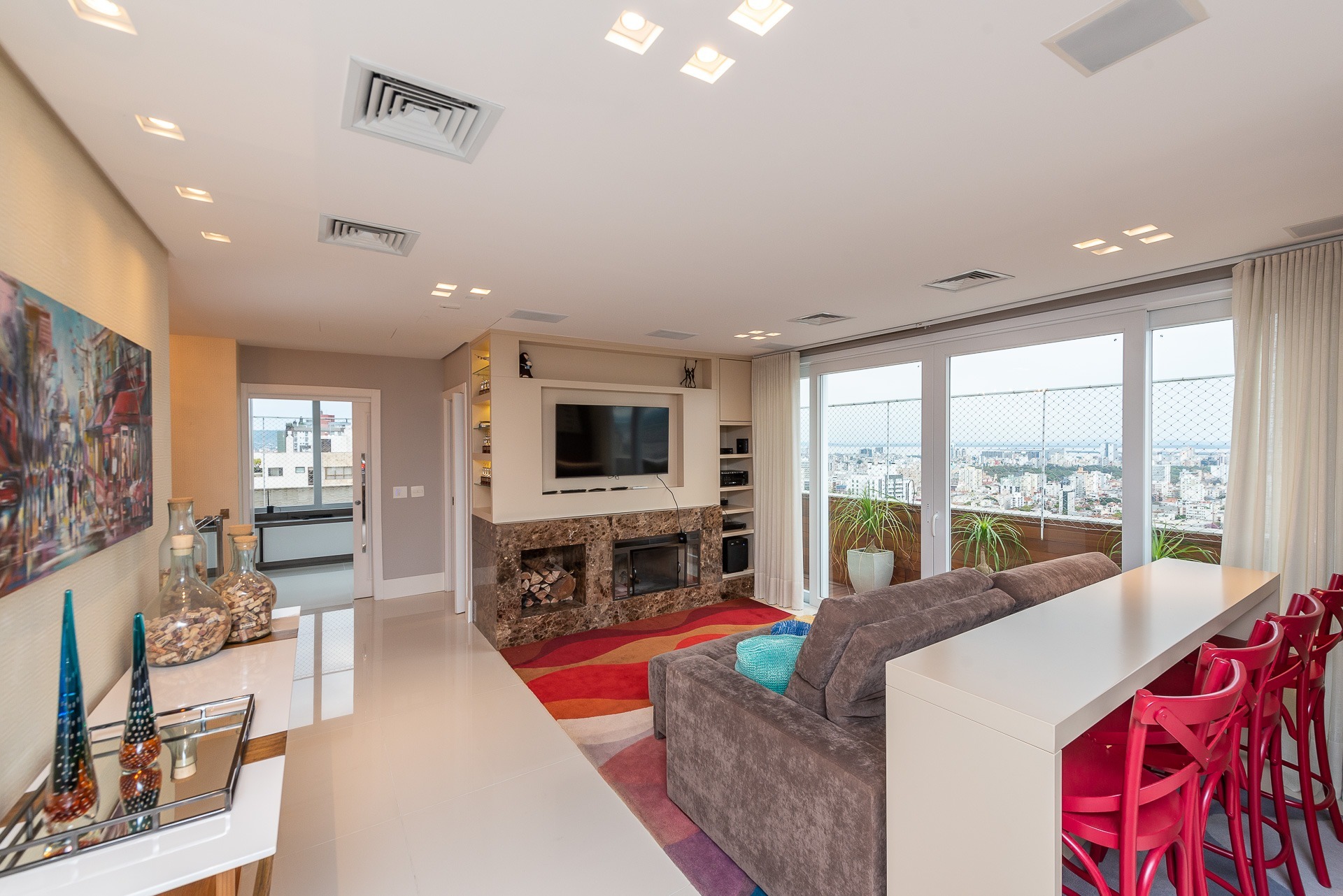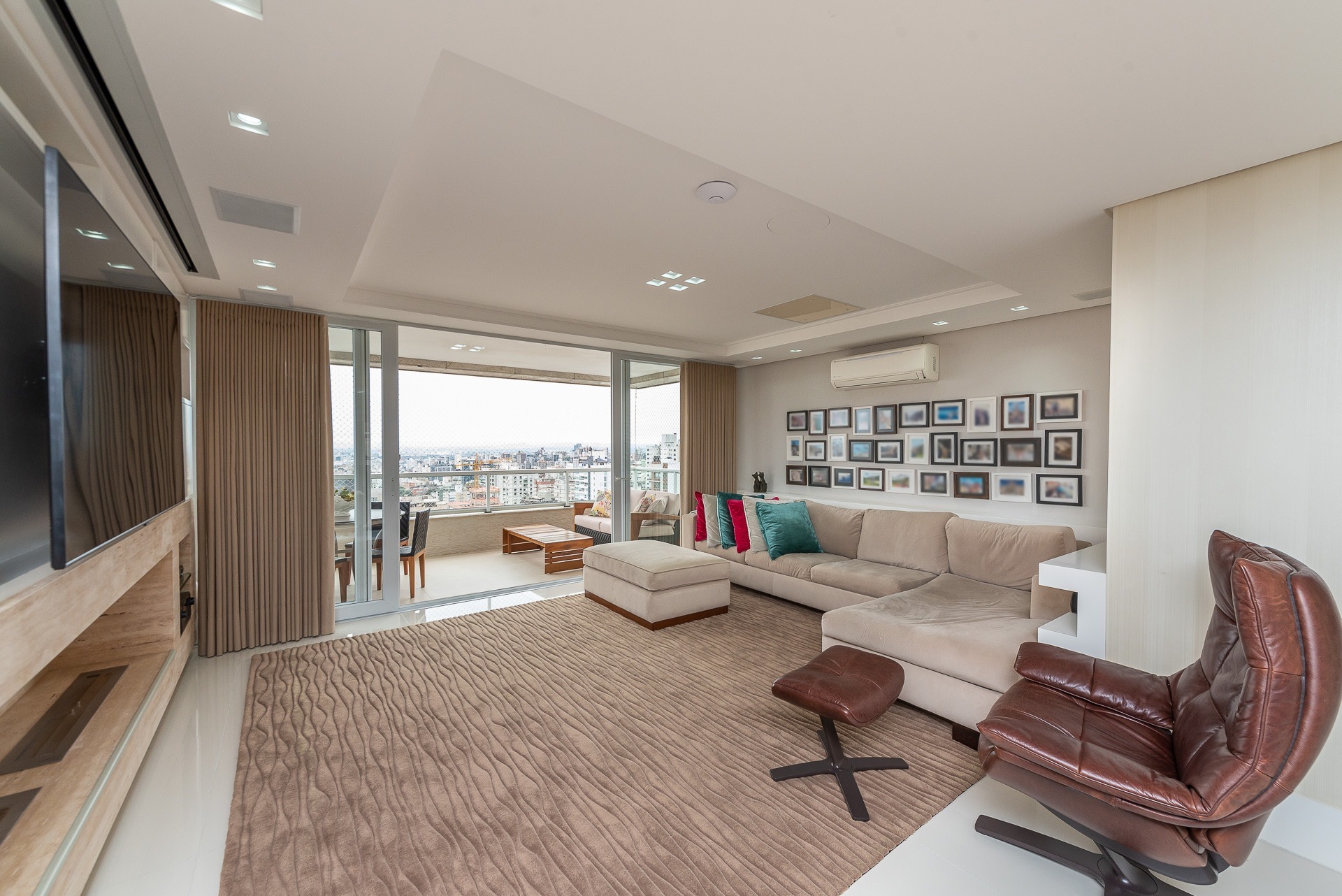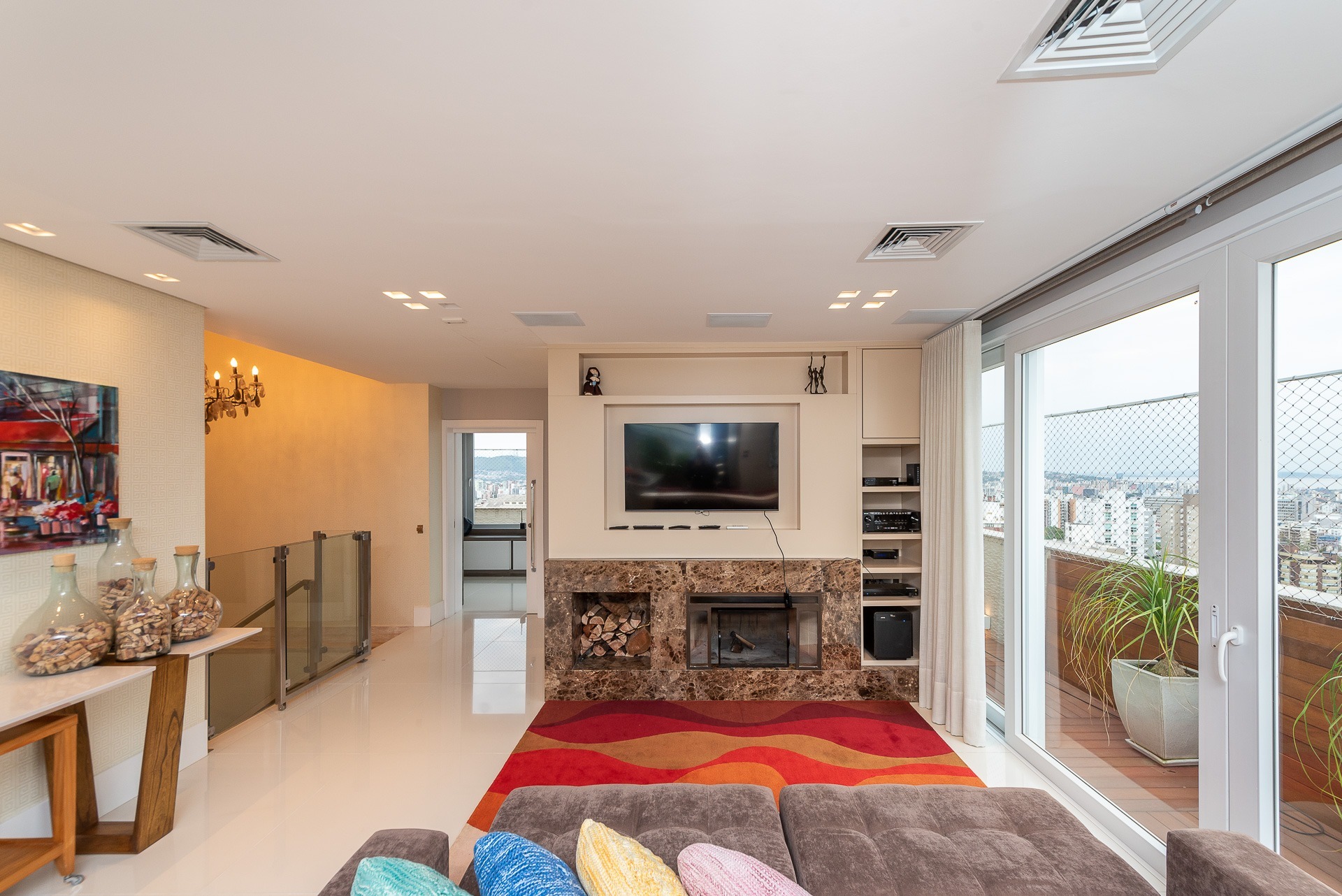 Apartamento possui um enorme living para 3 ambientes super iluminado e arejado, possui uma linda vista, lavabo, lareira, espaço gourmet com churrasqueira que da acesso ao terraço que conta com uma piscina aquecida.