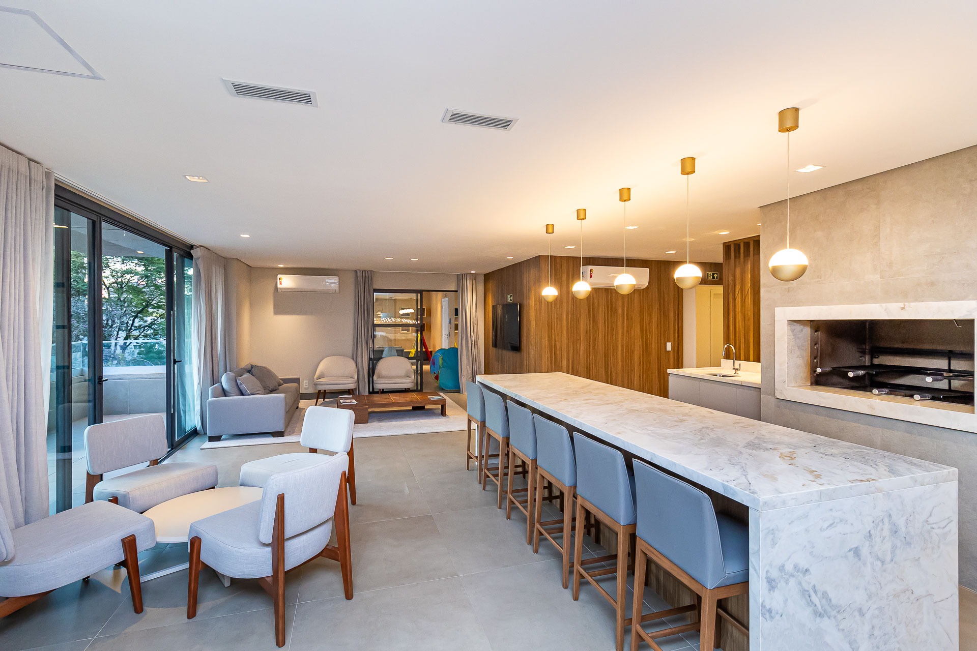 Apartamento possui um enorme living para 3 ambientes super iluminado e arejado, possui uma linda vista, lavabo, lareira, espaço gourmet com churrasqueira que da acesso ao terraço que conta com uma piscina aquecida.