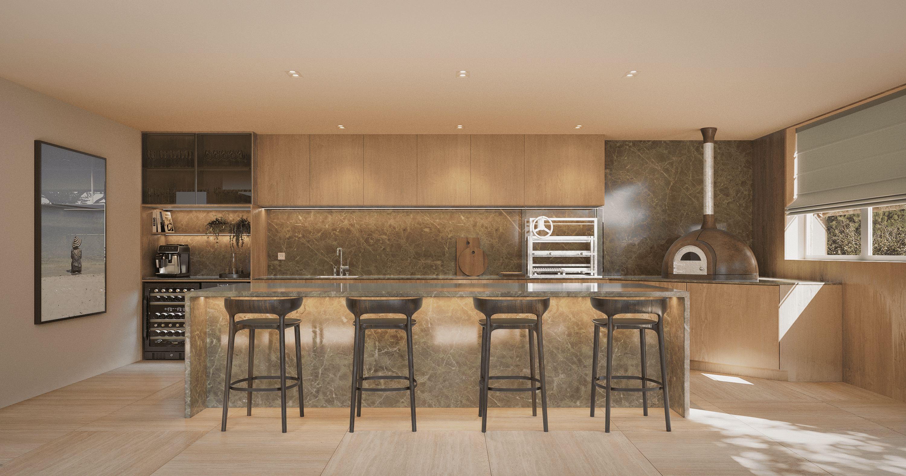 O exterior convida a momentos de bem-estar ao longo de todo o ano, com piscina aquecida com cobertura retrátil, zona de hidromassagem e terraços que prolongam a vivência da casa até ao jardim. Materiais nobres criam uma estética intemporal, onde elegância e o conforto se encontram.