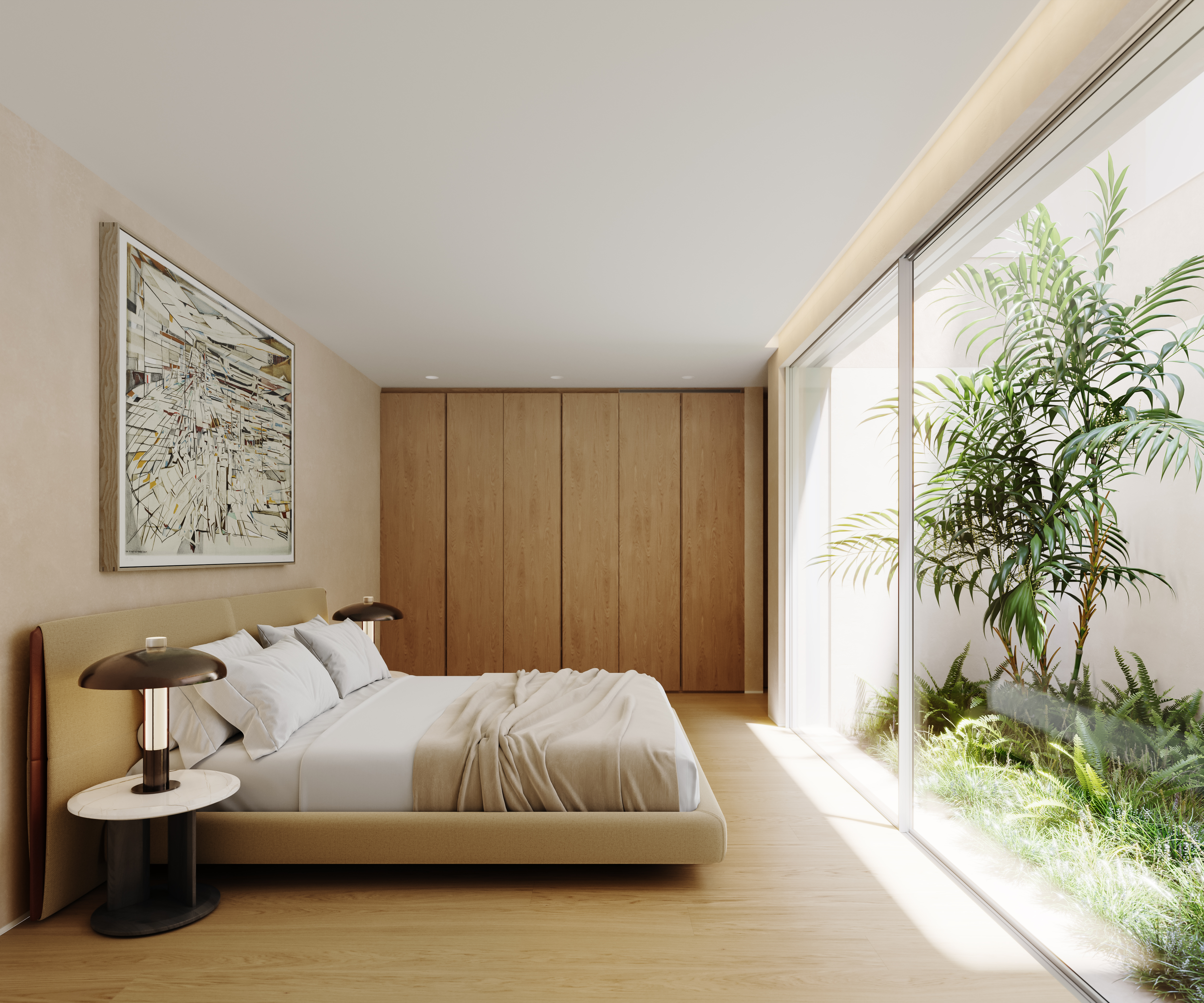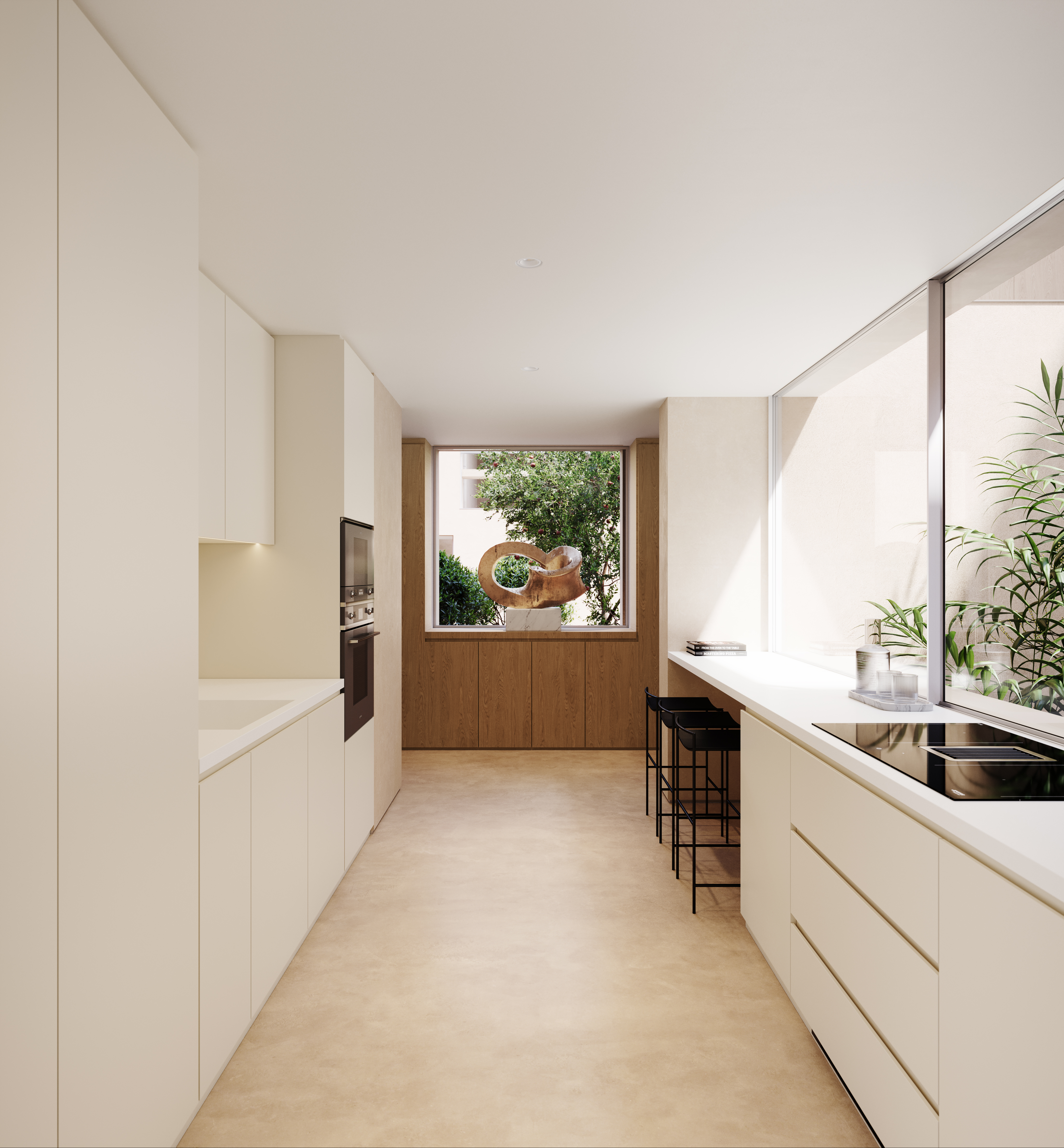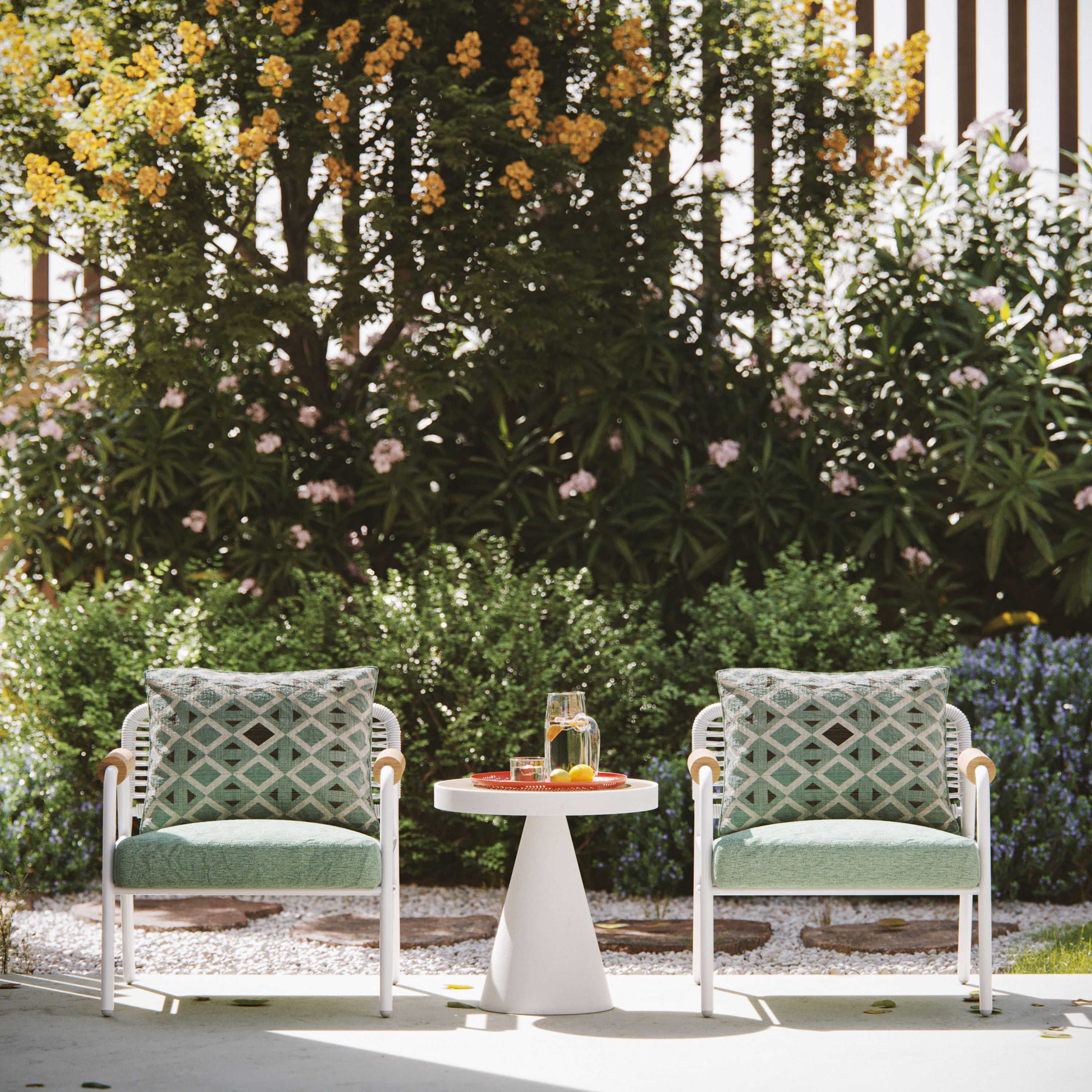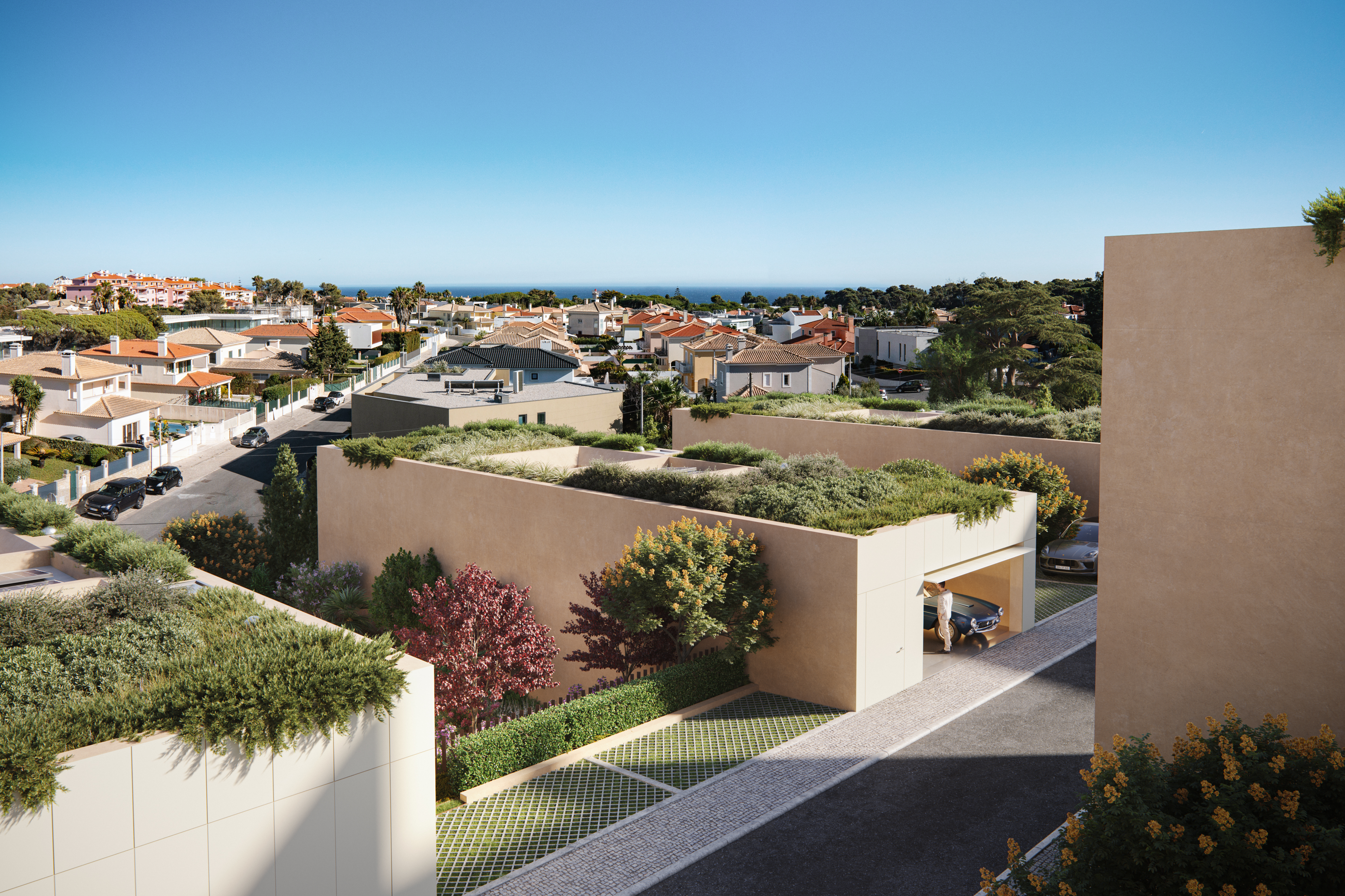 Cada moradia dispõe de uma garagem com pré-instalação para carregamento elétrico, além de mais dois lugares de estacionamento exteriores. O condomínio conta ainda com uma área de jardim comum, proporcionando um ambiente natural e exclusivo.
