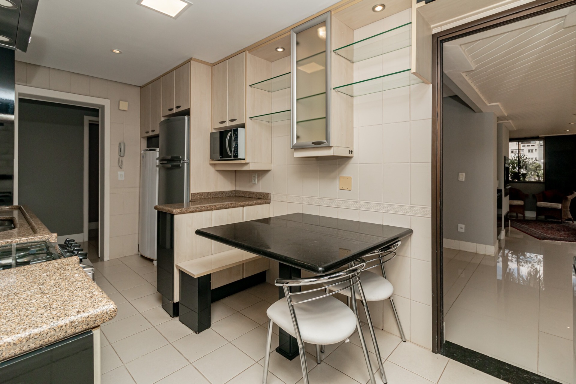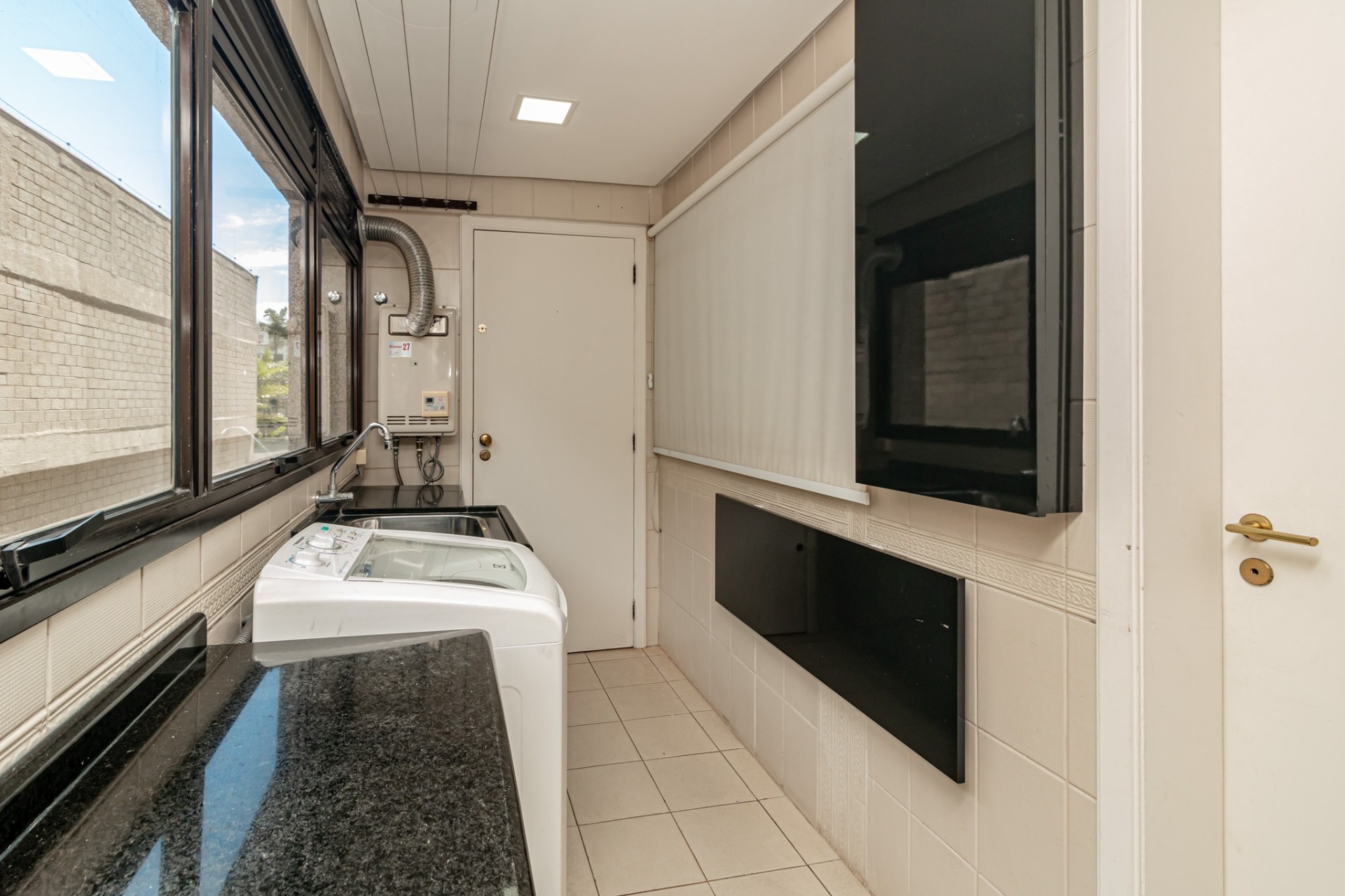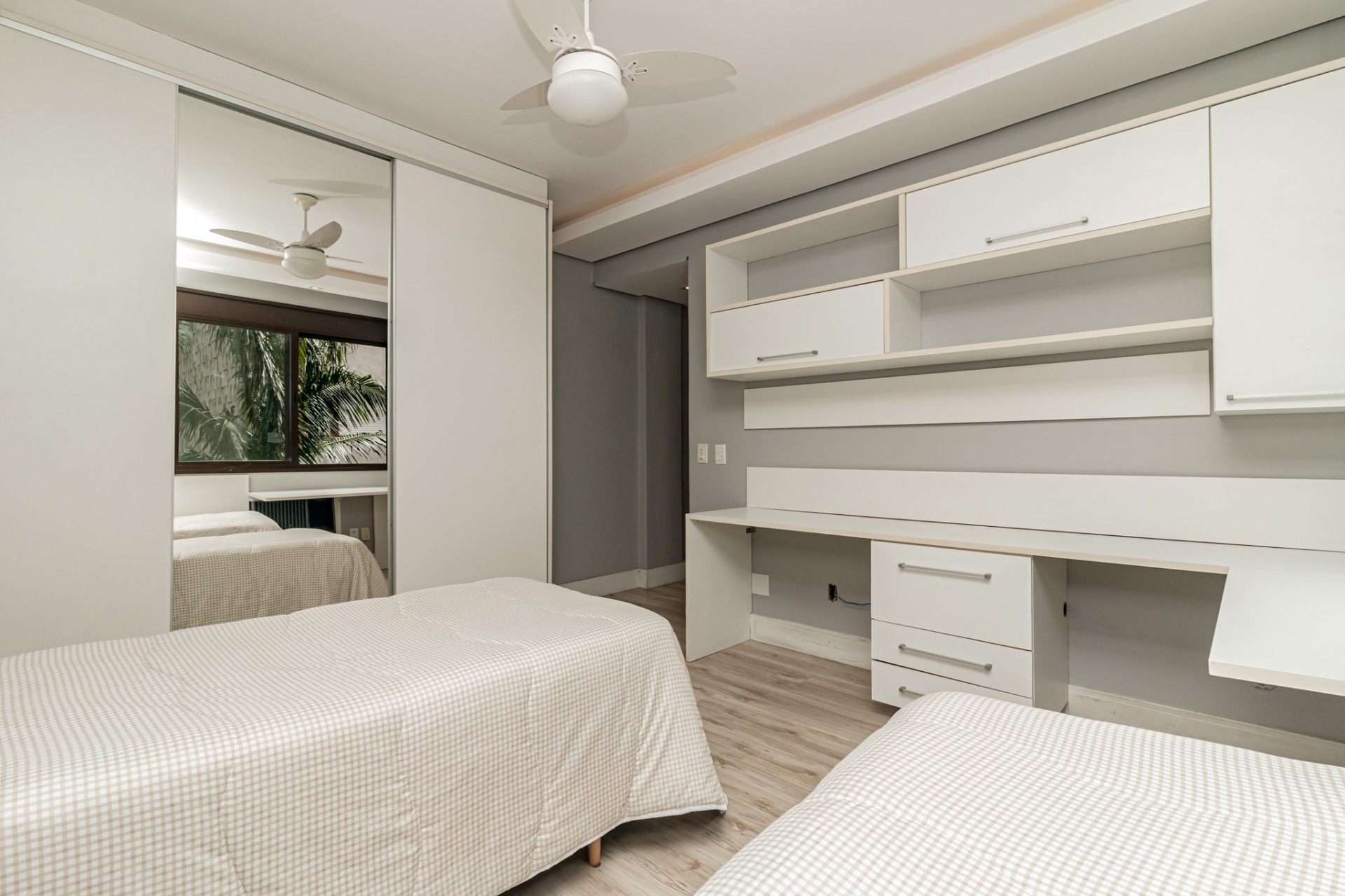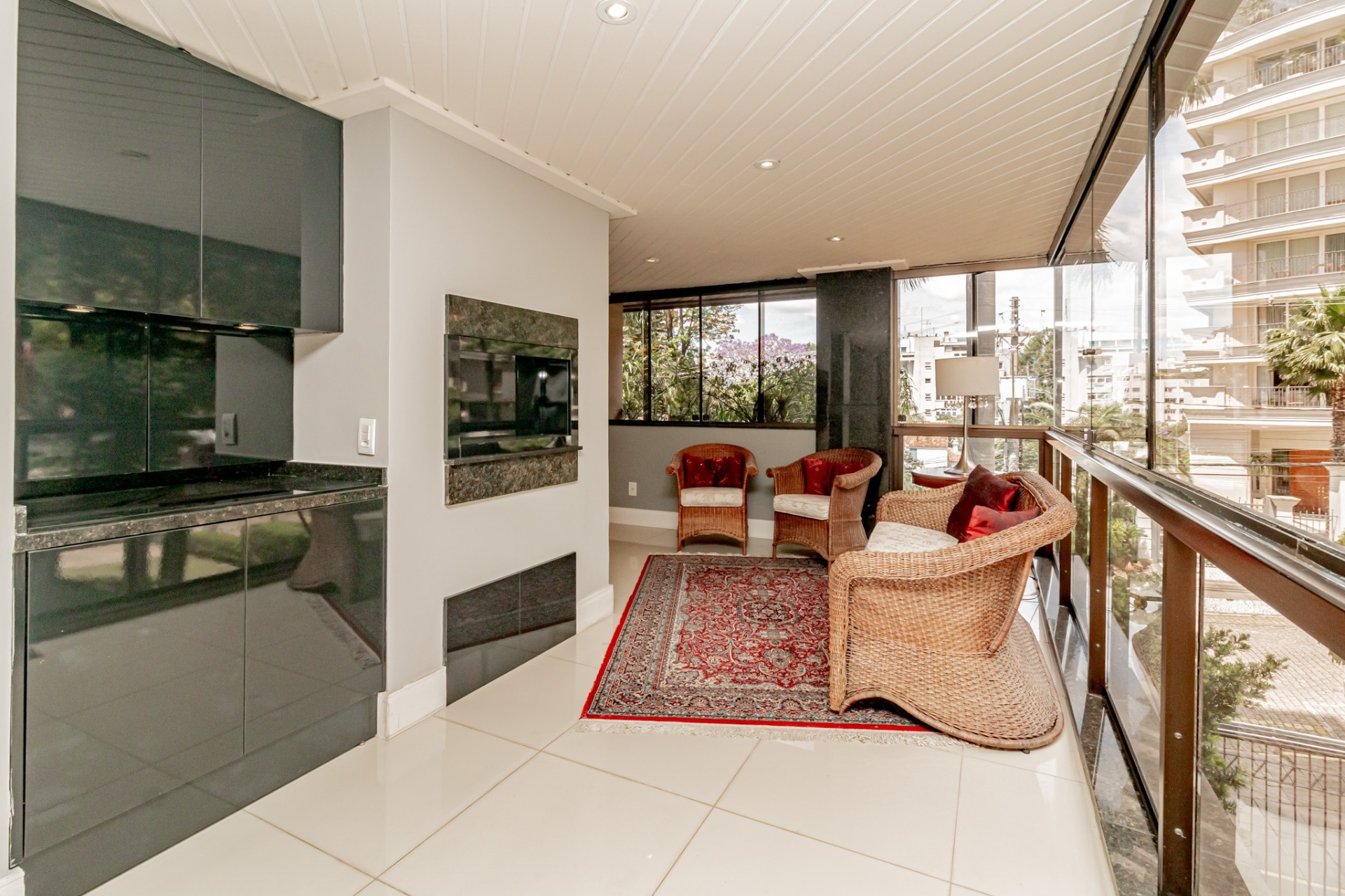Apartamento para alugar mobiliado com 4 dormitórios, sendo 2 suítes, 179m de área privativa, living com ar condicionado, sacada fechada e ampla com churrasqueira, escrivaninha, cômodas, ventiladores de teto e cortinas, banheiro social com armários, cozinha completa com armários, fogão, geladeira, micro-ondas e coifa e área de serviço.