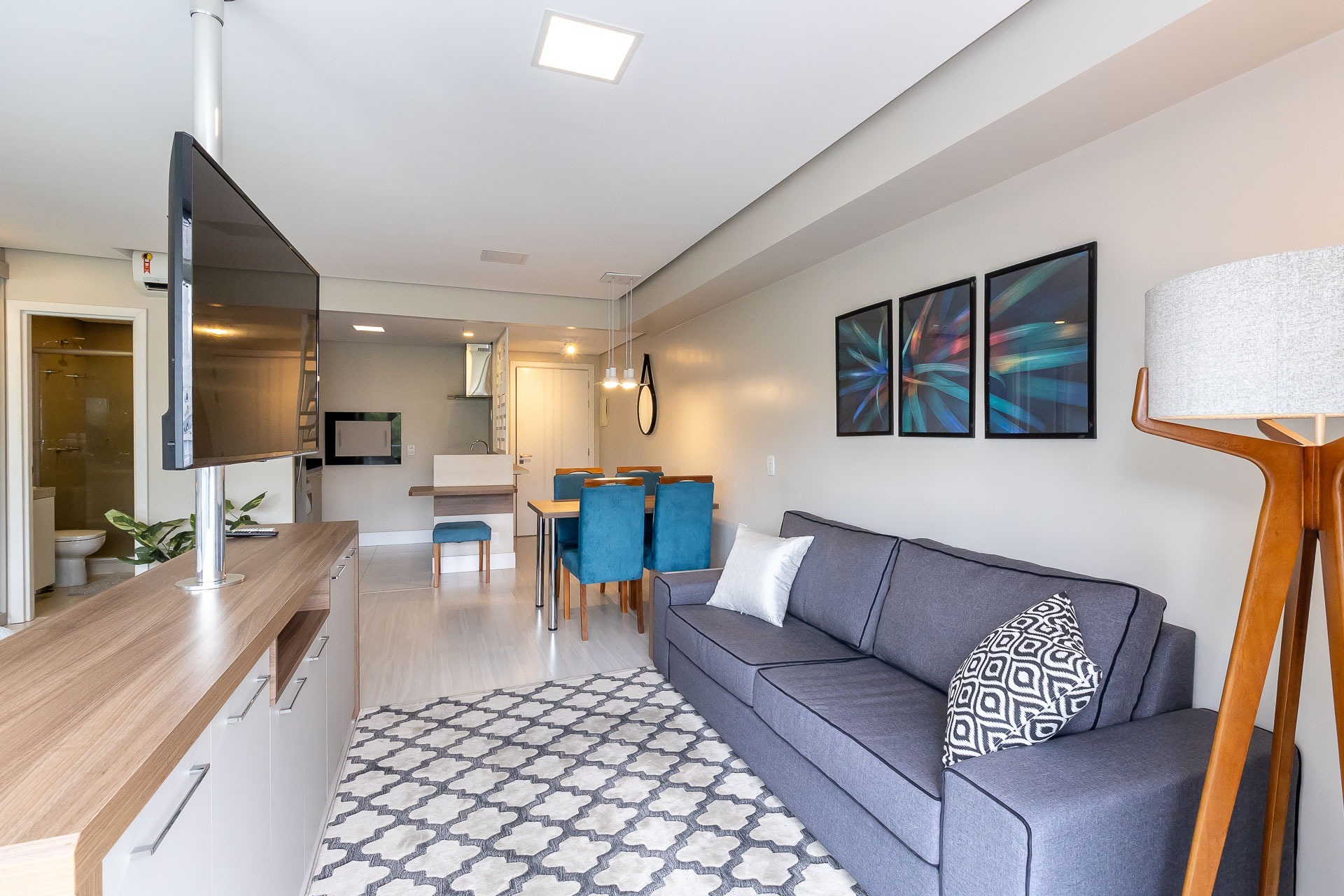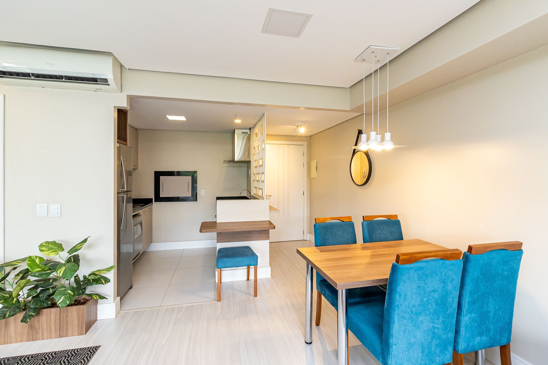 Apartamento finamente mobiliado de 1 dormitório com 44m² de área privativa,1vaga de garagem. Dispõem de uma suíte, living integrado a sala e cozinha que dispõem de churrasqueira e lavanderia, amplas aberturas proporcionando amplitude com uma linda vista, ambientes com ótima iluminação e ventilação natural. Prédio com infra como piscina, espaço fitness salão de festas e brinquedoteca. Localização p...