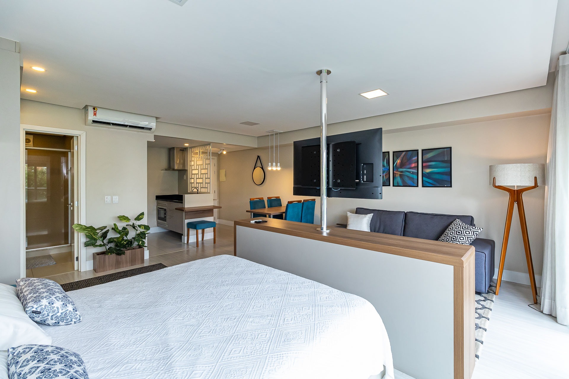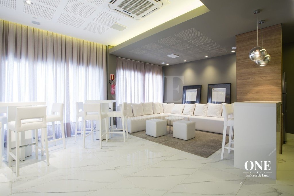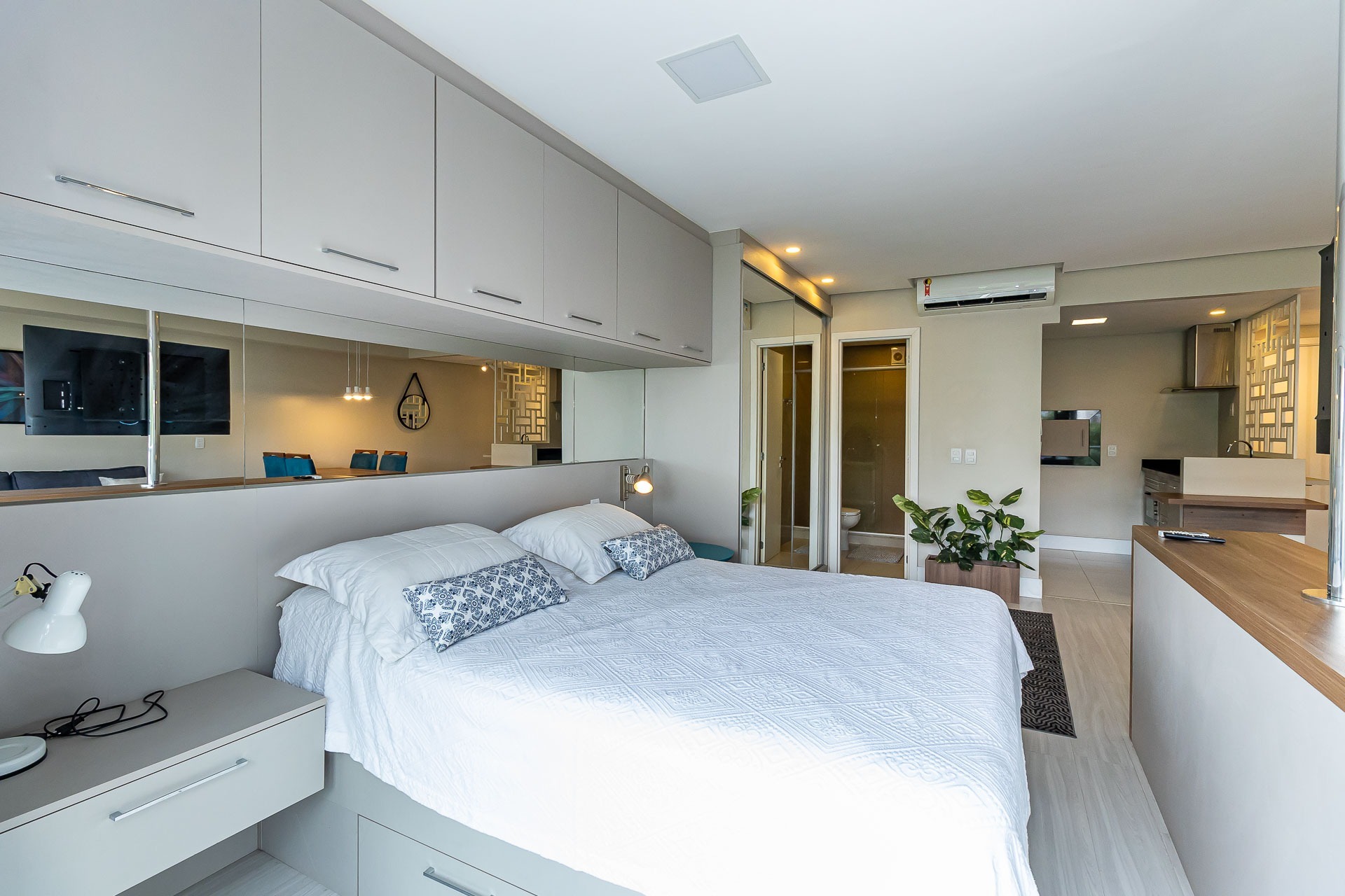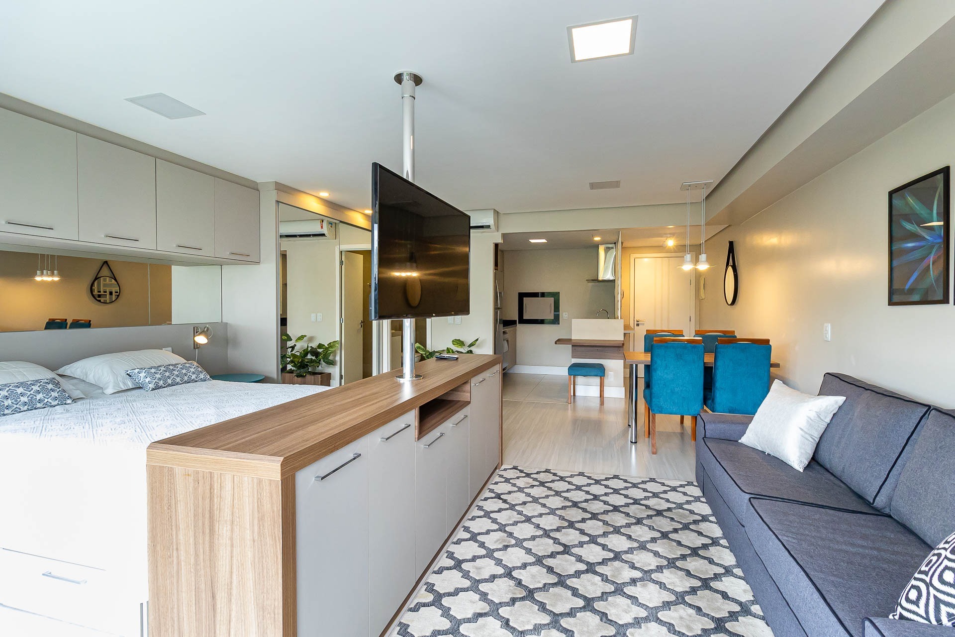 Studio, em andar intermediário, com 43m² privativos. Sala mobiliada, cozinha americana com armários . O dormitório possui armários embutidos, além de receber sol, o que gera aquecimento natural ao ambiente. O condomínio possui infraestrutura completa com portaria 12h, jardim, espaço gourmet, espaço lounge, sala de cinema, serviço de enfermagem 24h, sala multiuso, piscina aquecida, espaço fitne...